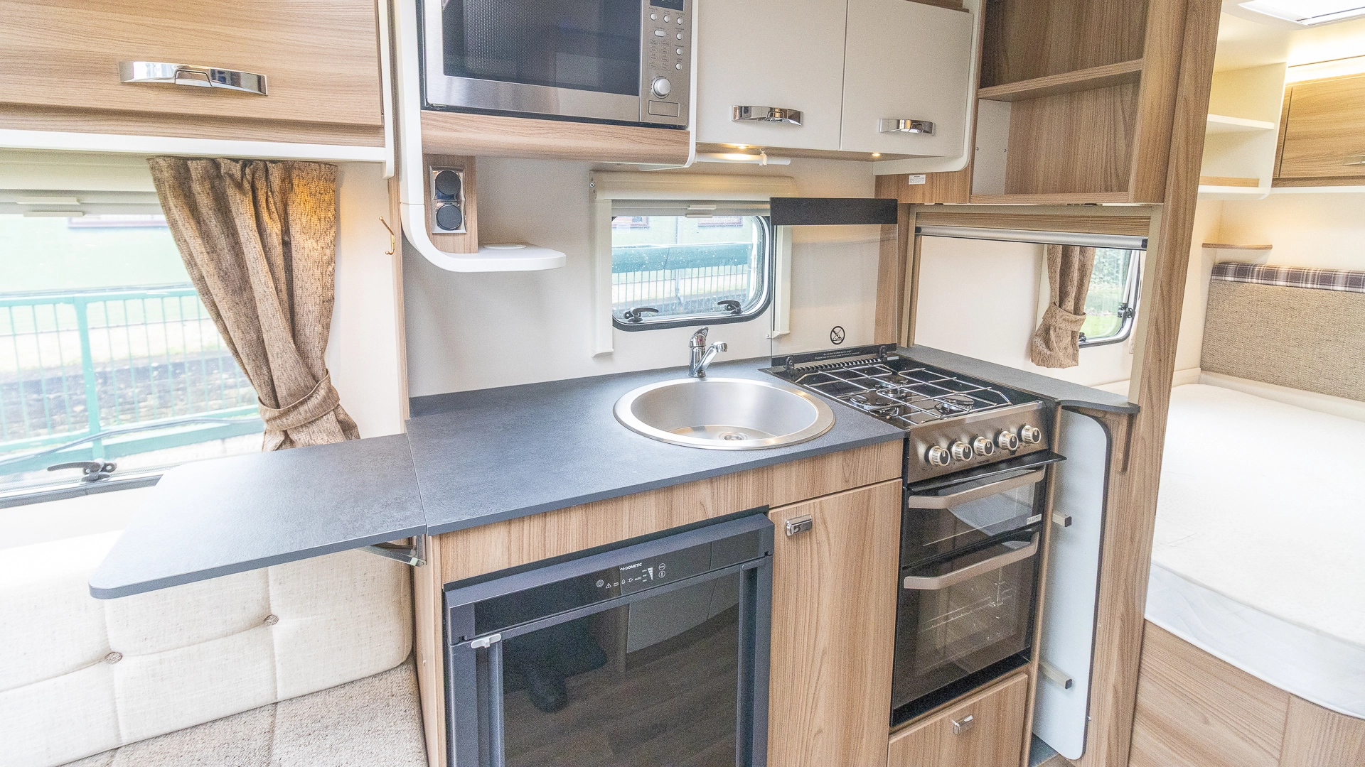 The kitchen comes with a microwave, hob, oven and grill, fridge‑freezer and plenty of worktop space, allowing you to prepare full meals on site.
