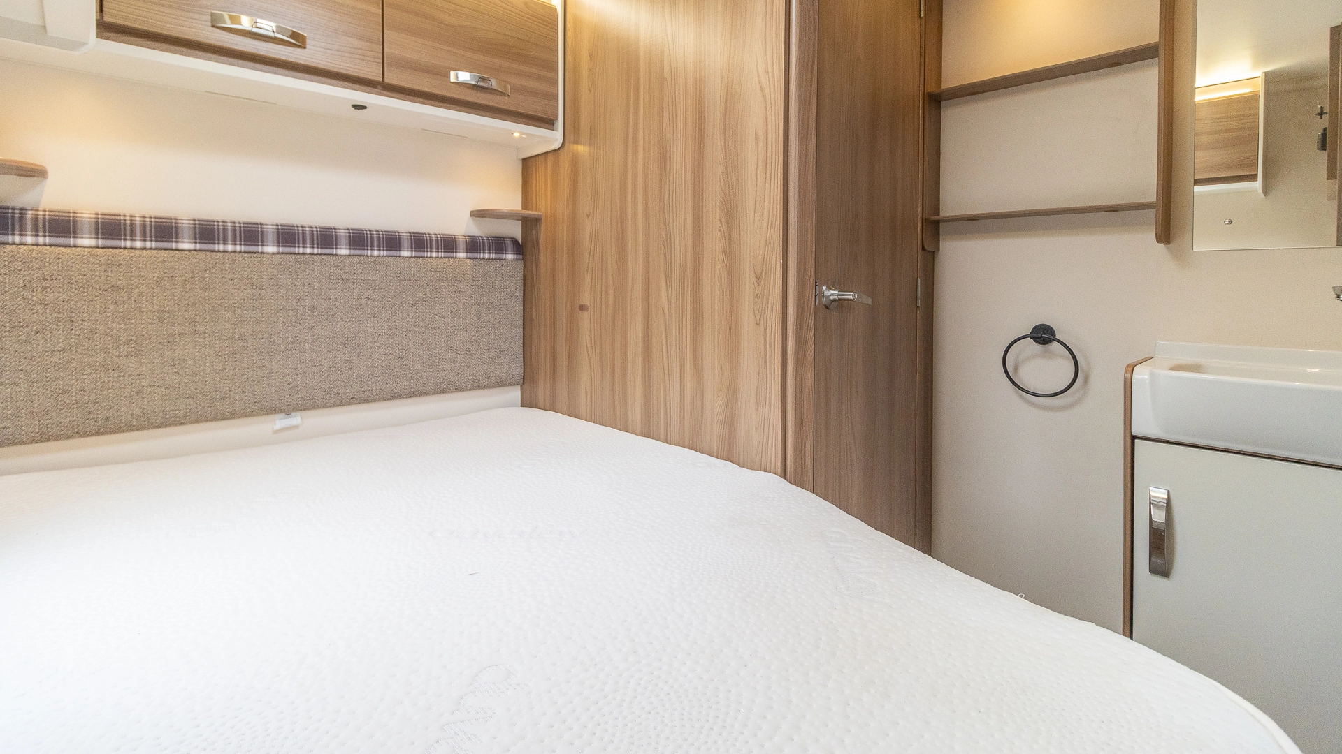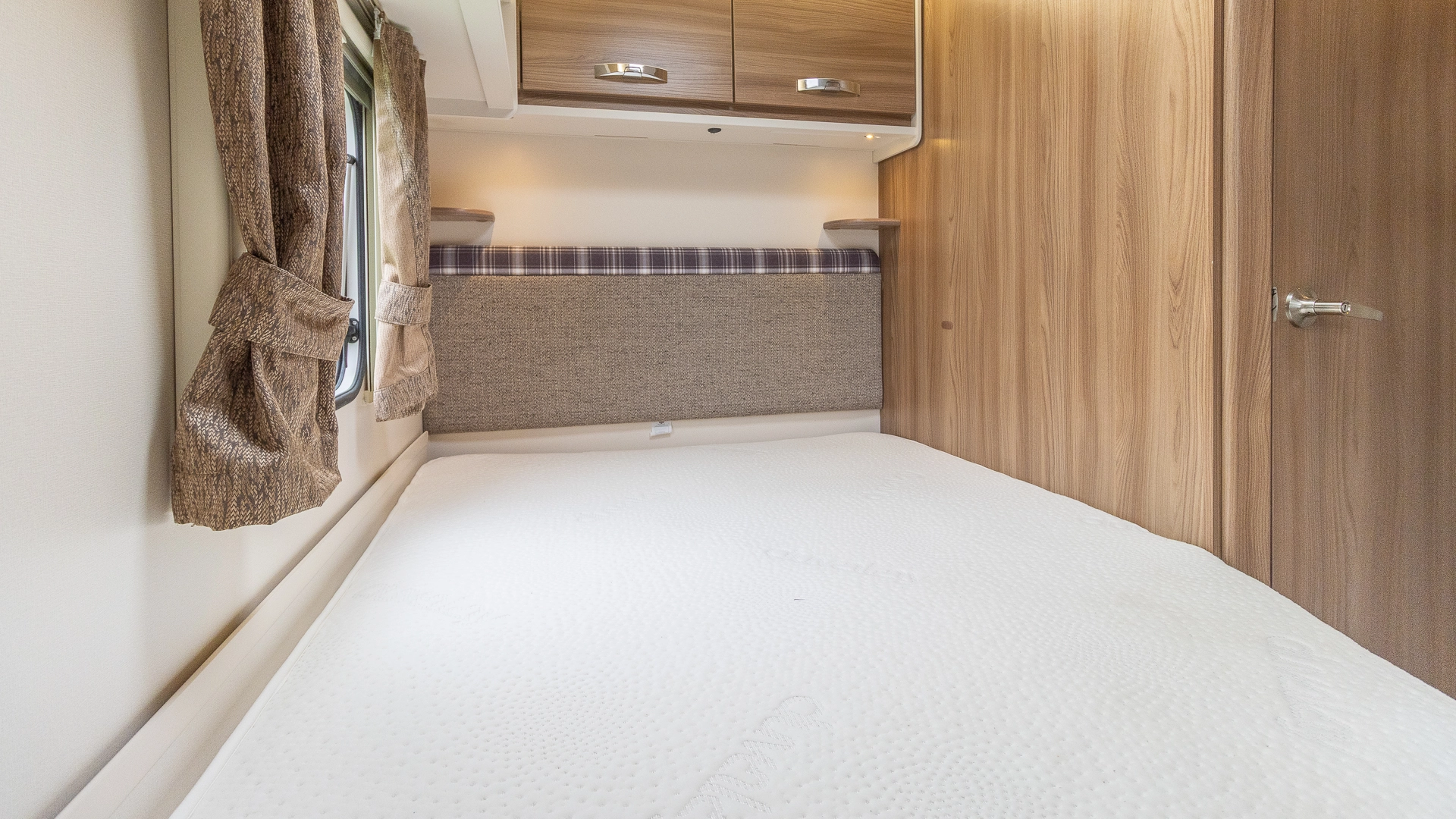 The fixed French bed provides a dedicated sleeping zone with generous under‑bed storage, requiring no nightly bed-making after a long day of holidaying.