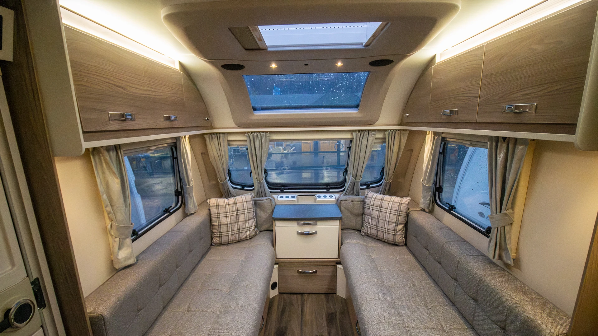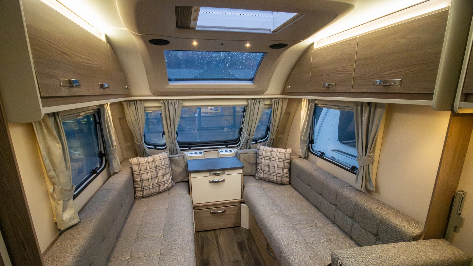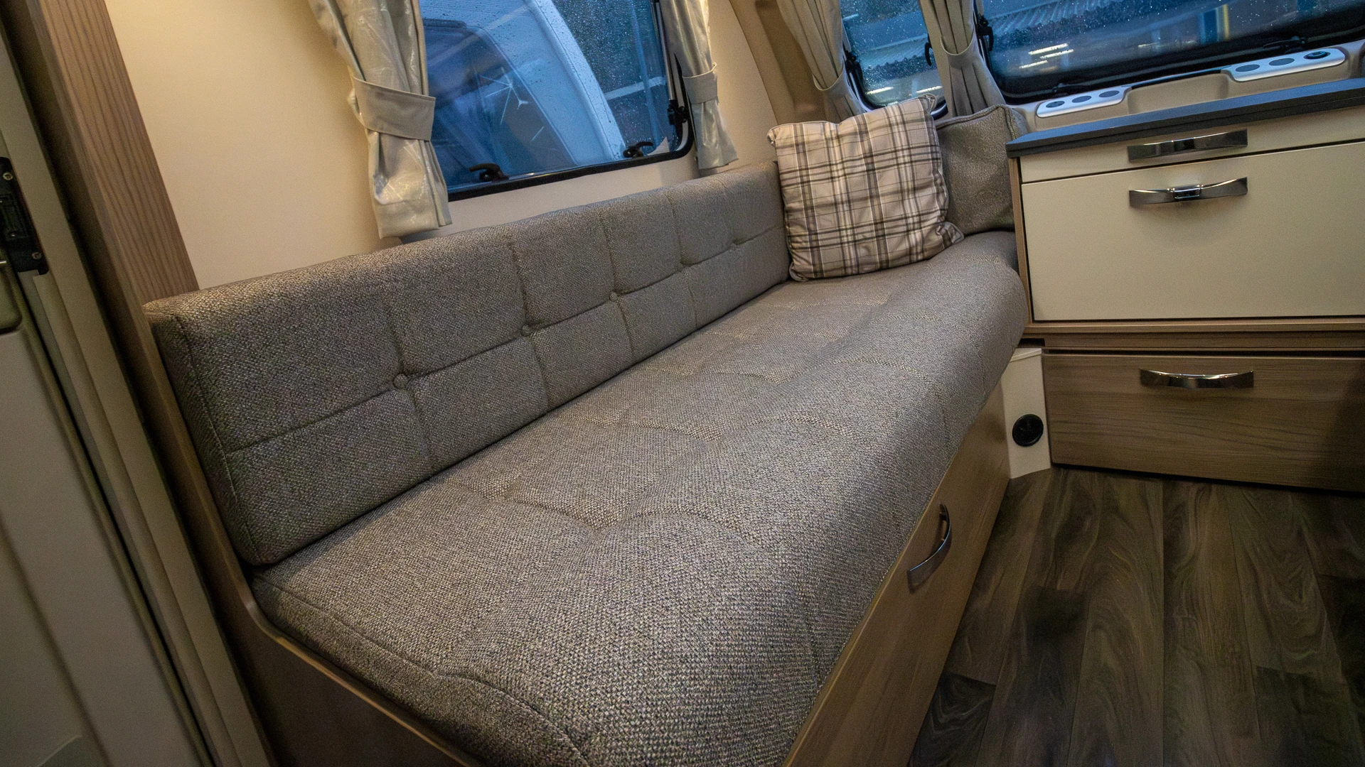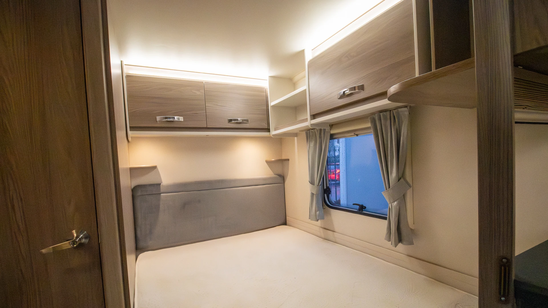 The rear of the caravan features a fixed French bed in a dedicated sleeping zone that’s always ready to use, offering a restful night’s sleep without the need to convert seating into a bed each evening.