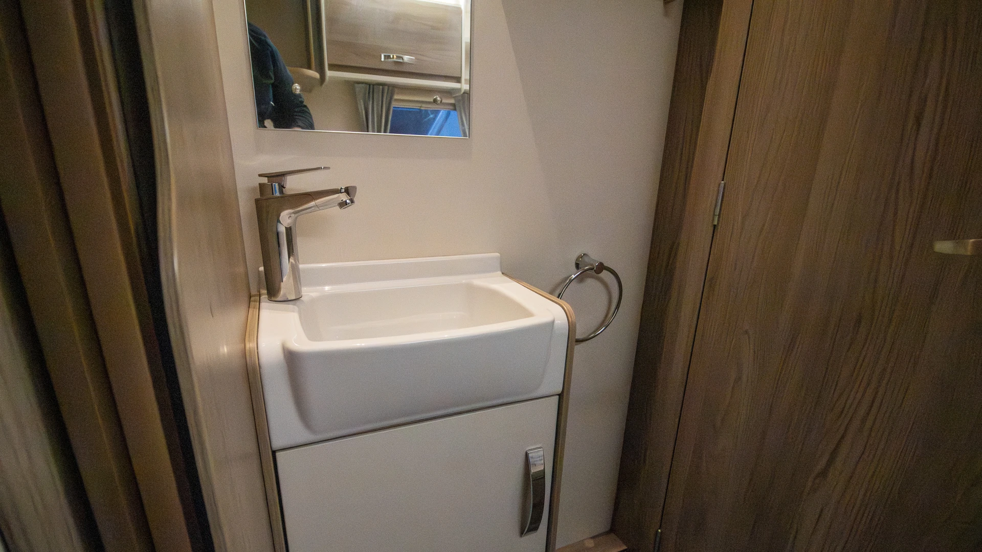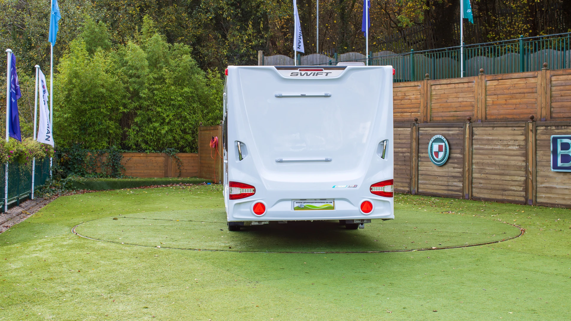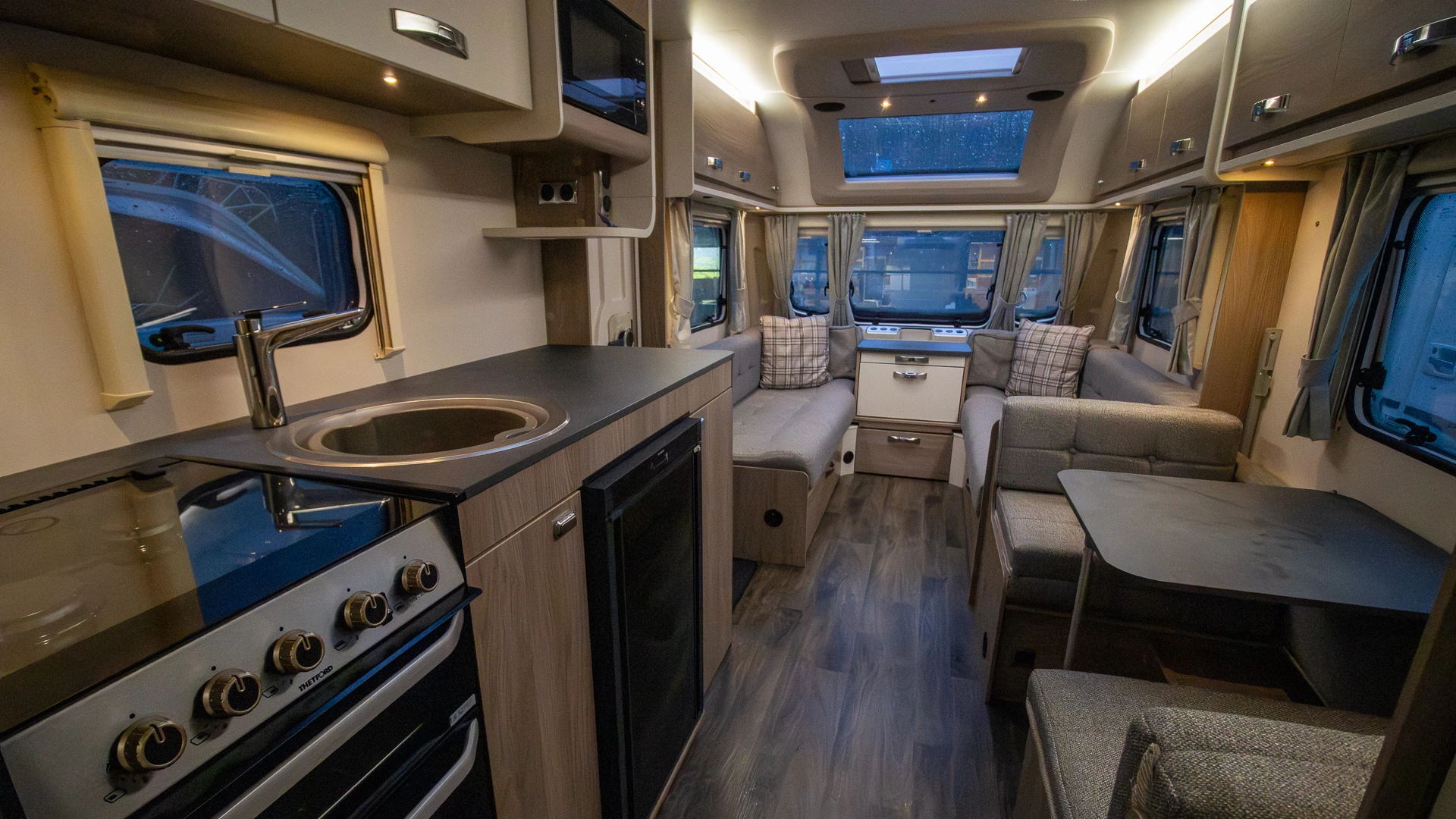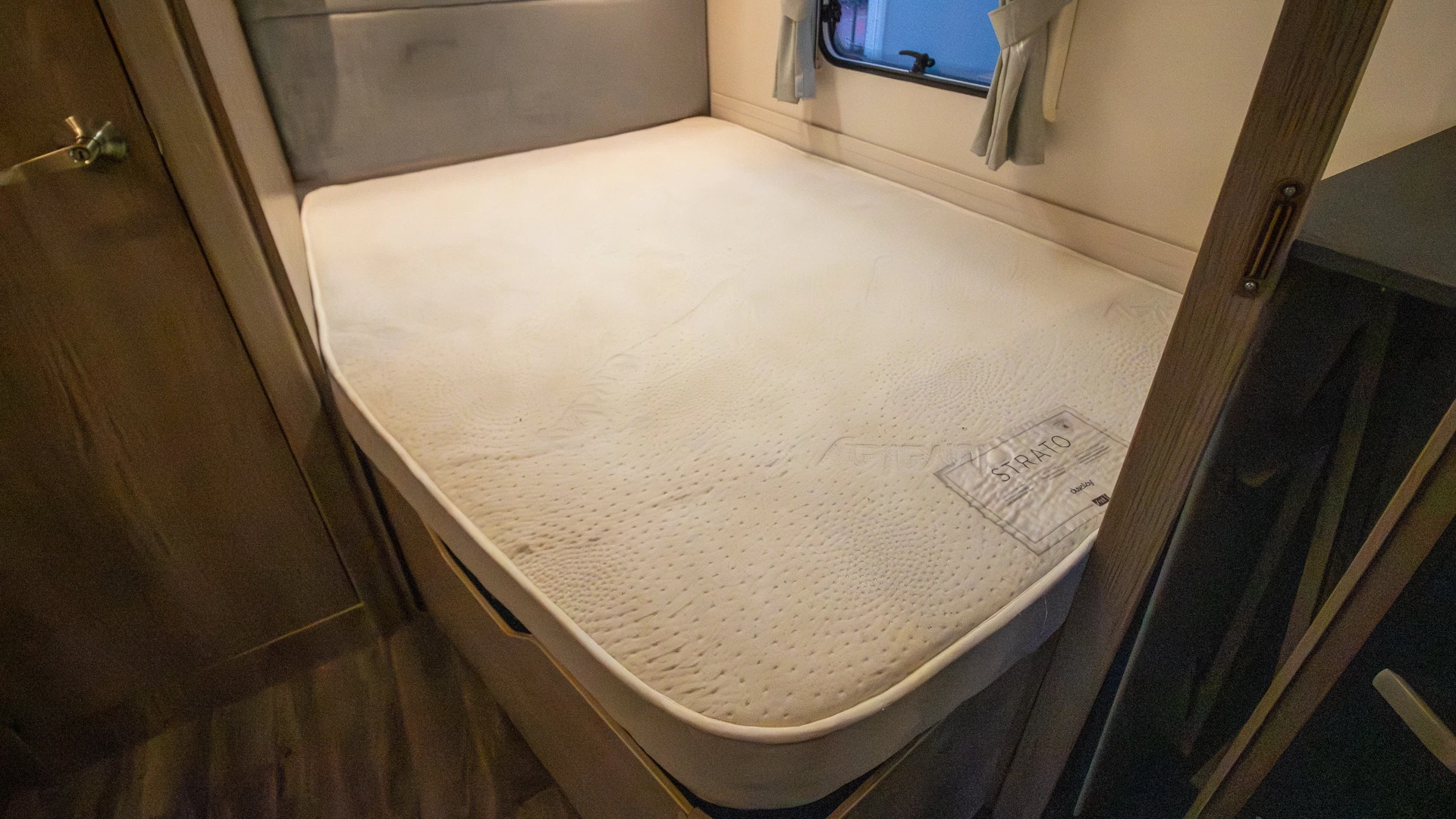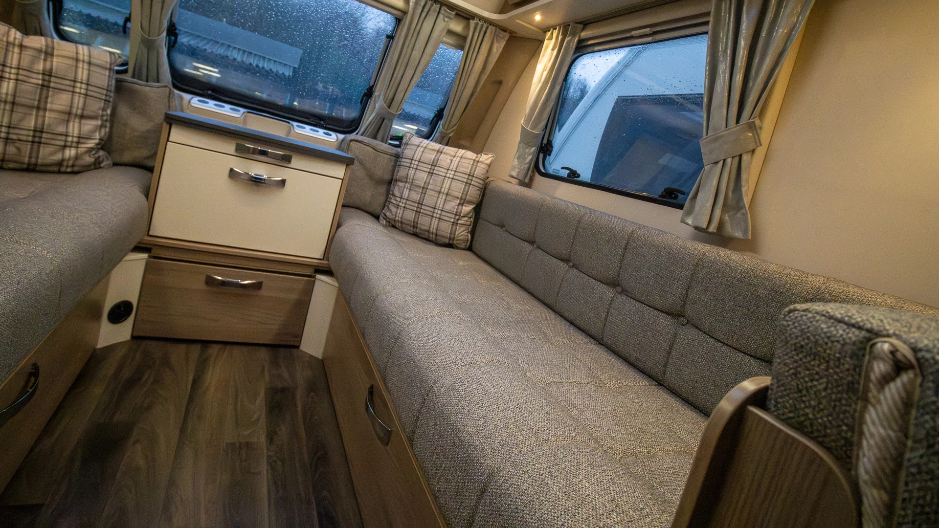 The rear of the caravan features a fixed French bed in a dedicated sleeping zone that’s always ready to use, offering a restful night’s sleep without the need to convert seating into a bed each evening.