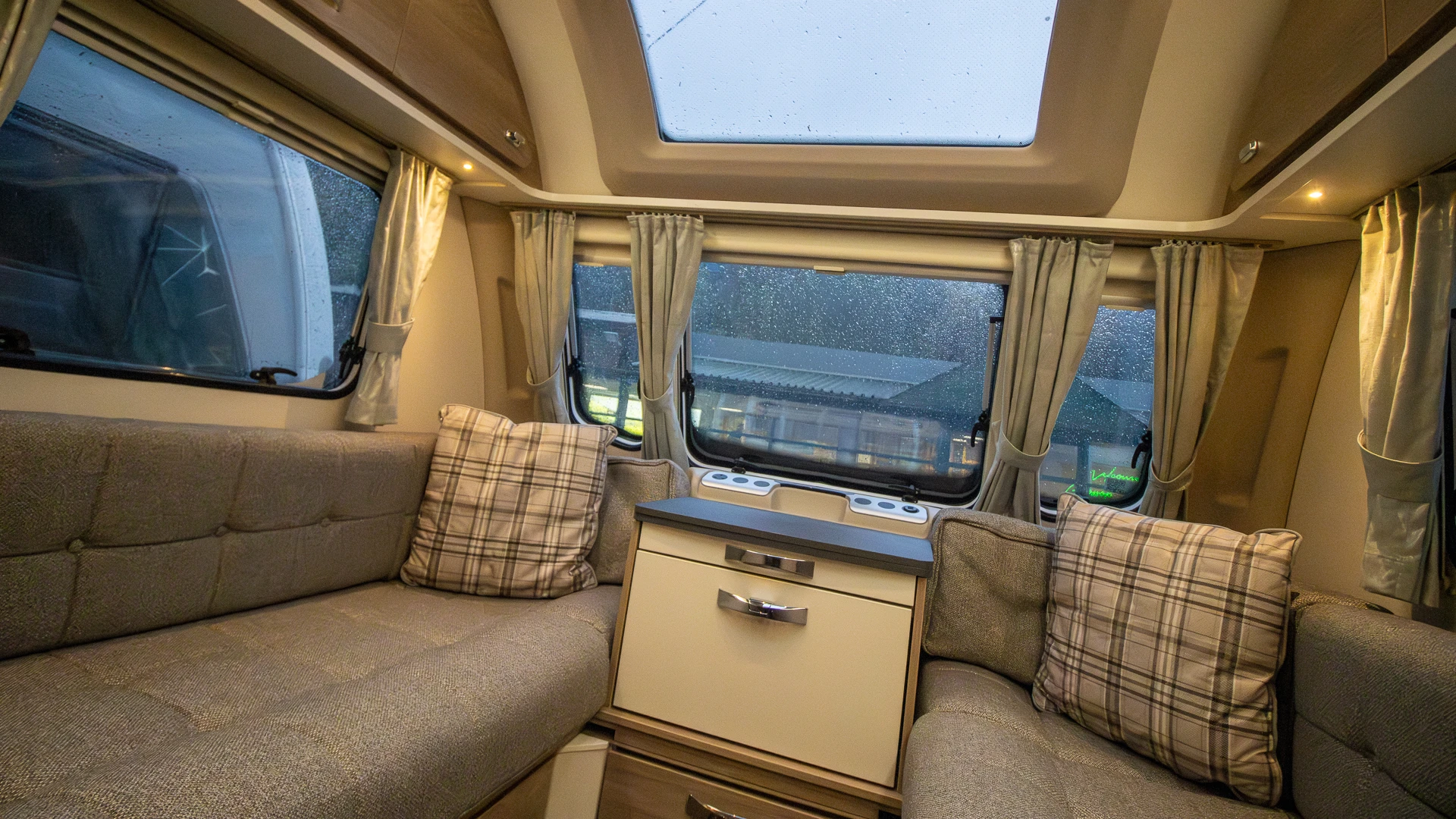 The front lounge features twin sofas that create a bright, sociable living area during the day, and can convert into a comfortable double bed at night.