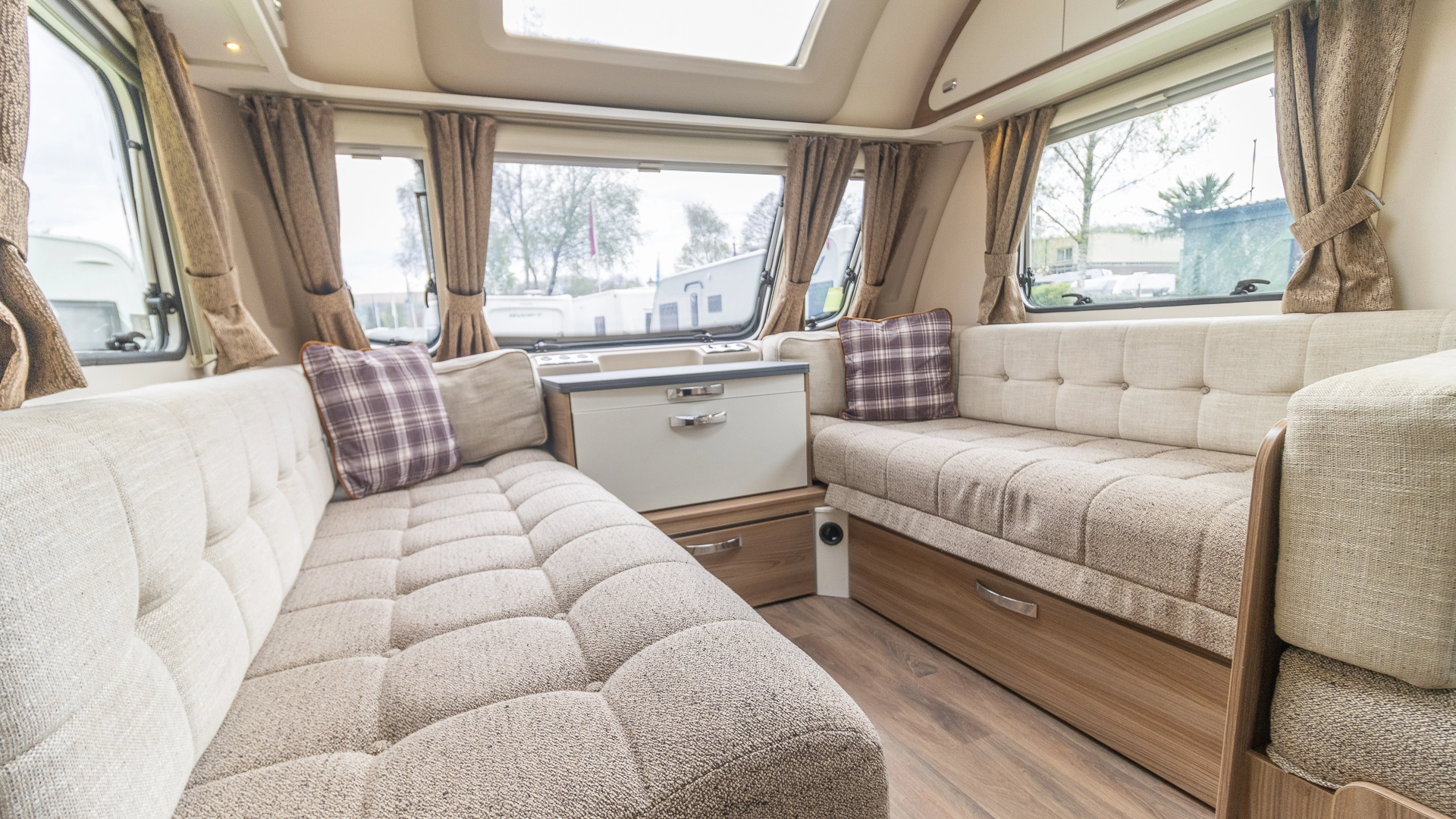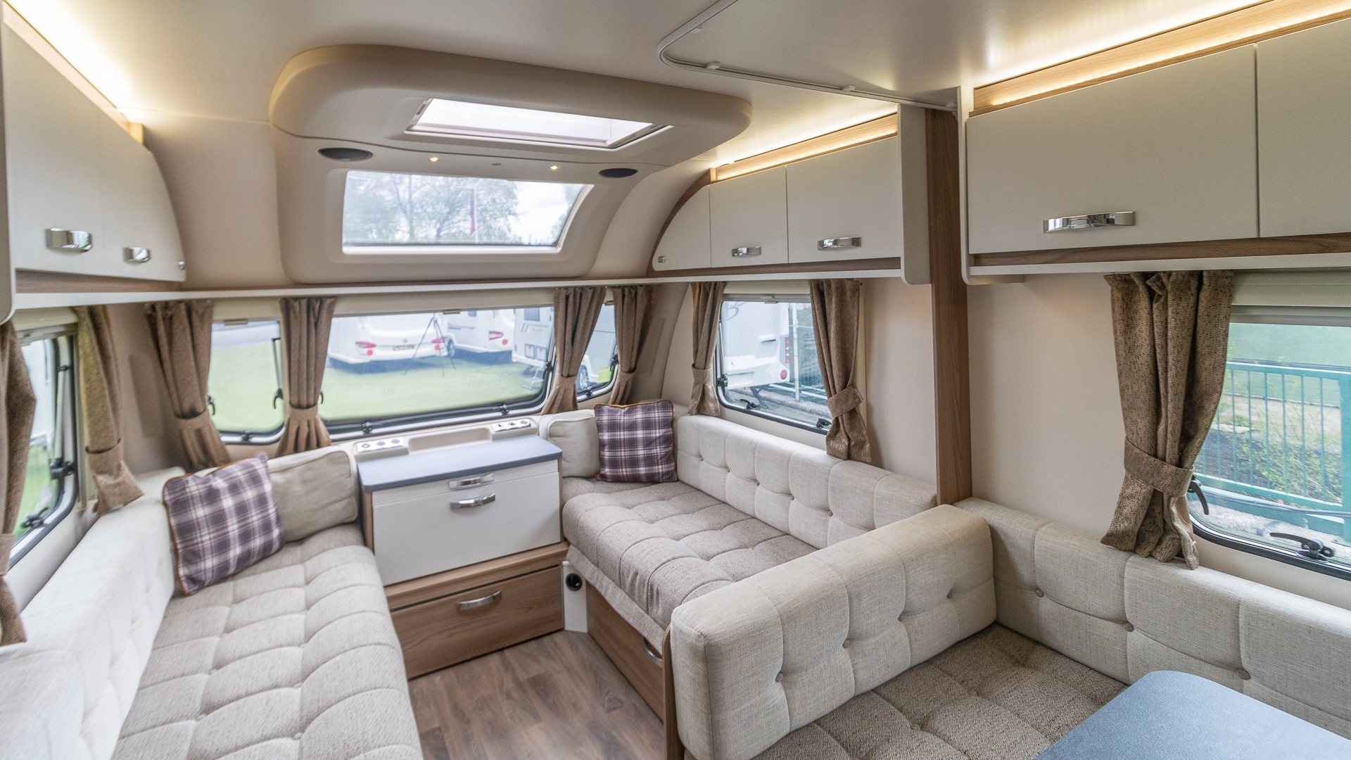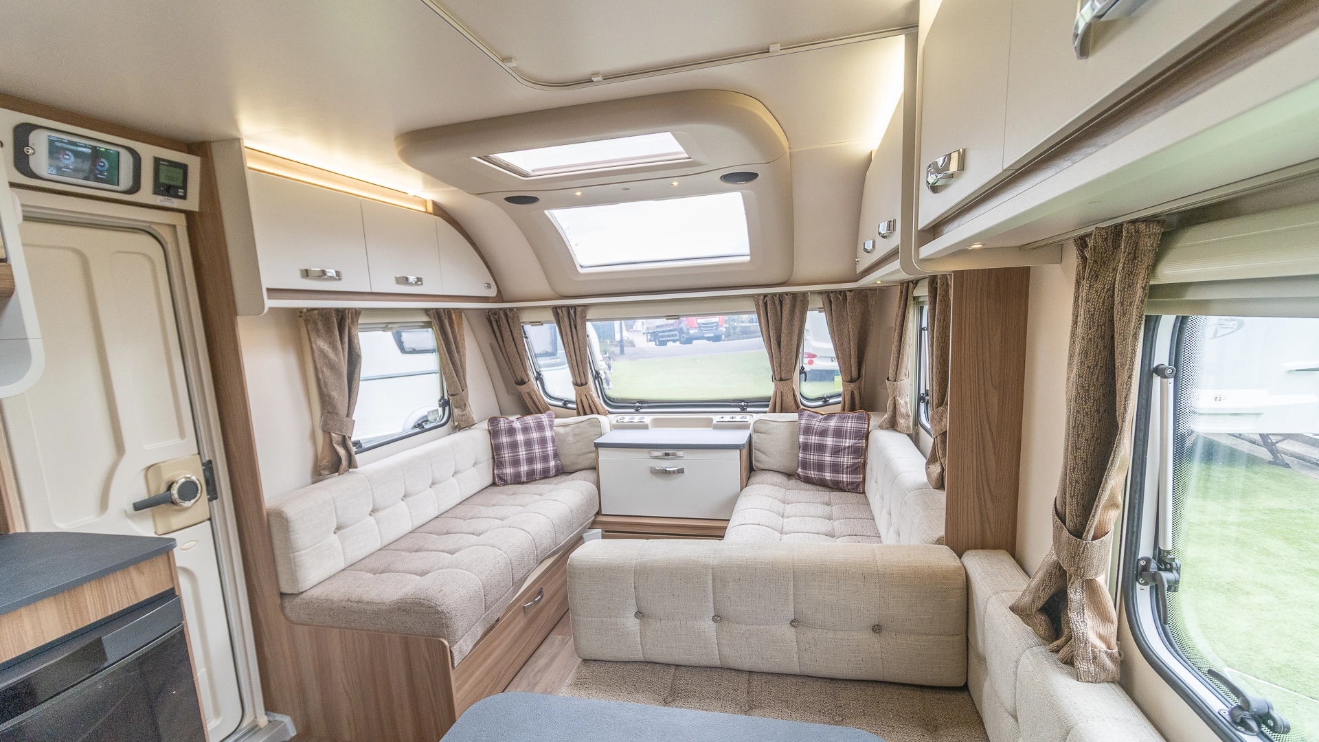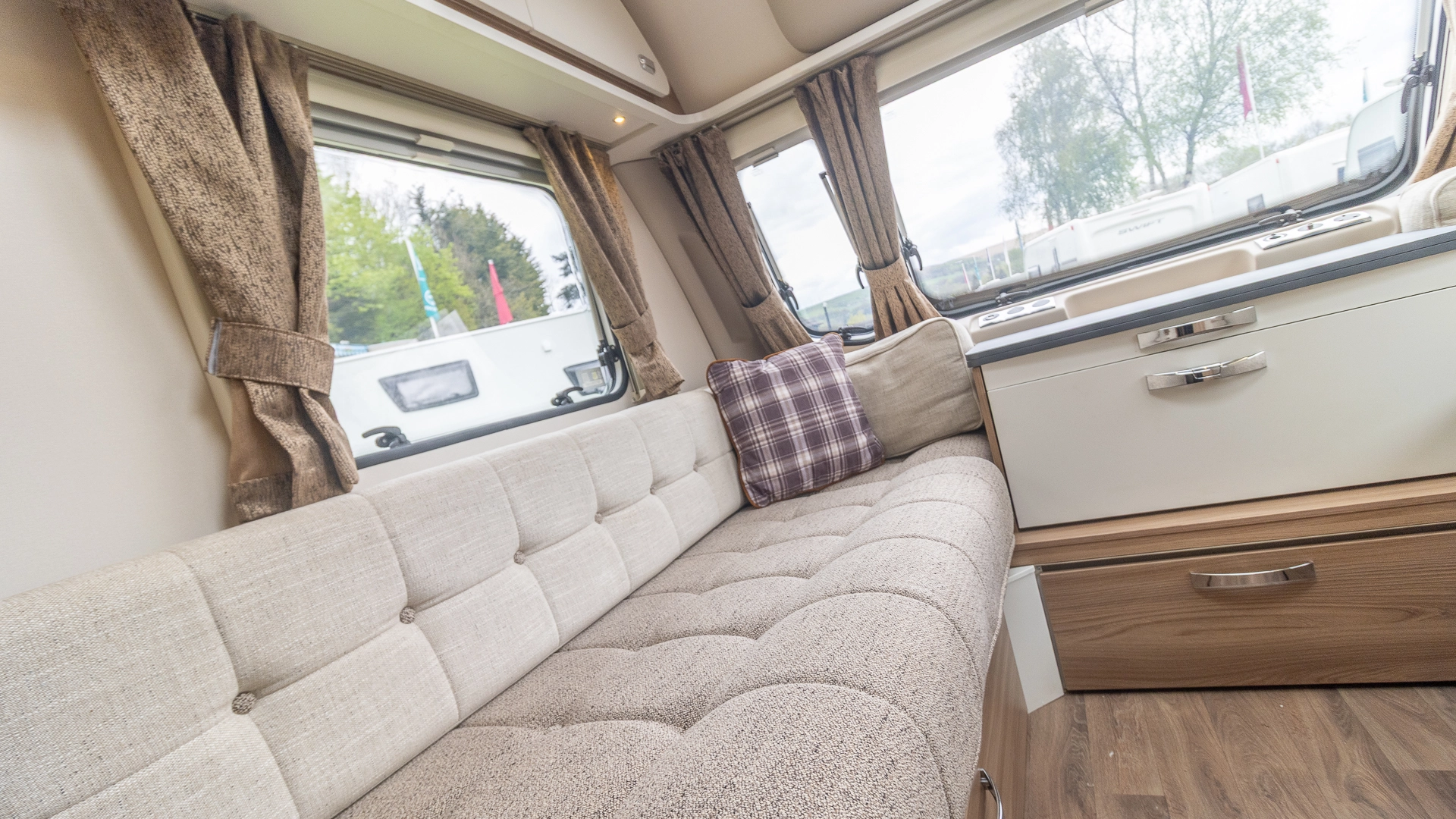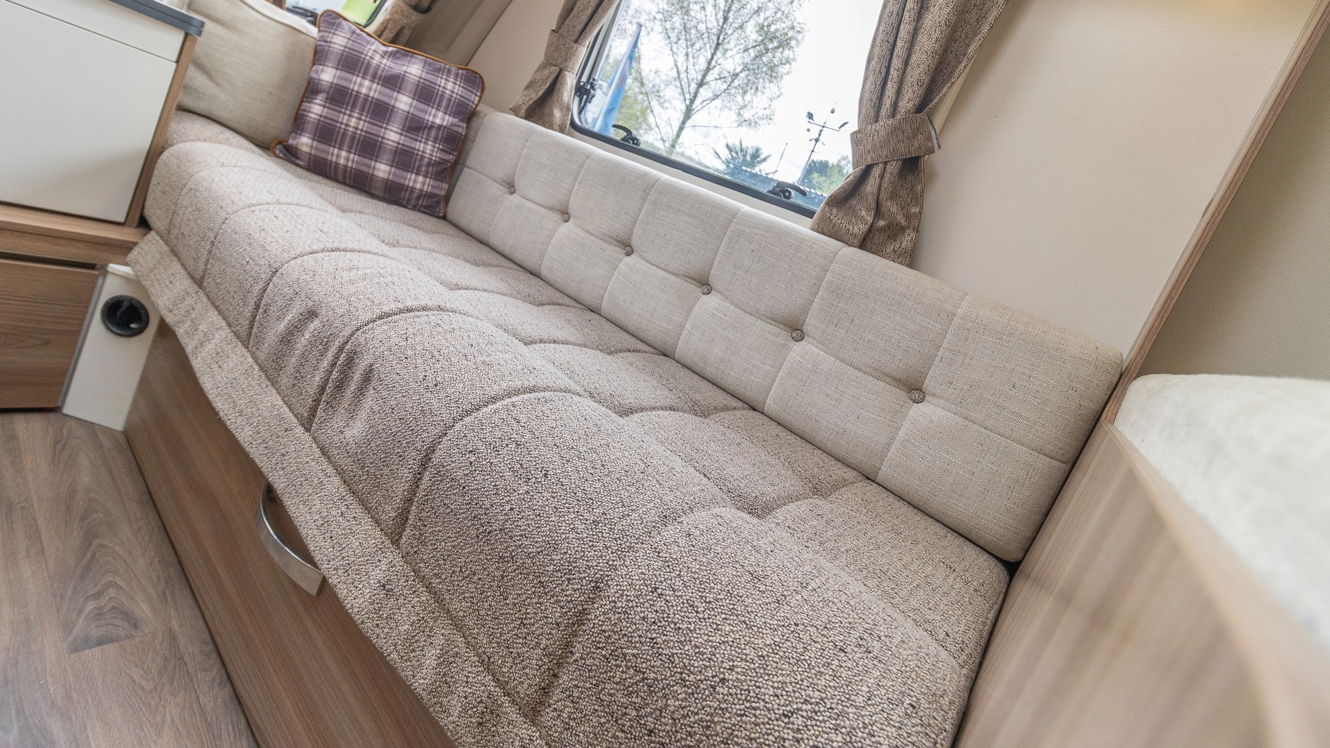 The front lounge features twin sofas that create a bright, sociable living area during the day, and can convert into a comfortable double bed at night.