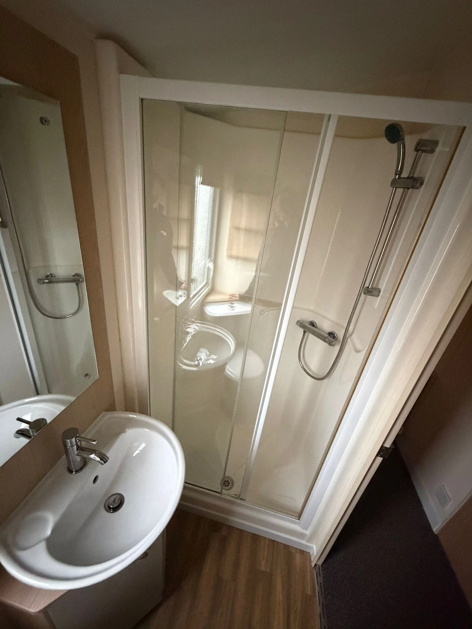 The main bathroom is equipped with a large walk in shower, washbasin, and WC designed with convenience and functionality in mind.