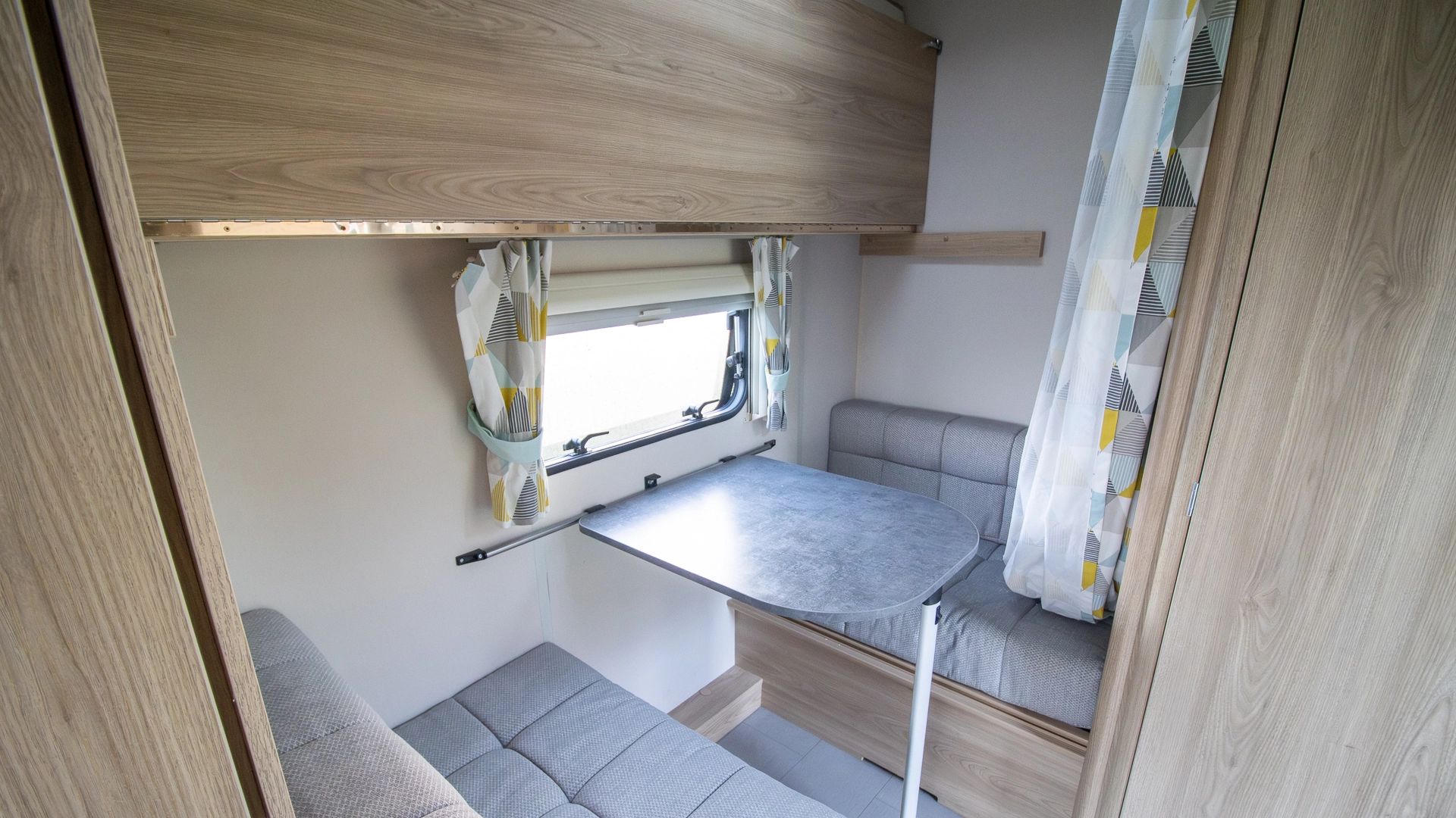 Positioned at the rear, the end dinette benefits from natural light from the windows while providing a cozy seating area for relaxing or dining. At night, the dinette easily converts into a bunk bed after a day of exploring.