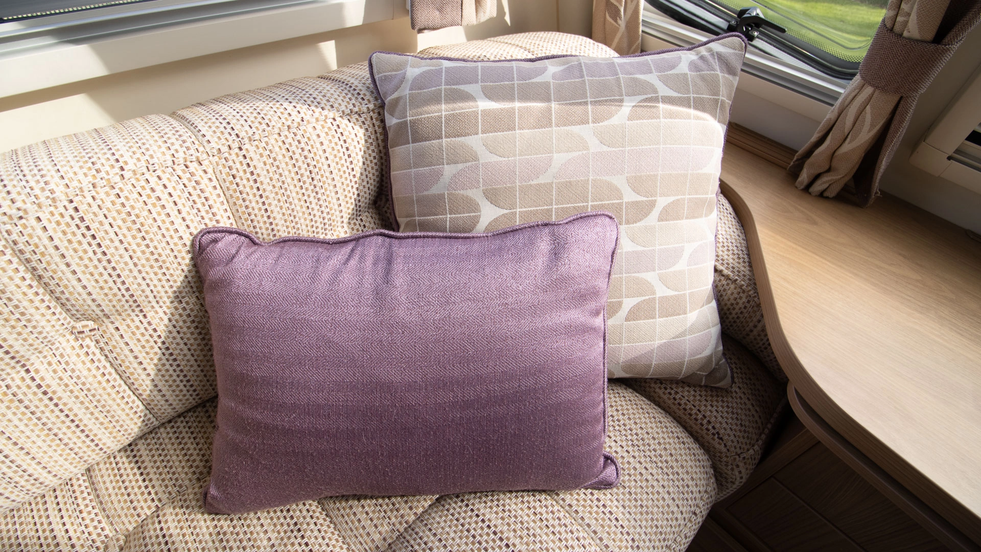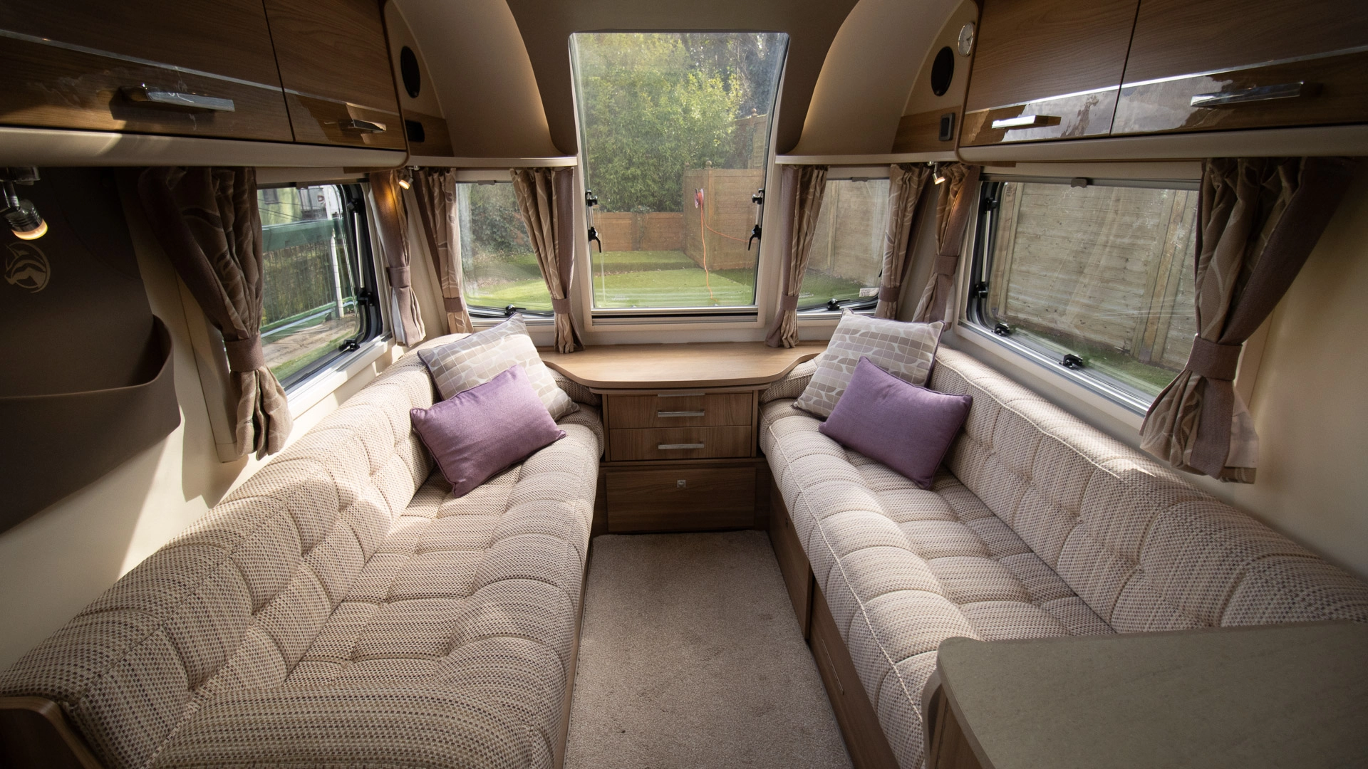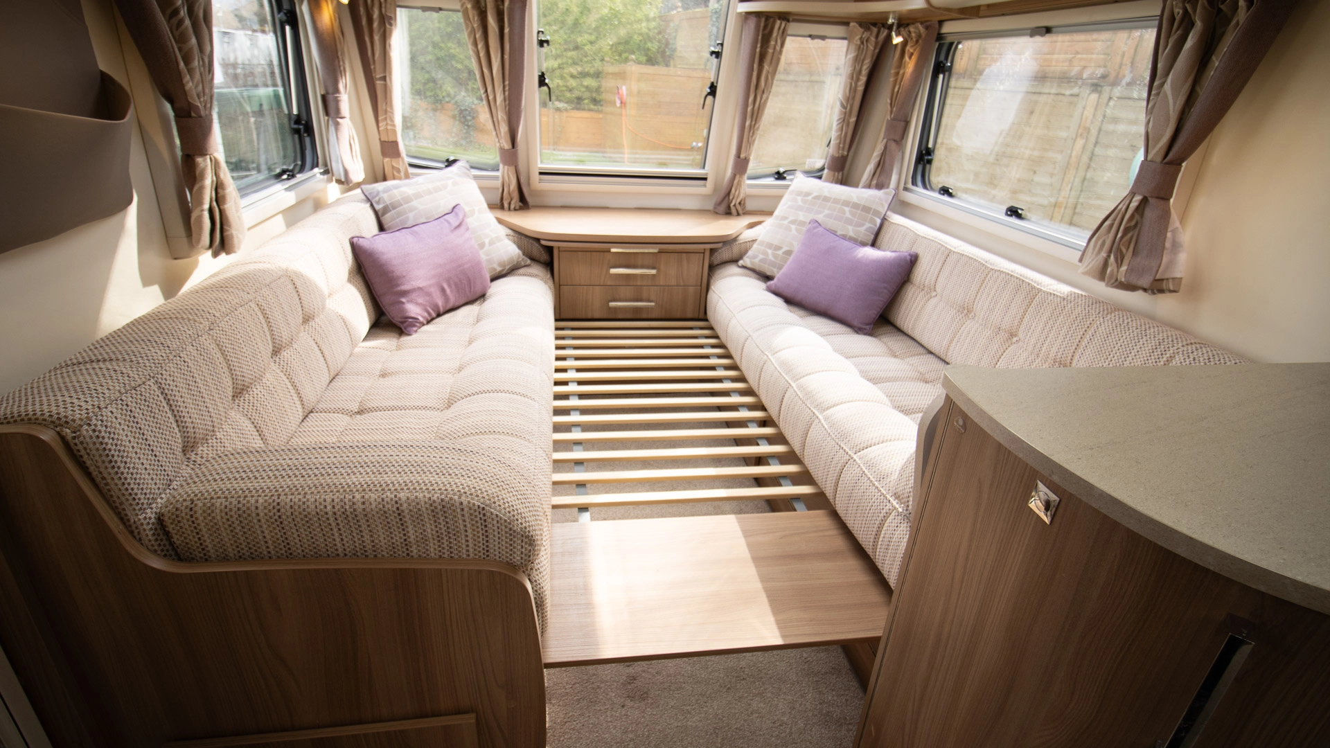 The front lounge features twin sofas that create a bright, sociable living area during the day, and can convert into a comfortable double bed at night.