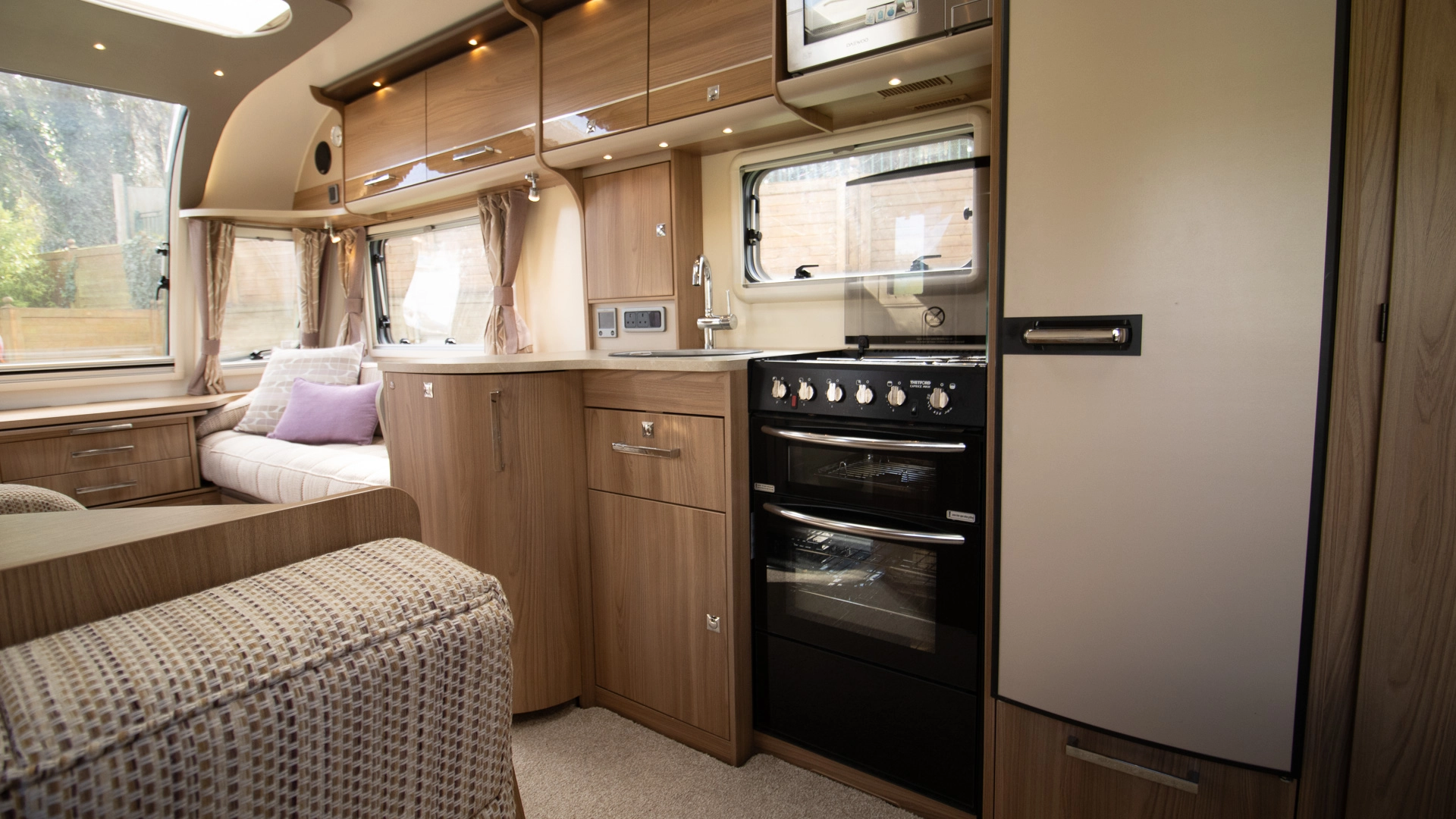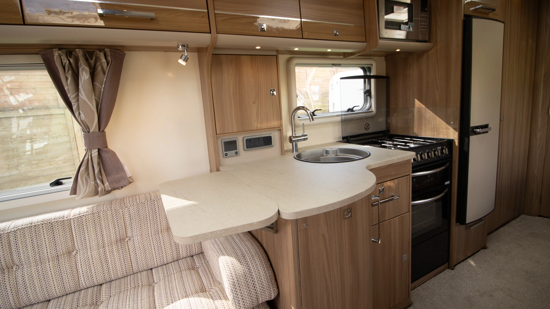 The kitchen comes with a microwave, hob, oven and grill, fridge‑freezer and plenty of worktop space, allowing you to prepare full meals on site.