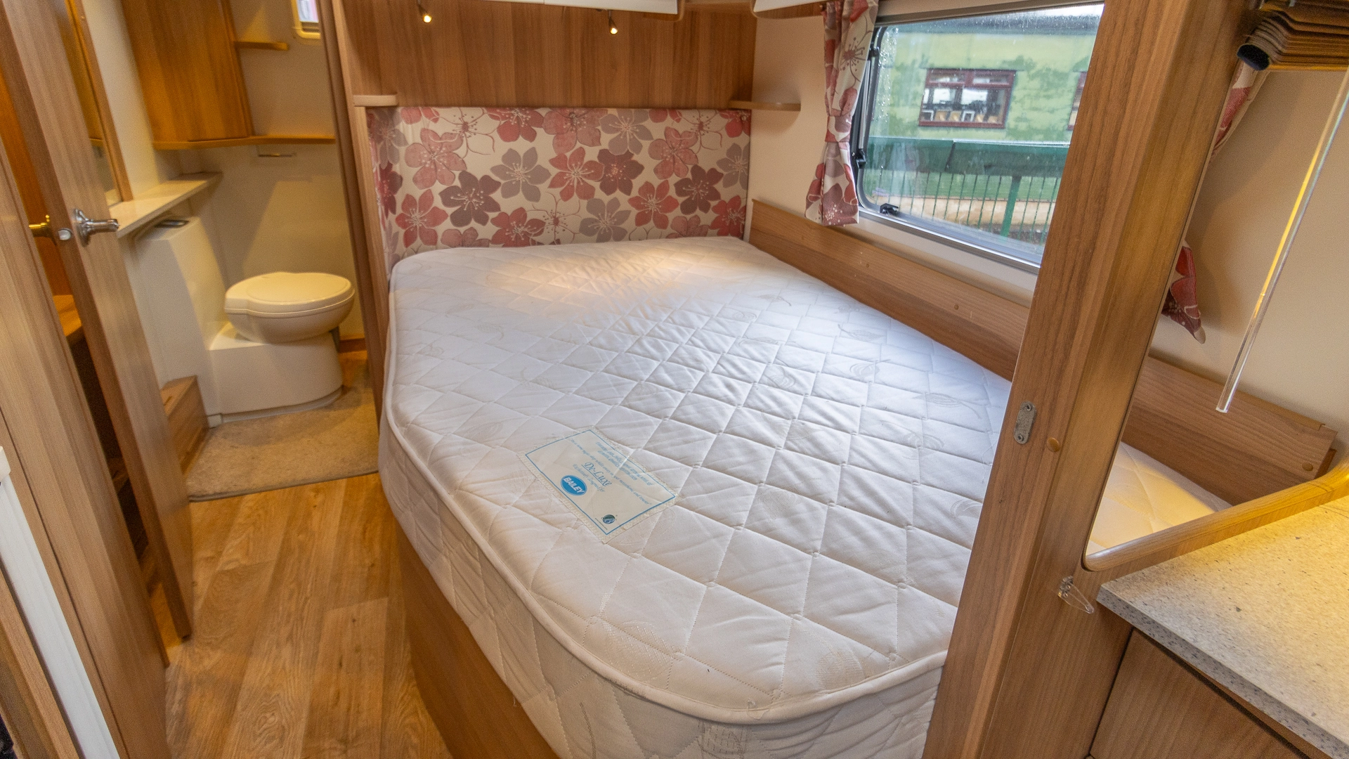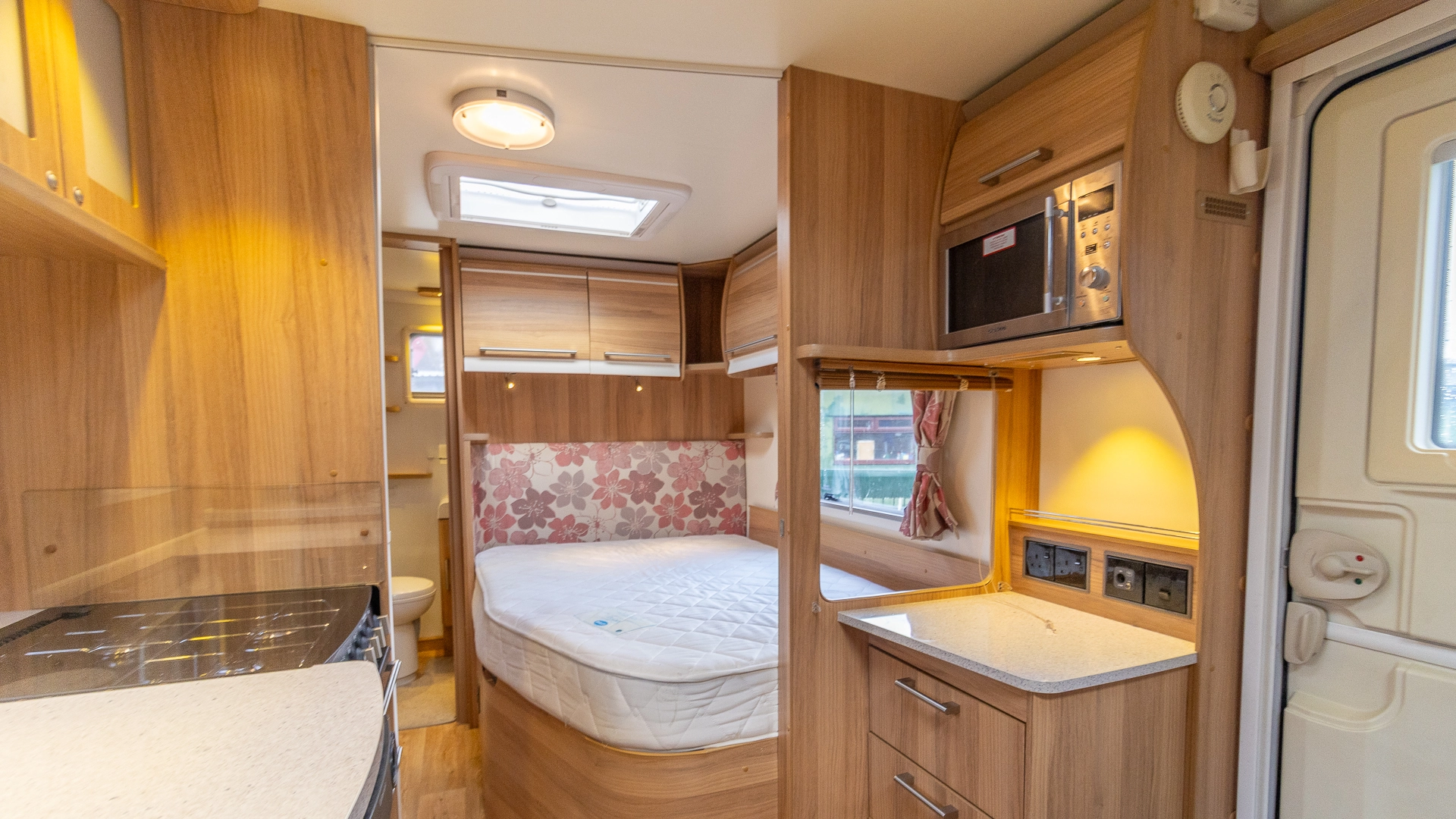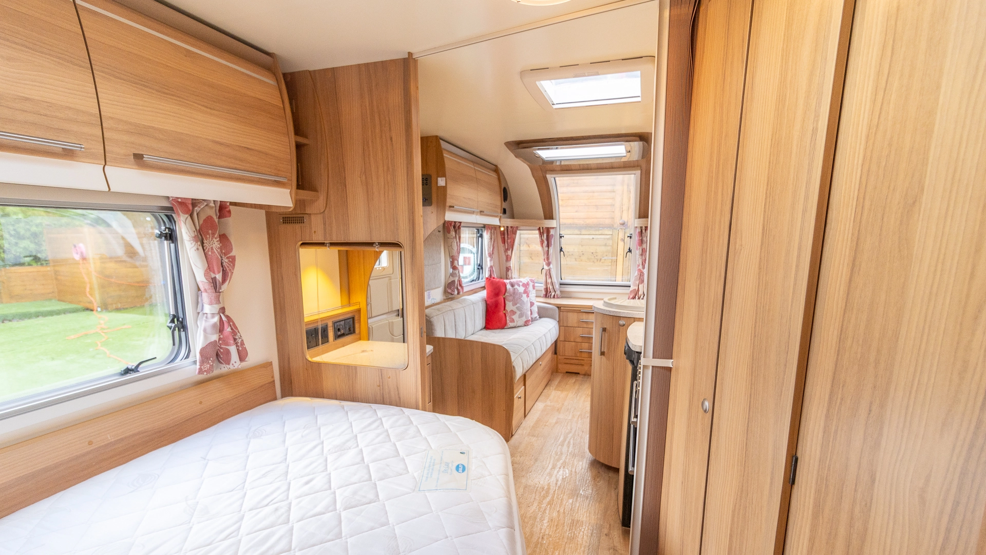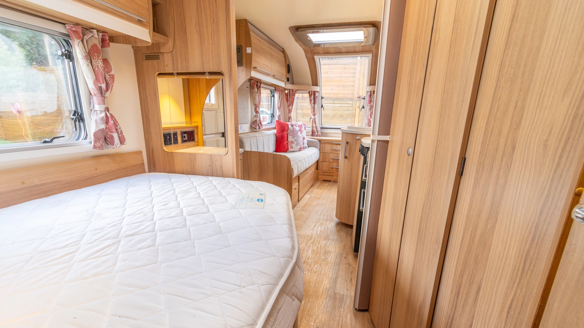 The rear of the caravan features a fixed French bed in a dedicated sleeping zone that’s always ready to use, offering a restful night’s sleep without the need to convert seating into a bed each evening.