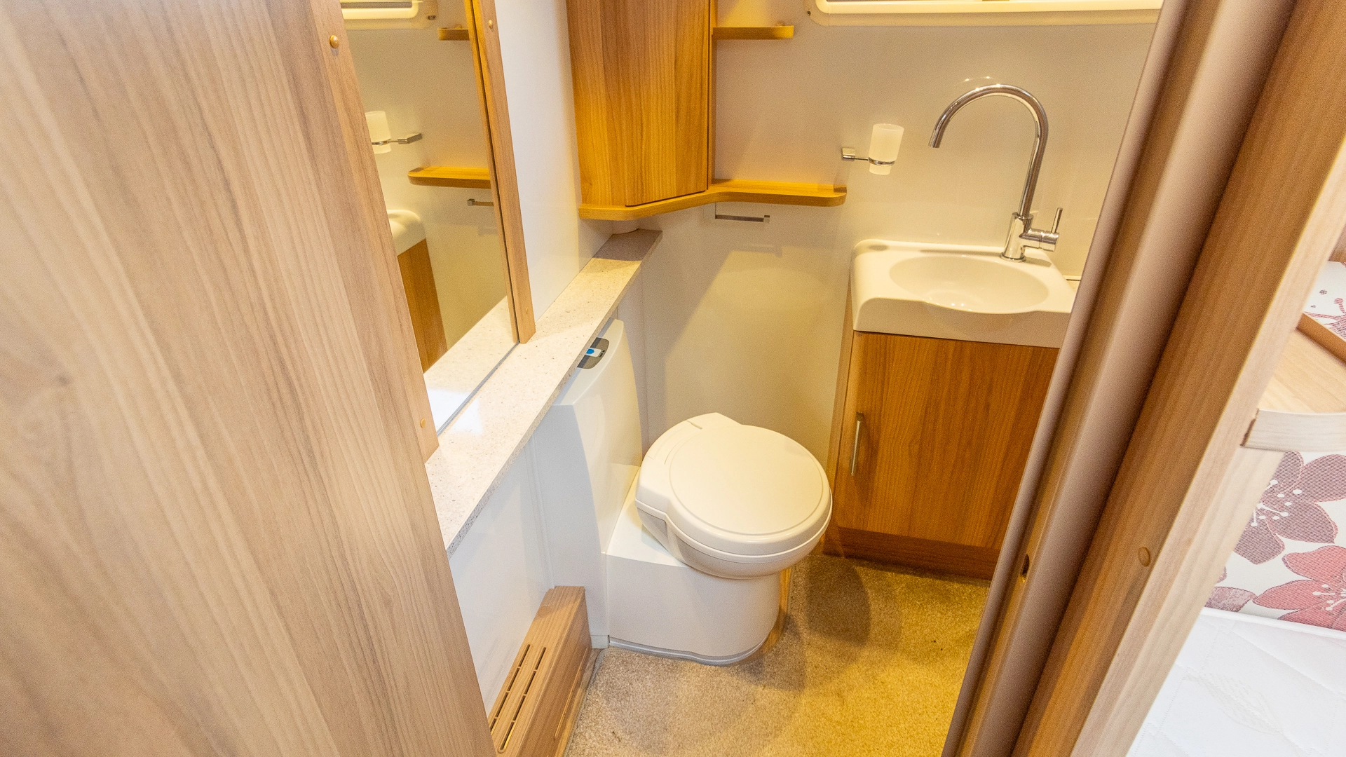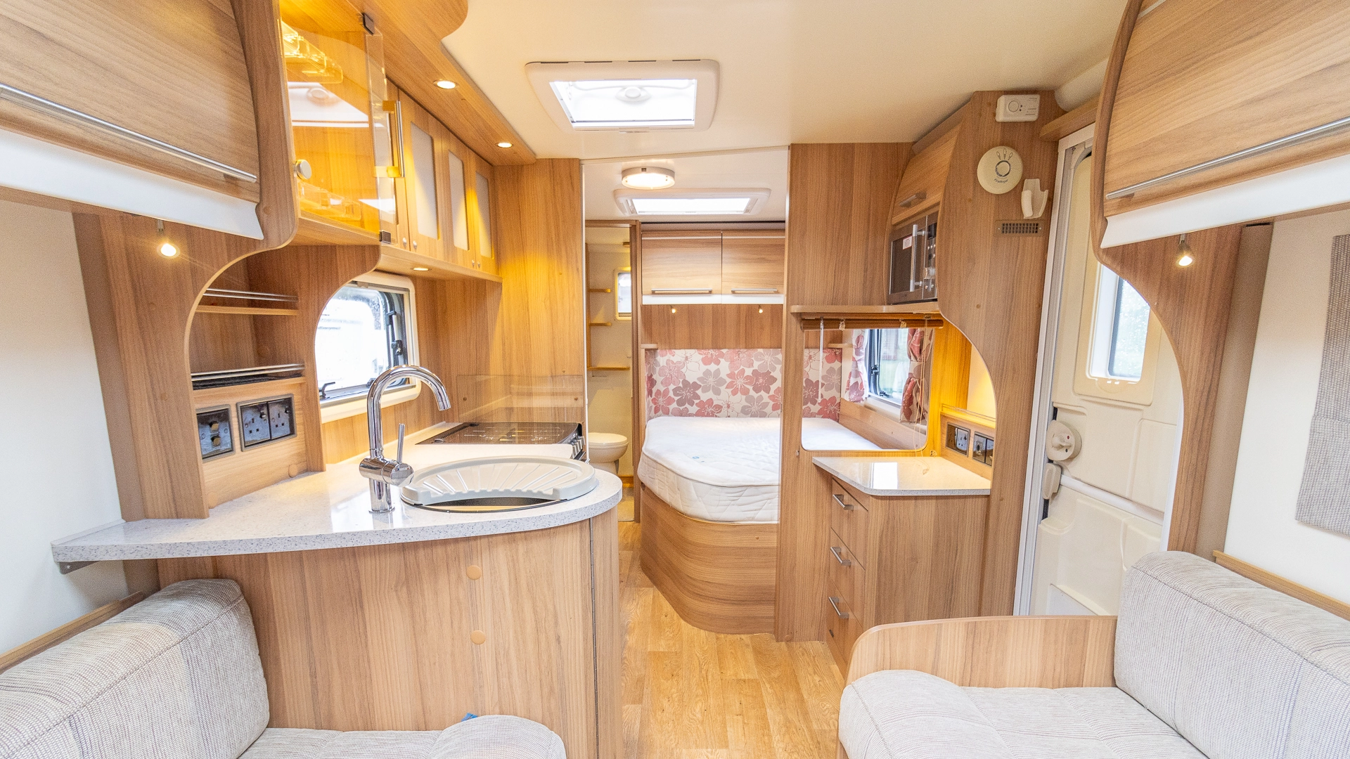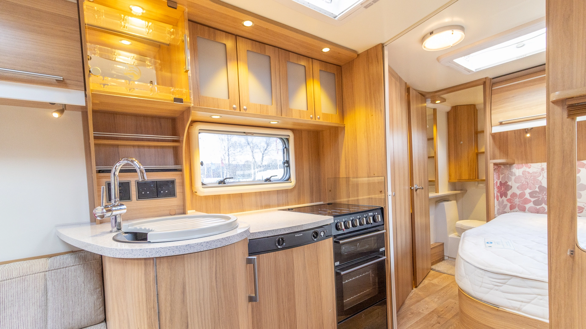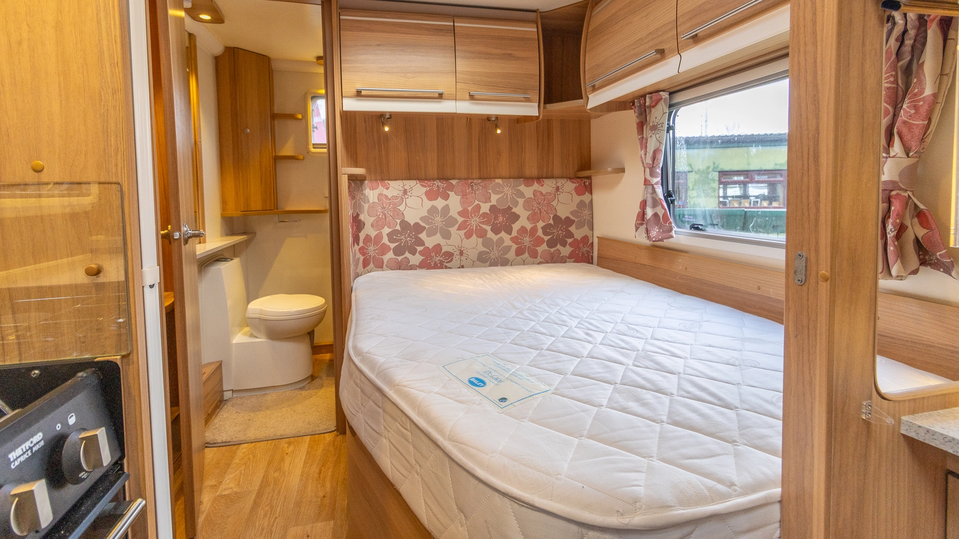 The rear of the caravan features a fixed French bed in a dedicated sleeping zone that’s always ready to use, offering a restful night’s sleep without the need to convert seating into a bed each evening.