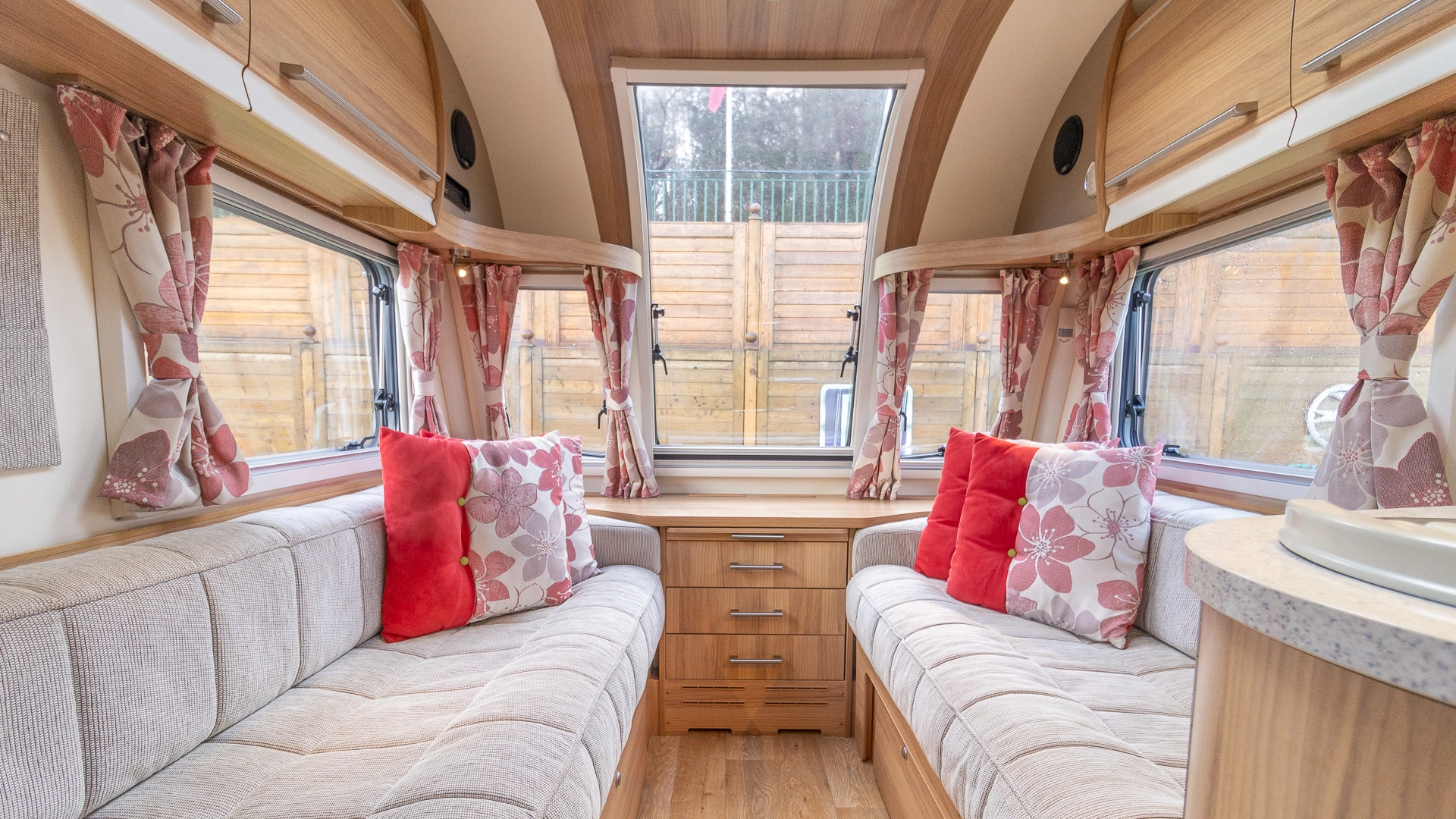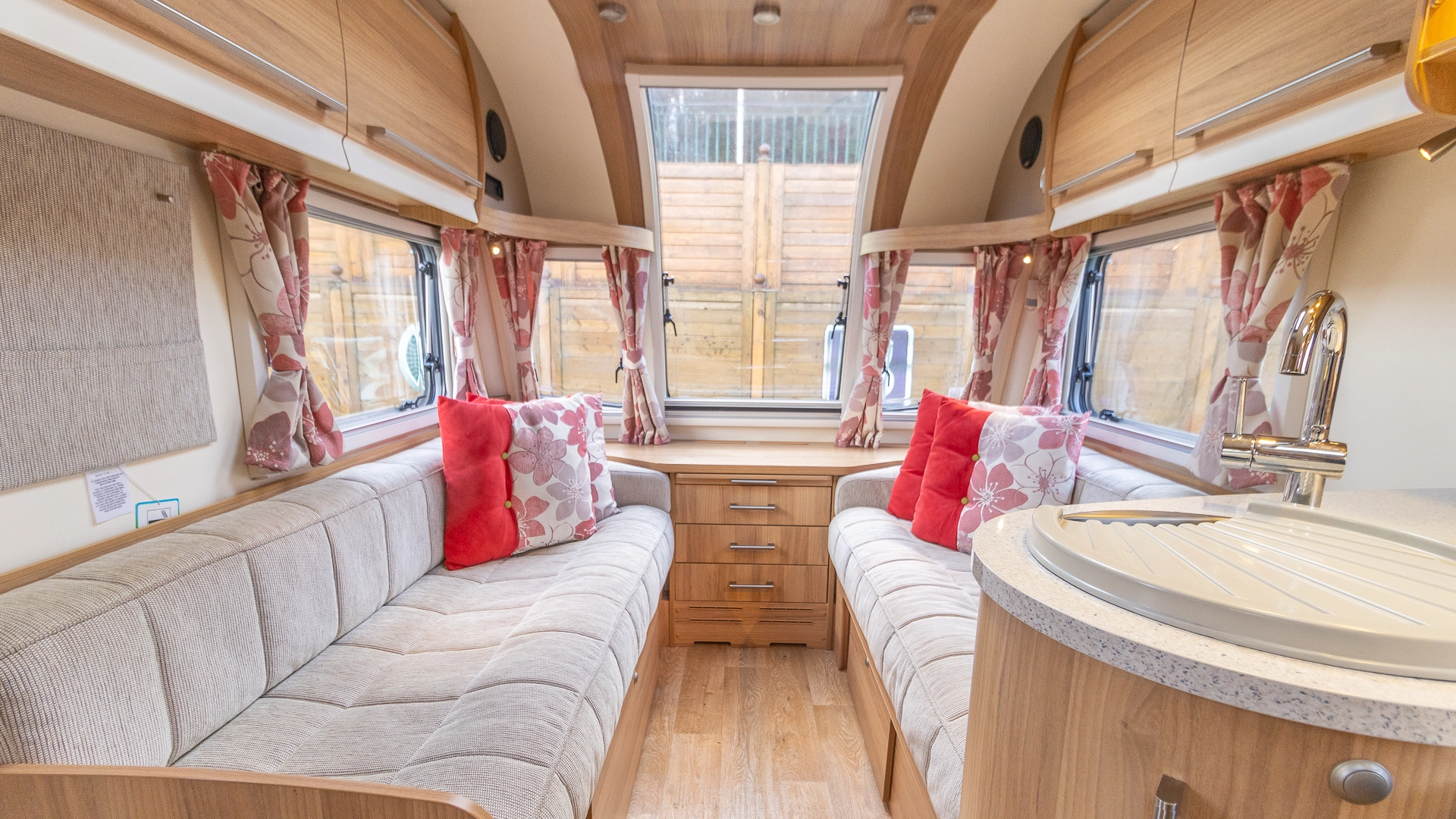 The front lounge features twin sofas that create a bright, sociable living area during the day, and can convert into a comfortable double bed at night.