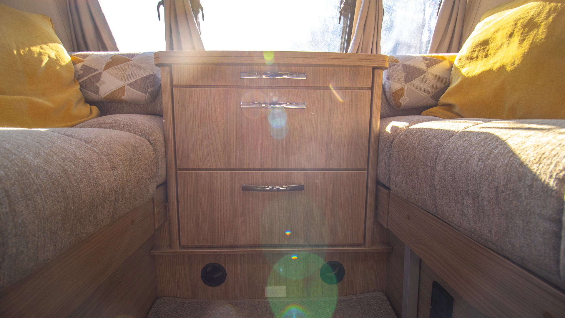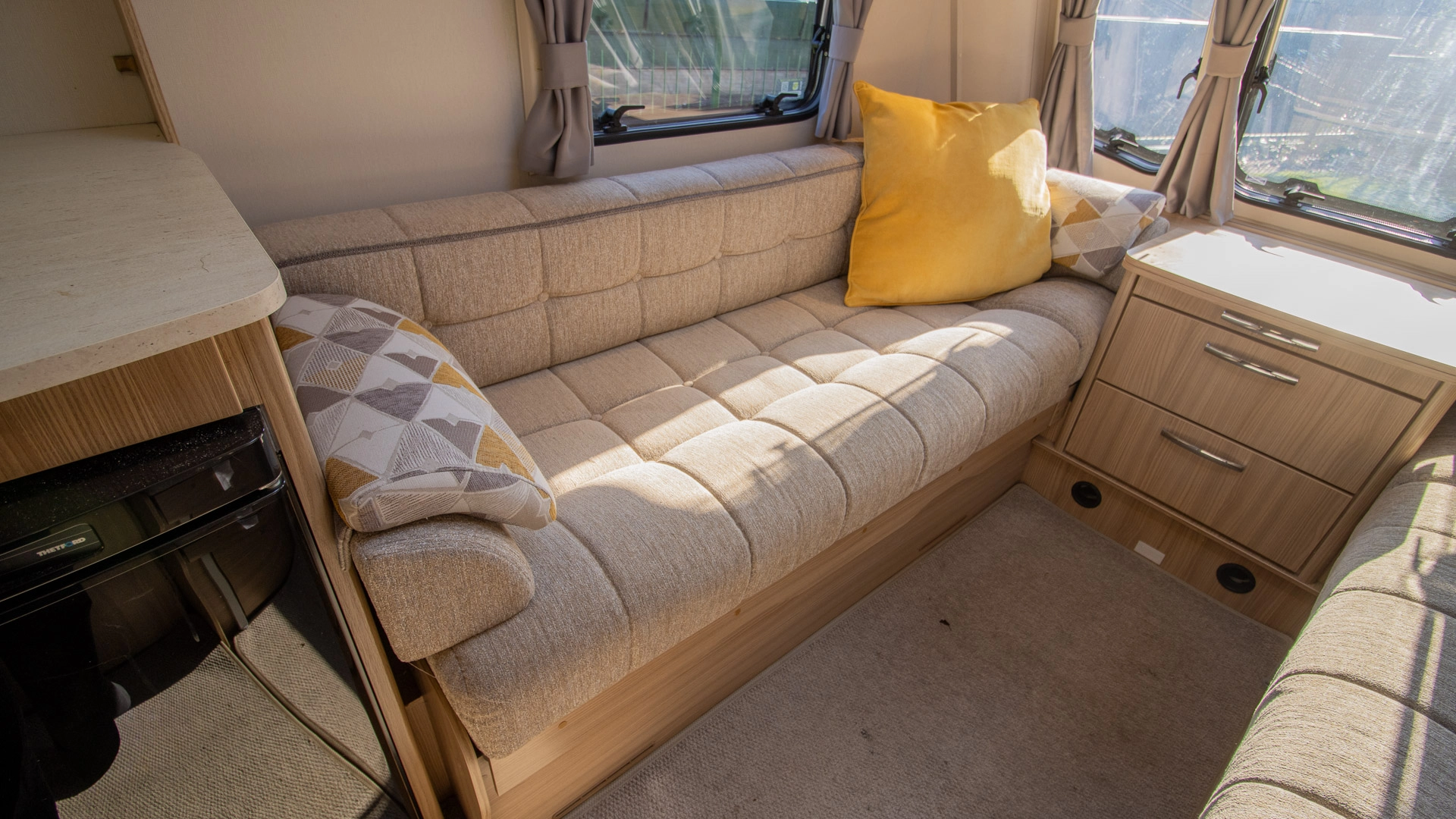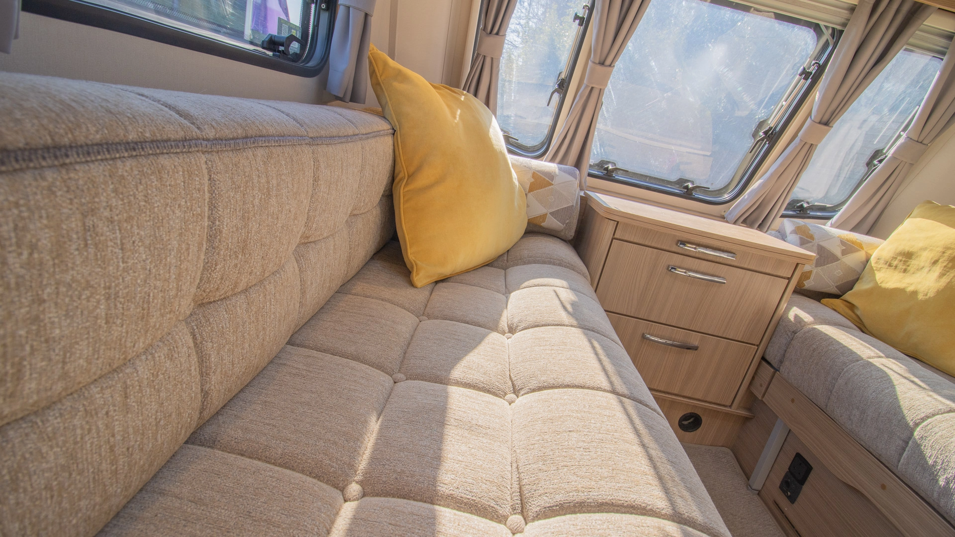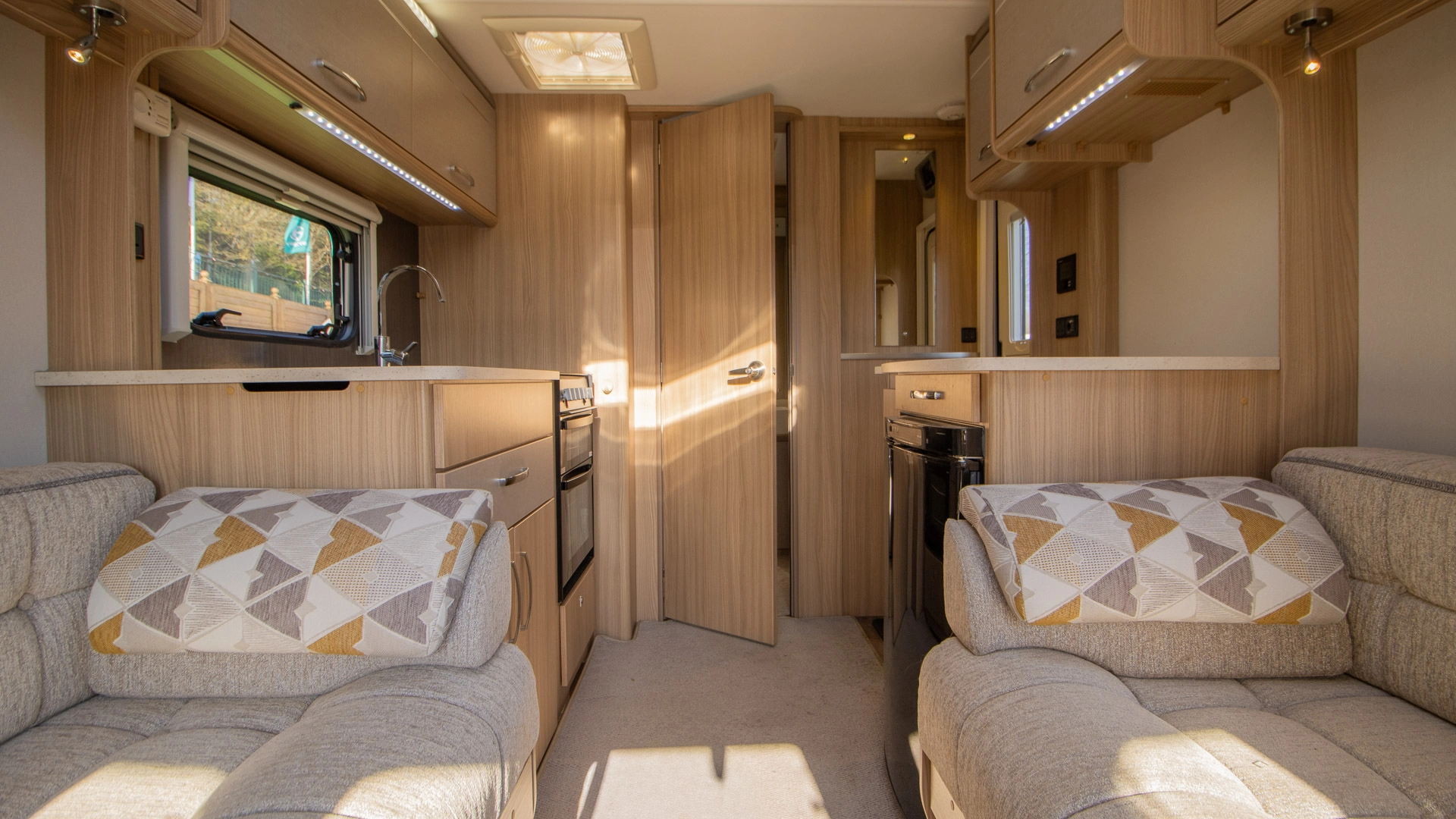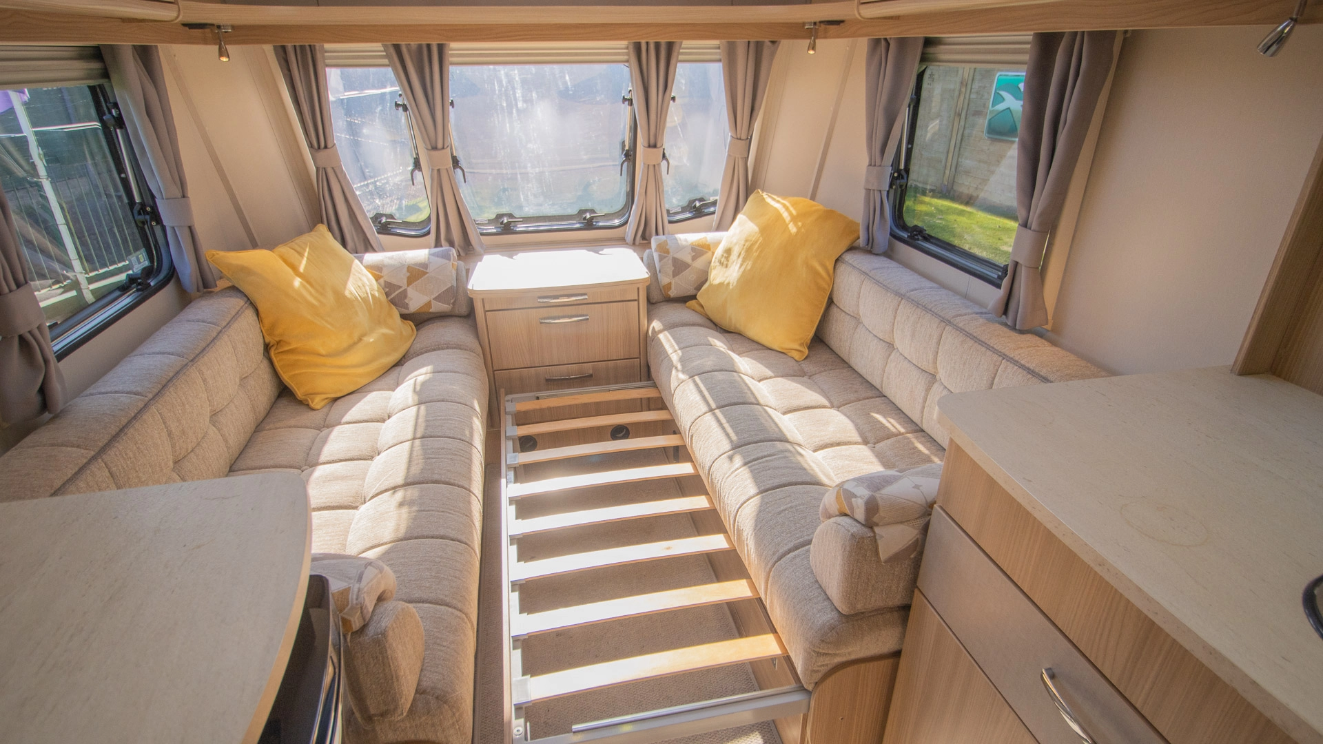Parallel Seating Bed The front lounge features twin sofas that create a bright, sociable living area during the day, and can convert into a comfortable double bed at night