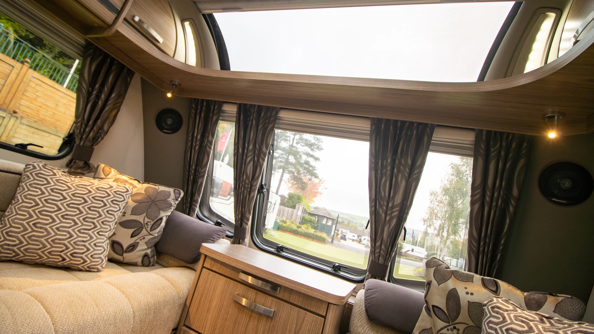 Stylish and bright interior: Large panoramic windows and rooflights fill the caravan with natural light, while elegant furnishings, soft upholstery and LED lighting create a warm, inviting atmosphere.