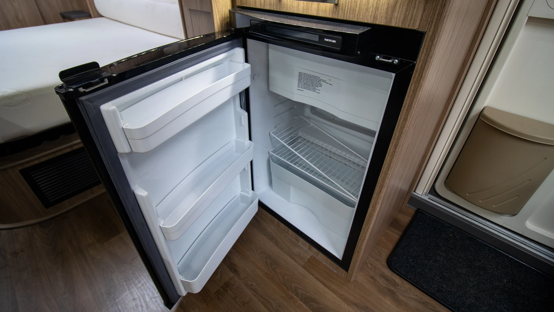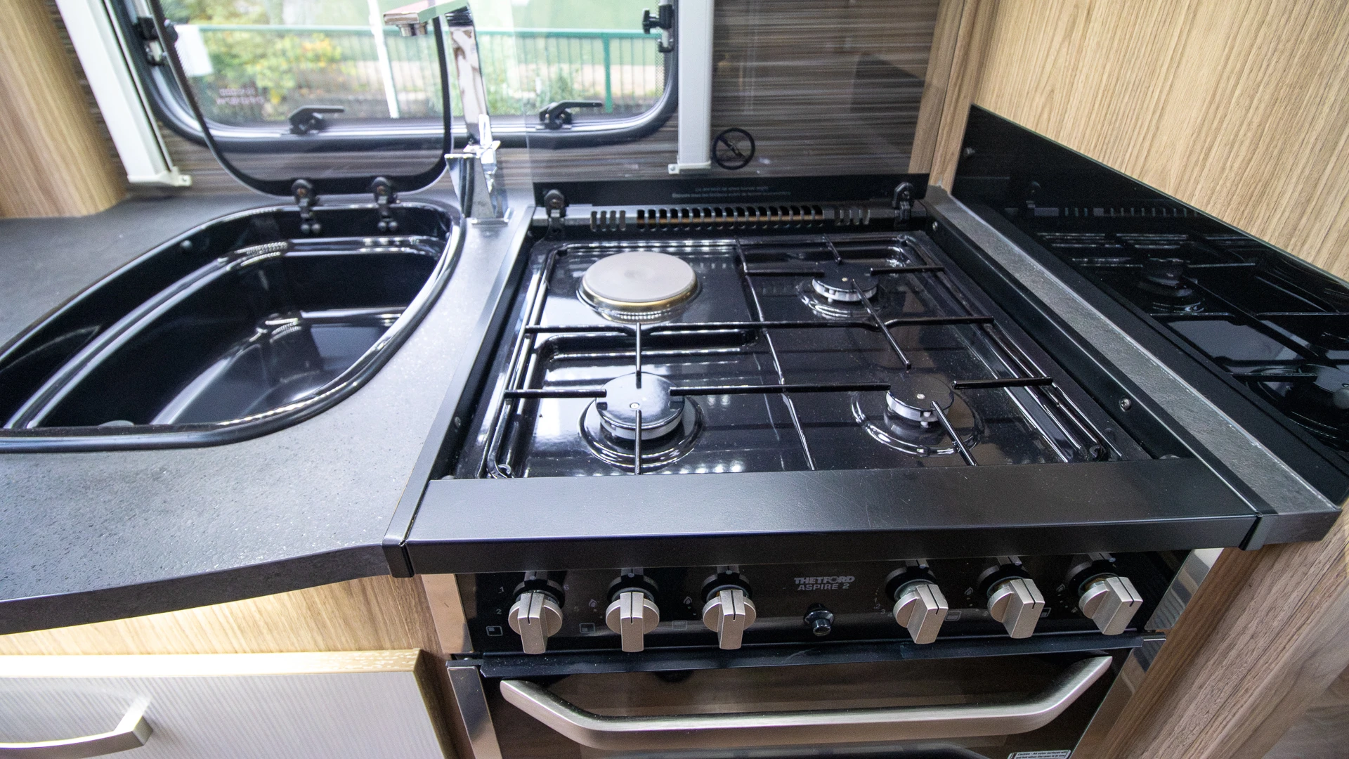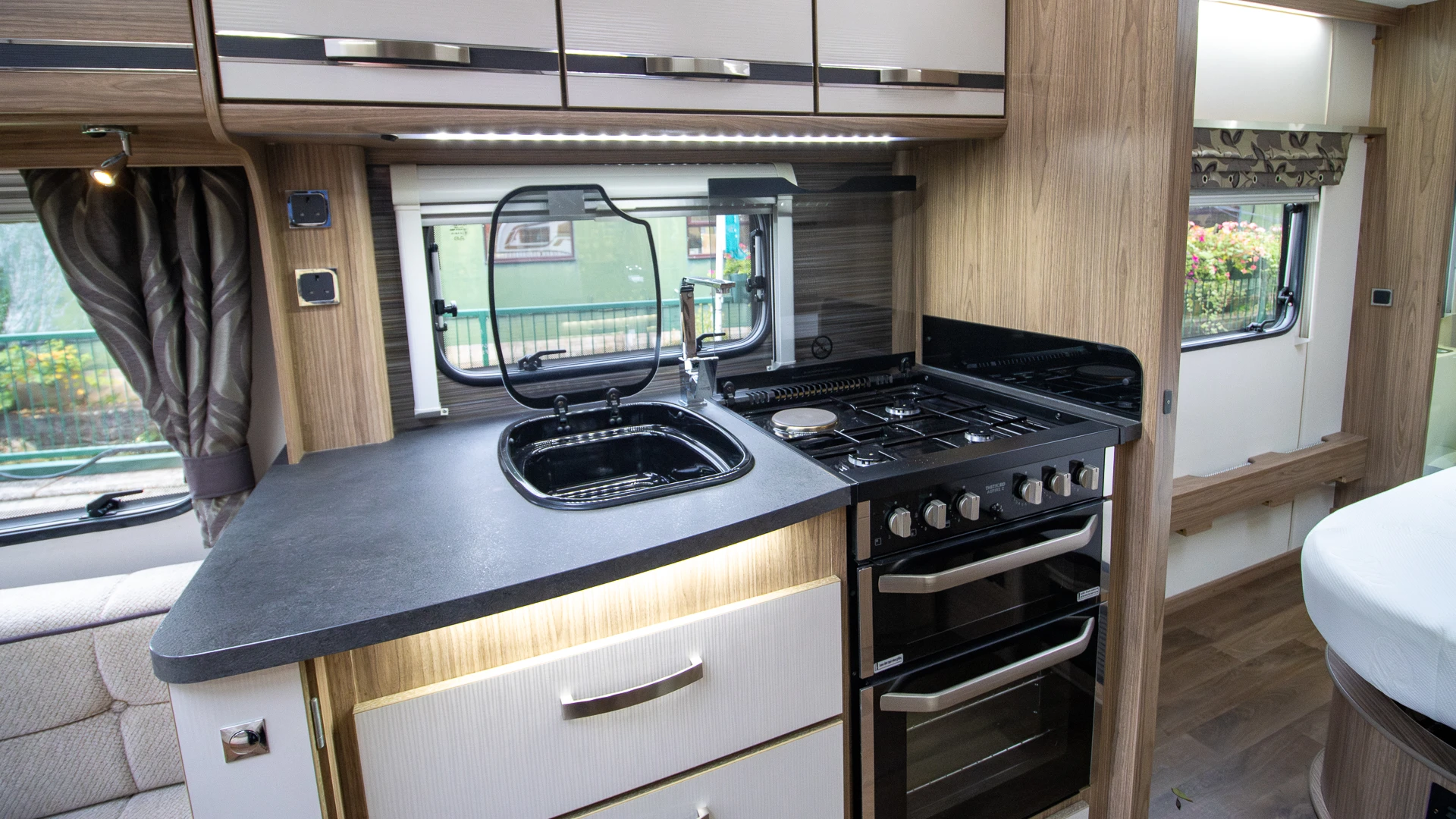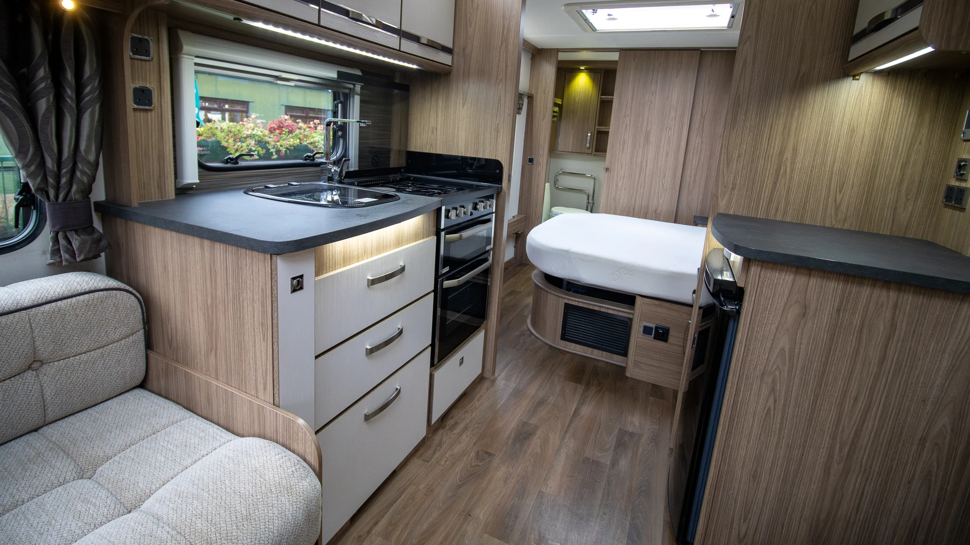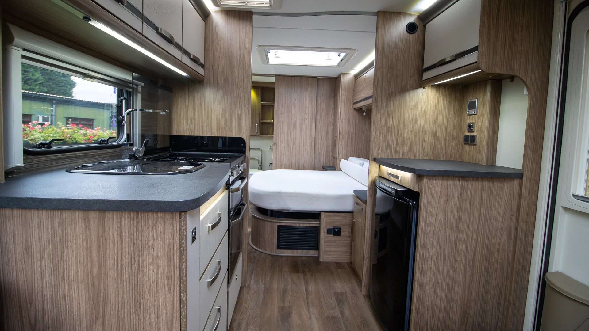 Well-equipped kitchen with extractor fan: Featuring a dual-fuel hob, oven, grill, microwave and fridge-freezer, the kitchen is ideal for preparing full meals on tour. The extractor fan helps to remove steam and cooking odours, keeping the caravan fresh and comfortable.