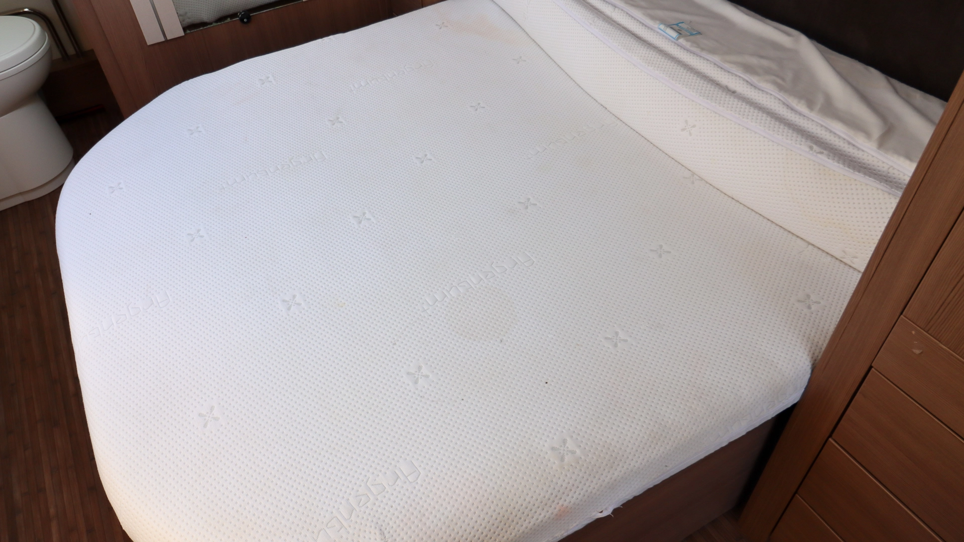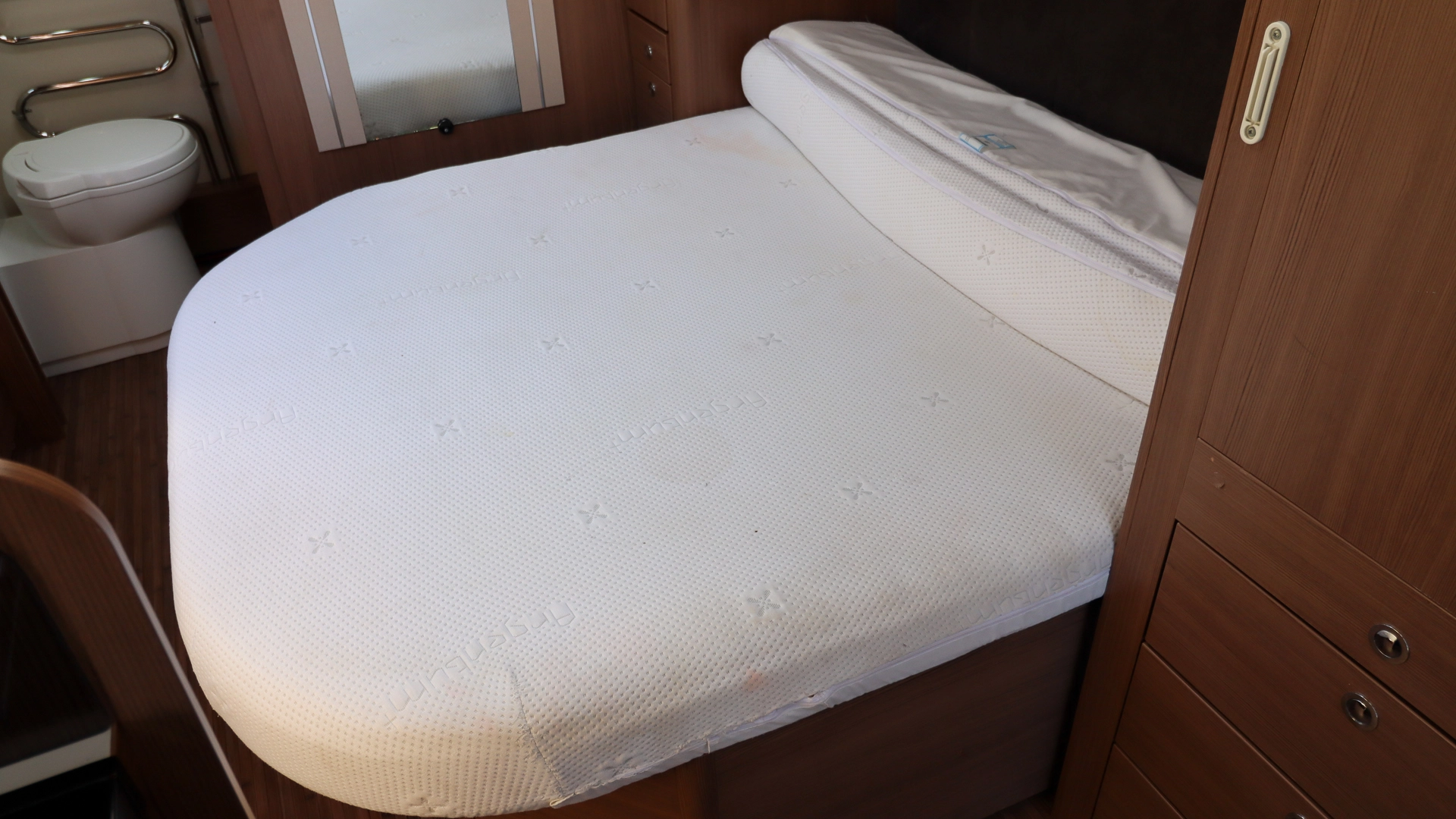 The rear of the caravan features a fixed island bed, offering hotel‑style sleeping comfort with walk‑around access and generous storage space underneath. Always ready to go with no daily setup required.