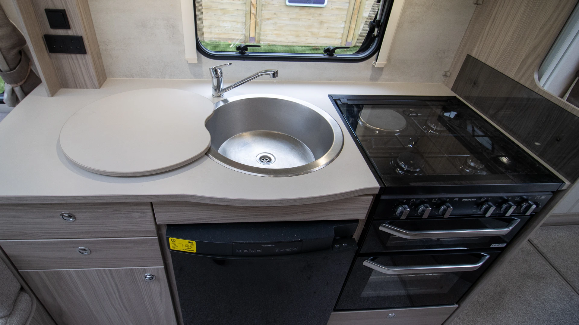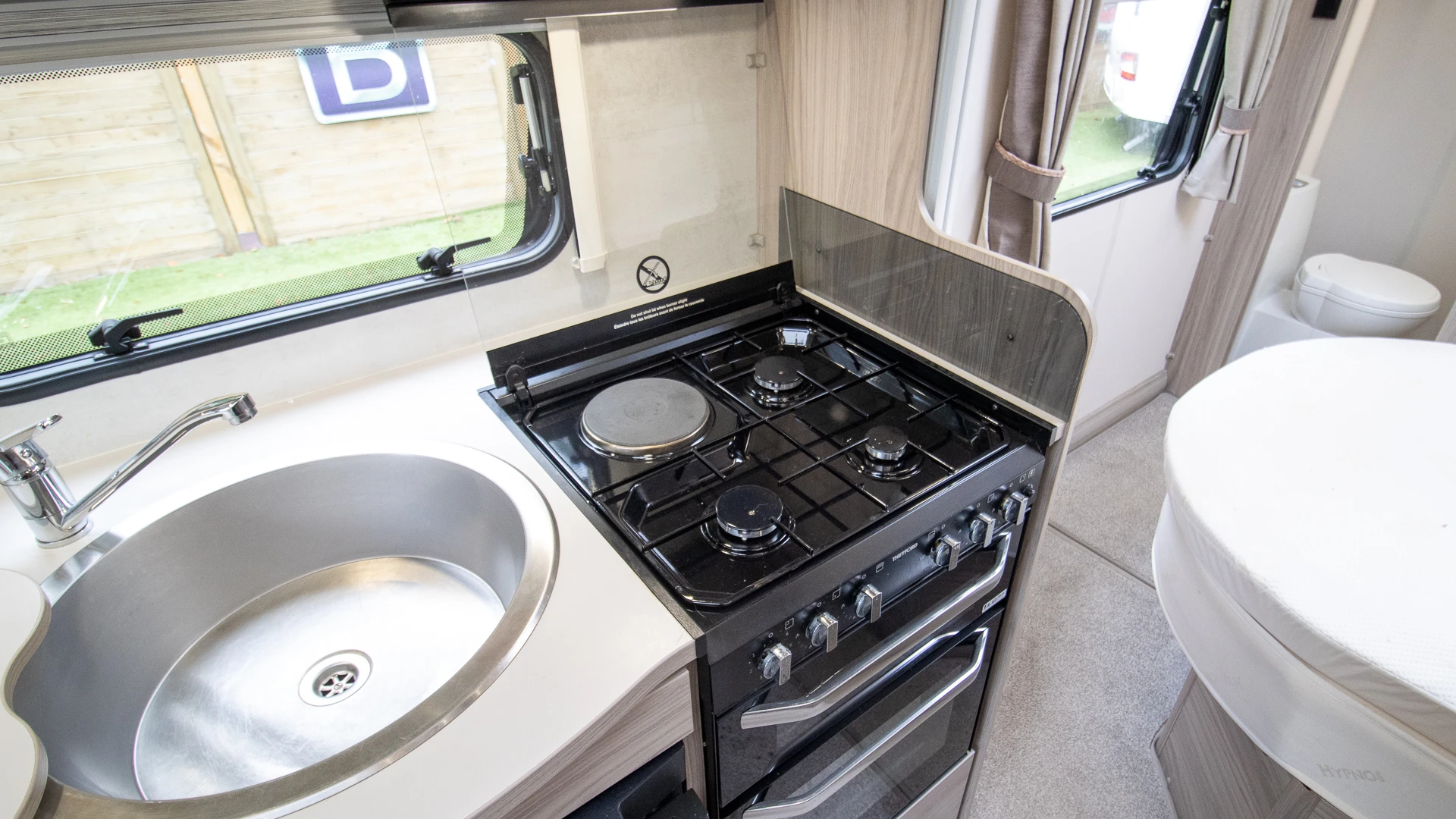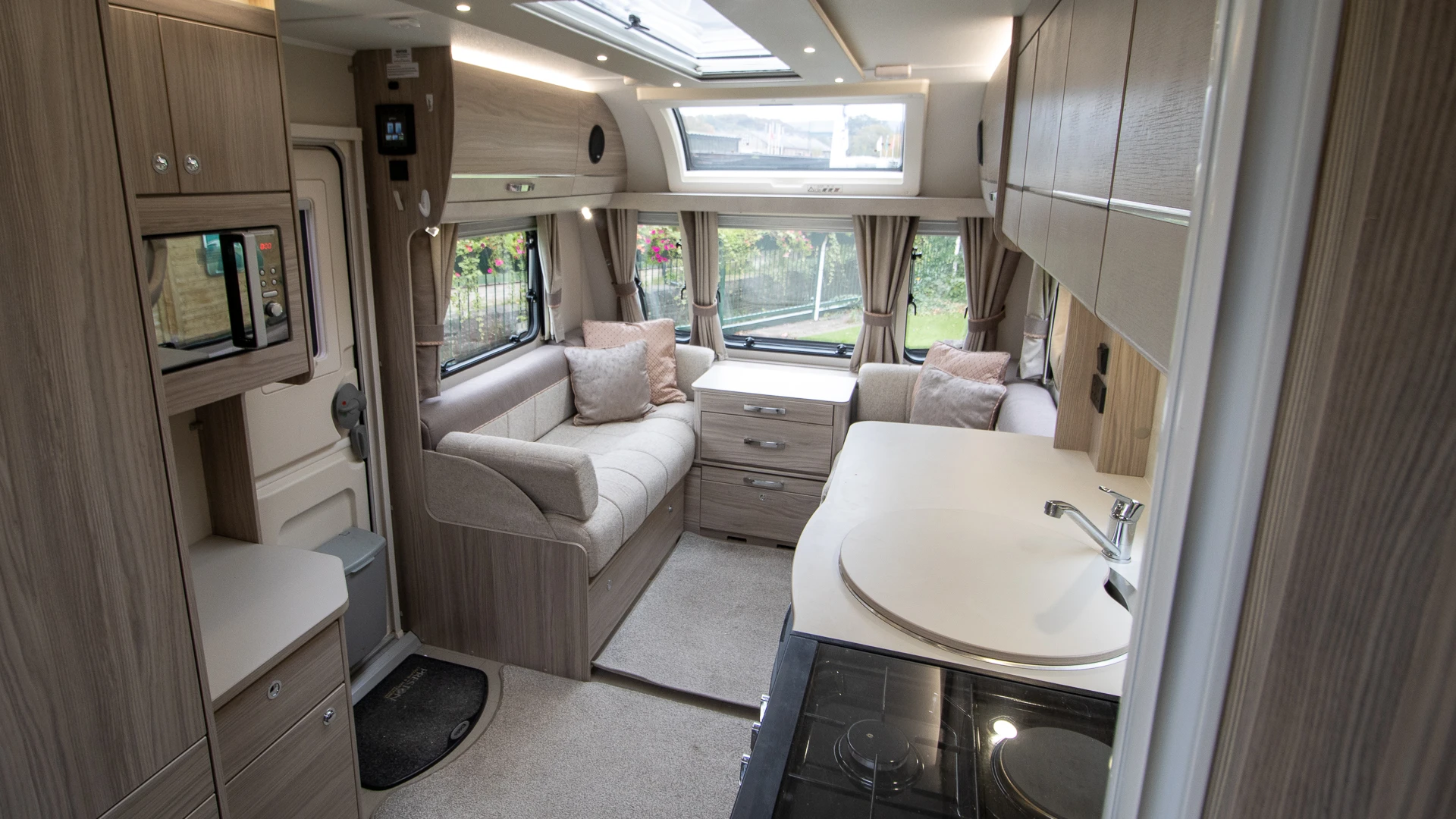Well-equipped kitchen and extractor fan: Fitted with a hob, oven, grill, microwave and fridge/freezer, the kitchen is designed for easy meal preparation on the move. Ample worktop space and smart storage make cooking simple and enjoyable. The extractor fan ensures steam and cooking odours are efficiently removed, helping to maintain fresh and pleasant living conditions inside the caravan.