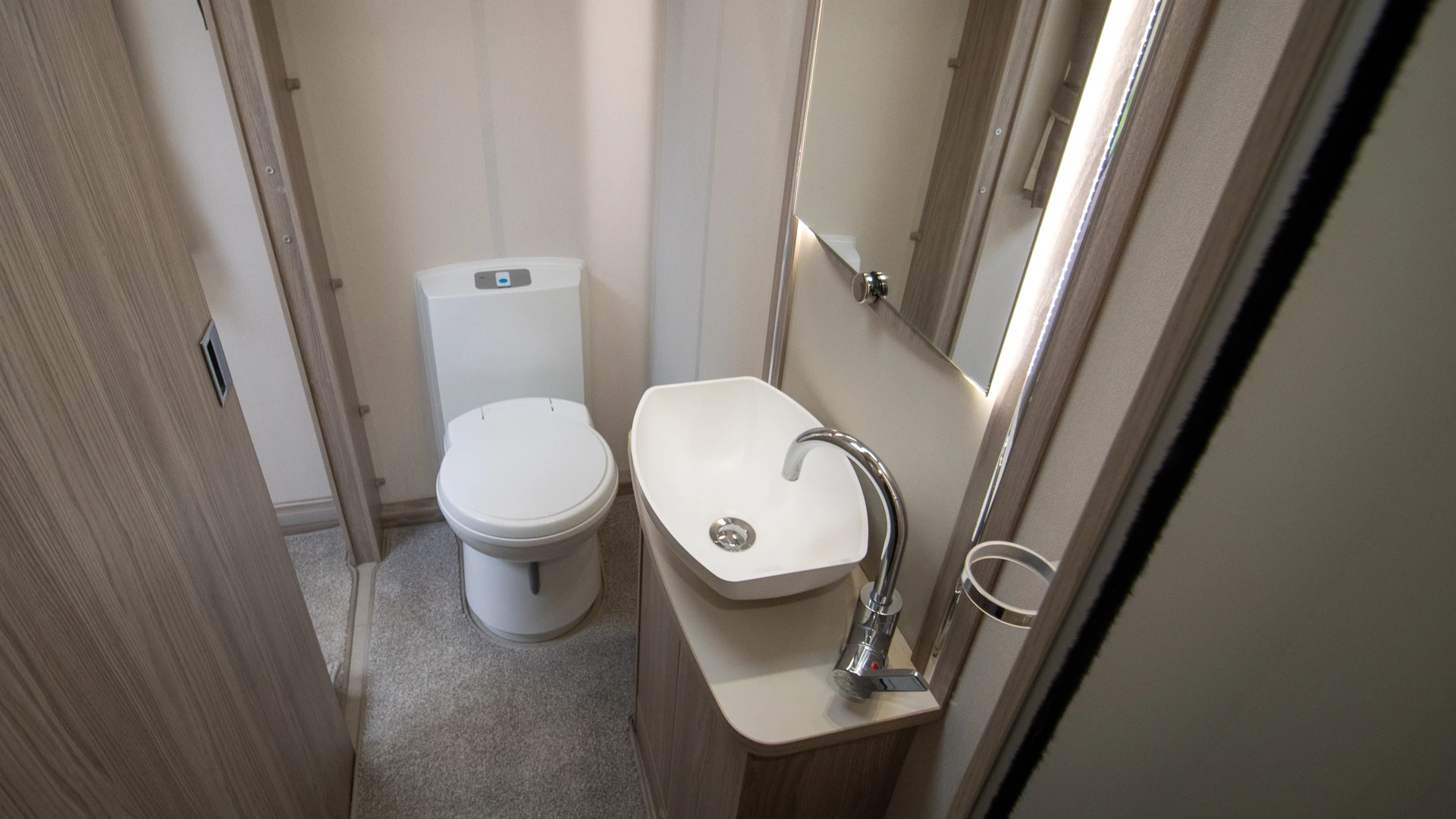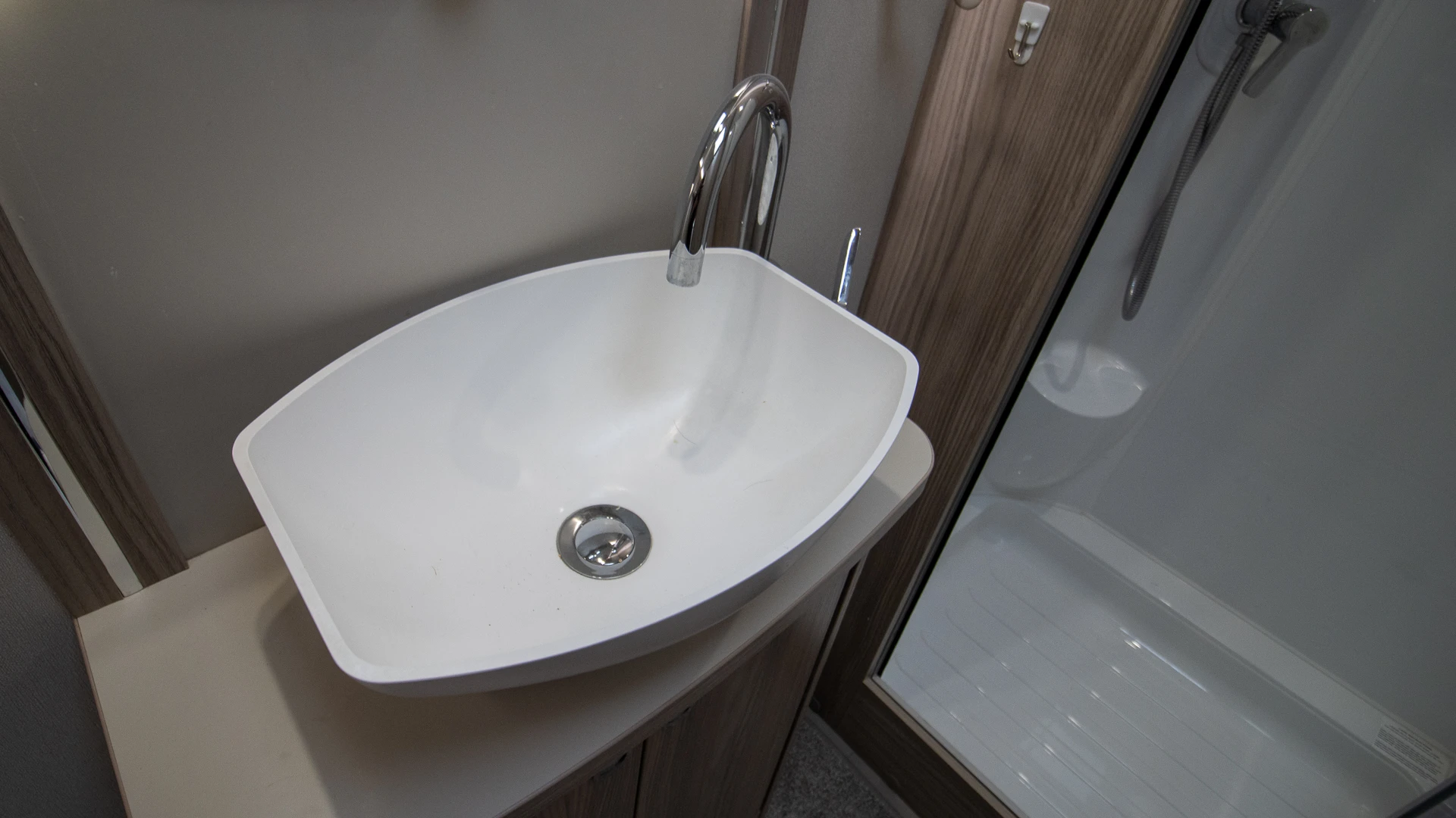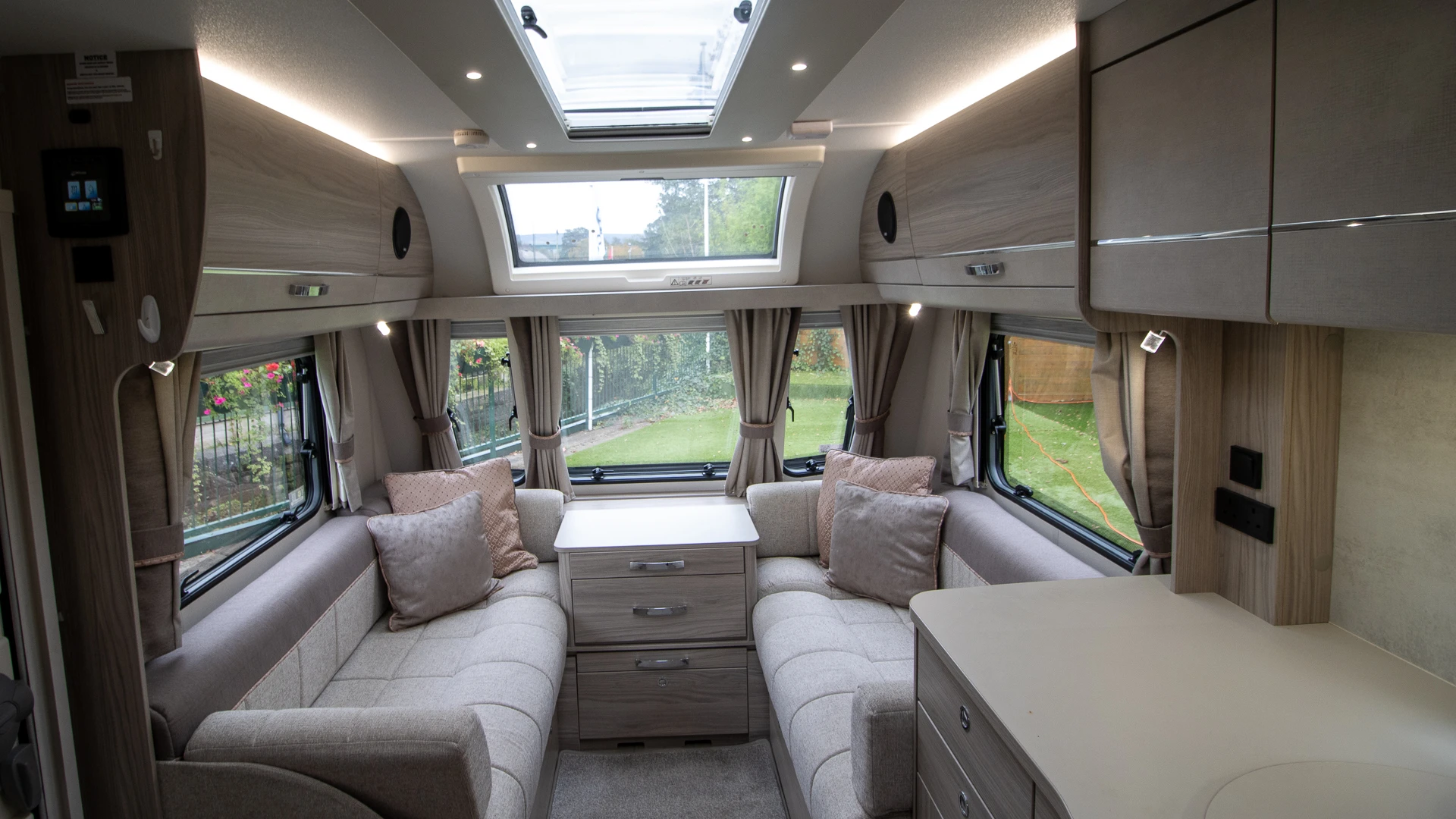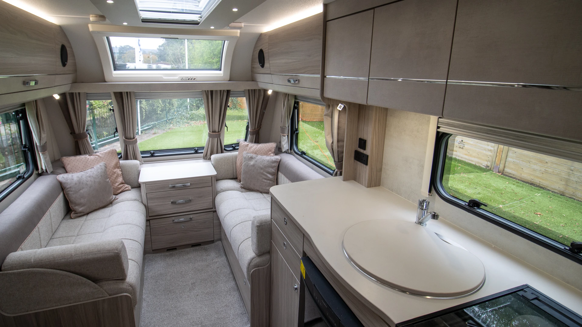 Well-equipped kitchen and extractor fan: Fitted with a hob, oven, grill, microwave and fridge/freezer, the kitchen is designed for easy meal preparation on the move. Ample worktop space and smart storage make cooking simple and enjoyable. The extractor fan ensures steam and cooking odours are efficiently removed, helping to maintain fresh and pleasant living conditions inside the caravan.