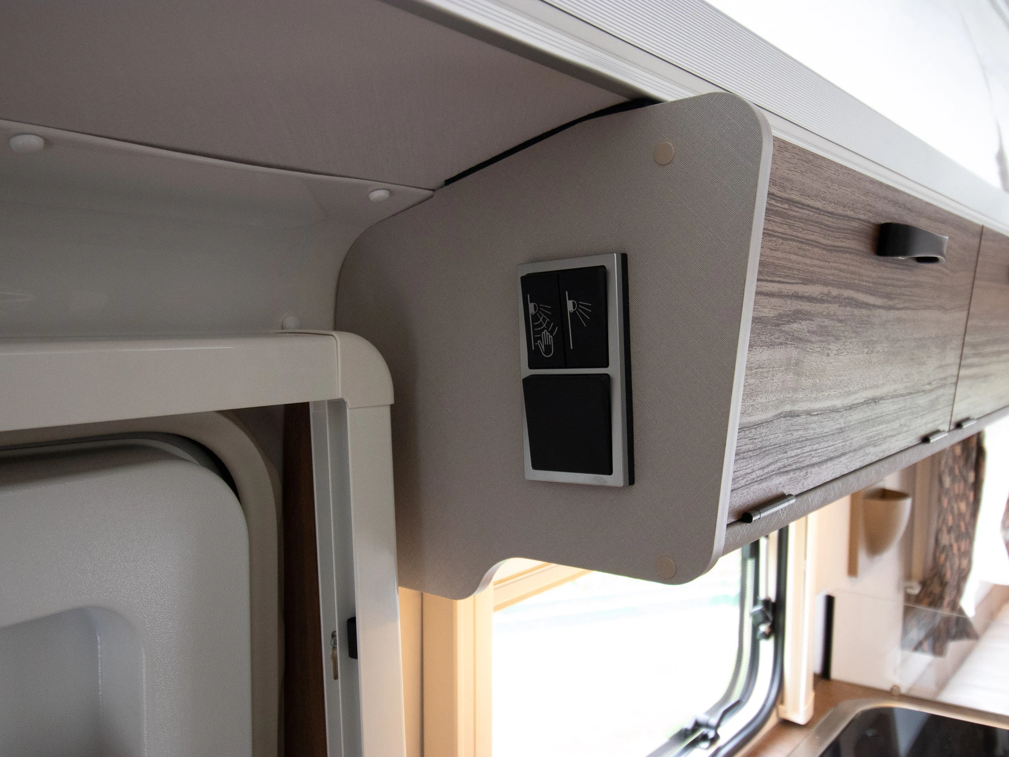 underfloor bracket, lockable Roof awning Thule Omnistor 6300 with integrated LED-lighting and adapter, white housing, 325 x 250 cm (expandable with privacy screen, wind and rain protection) External storage flap, 80 x 35 cm, RH side, rear Shower equipment with shower head and curtain 30 L freshwater tank with level indicator Electric warm water boiler with 5 l water content (300 W) Electric auxiliary heating for gas heating: Truma Ultraheat (three levels: 500 / 1,000 / 2,000 W)