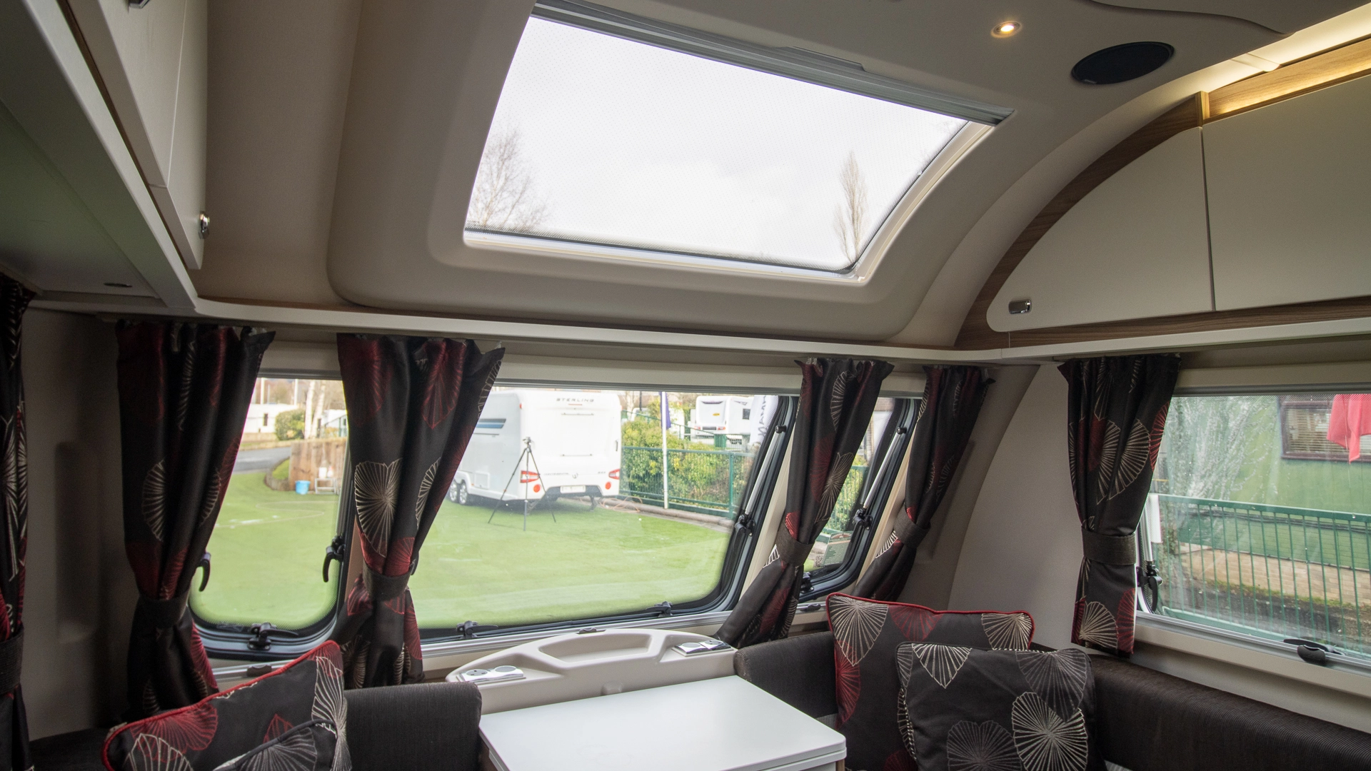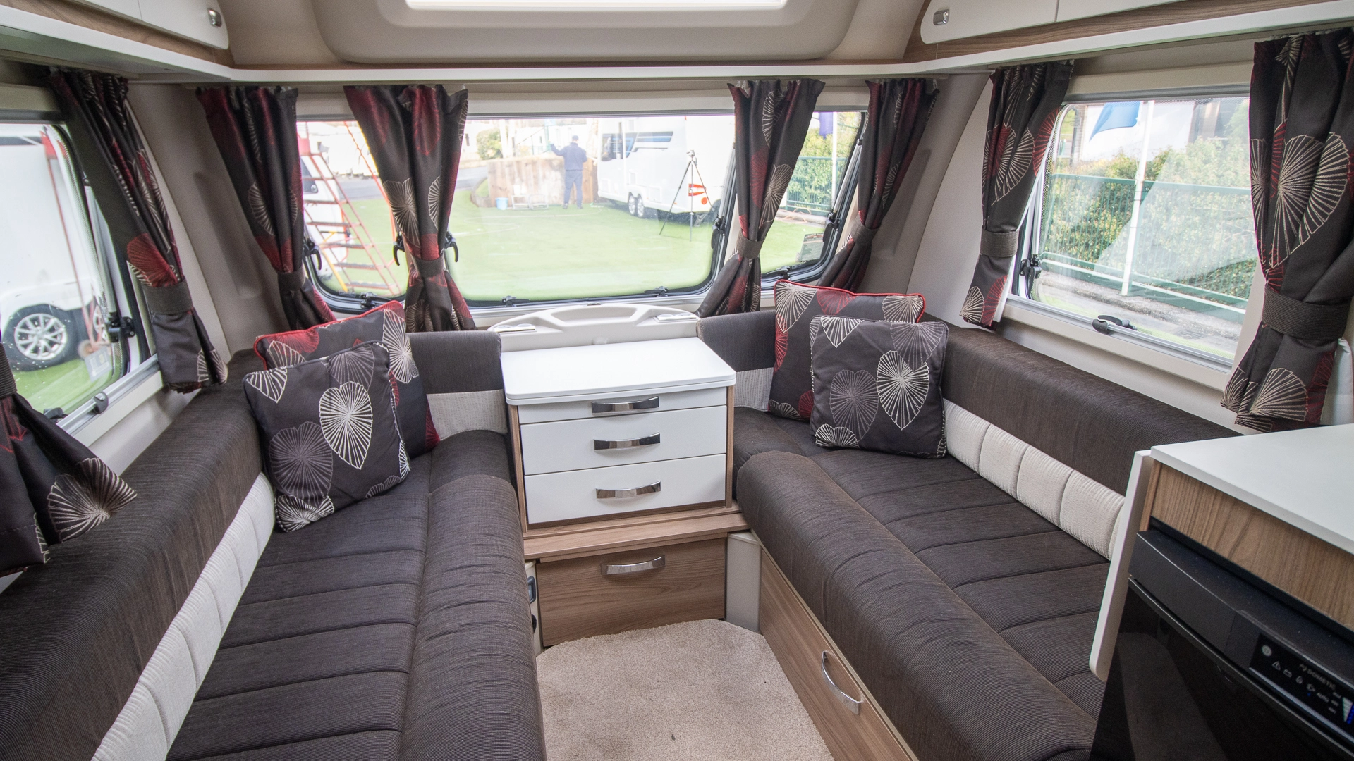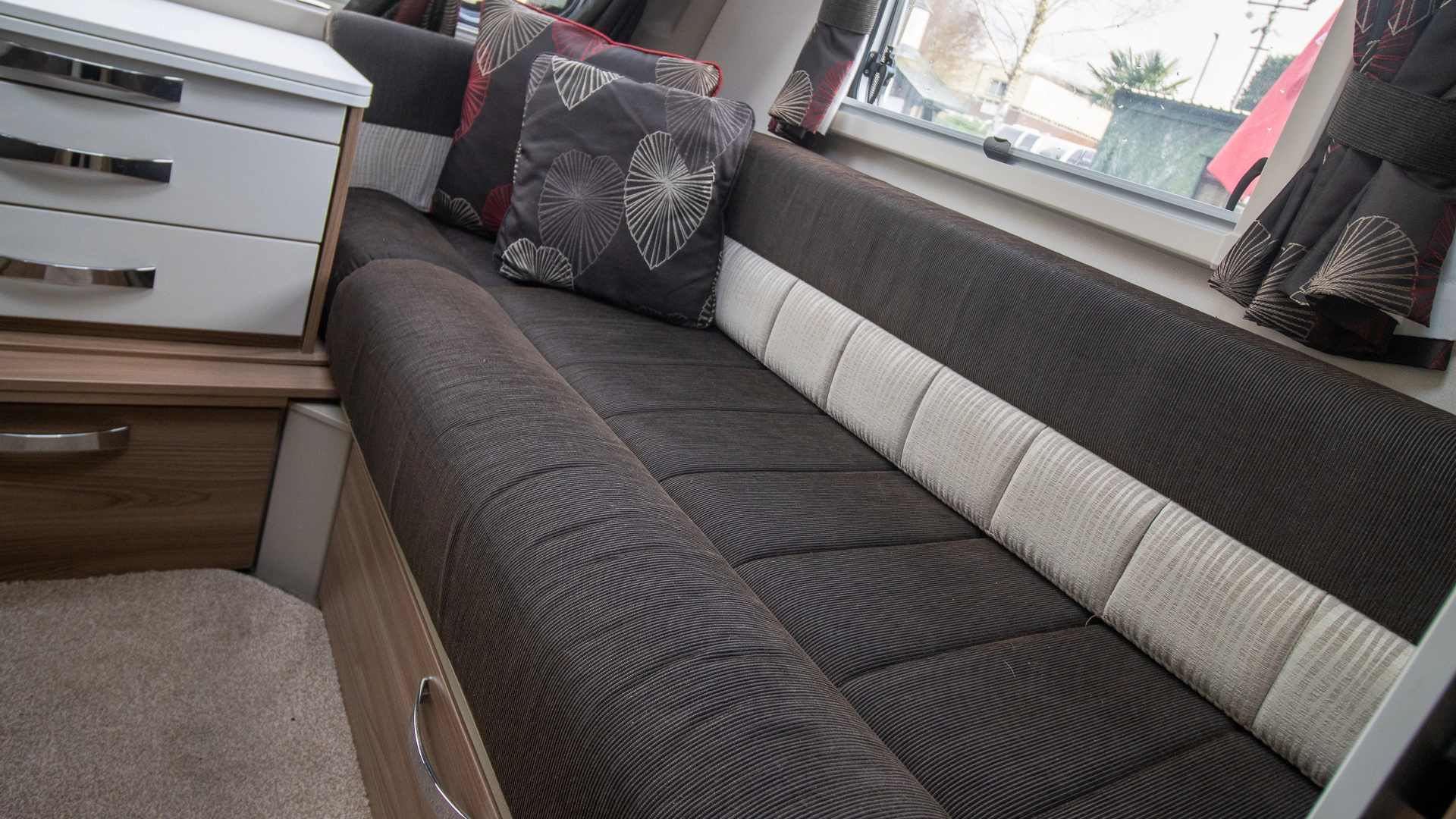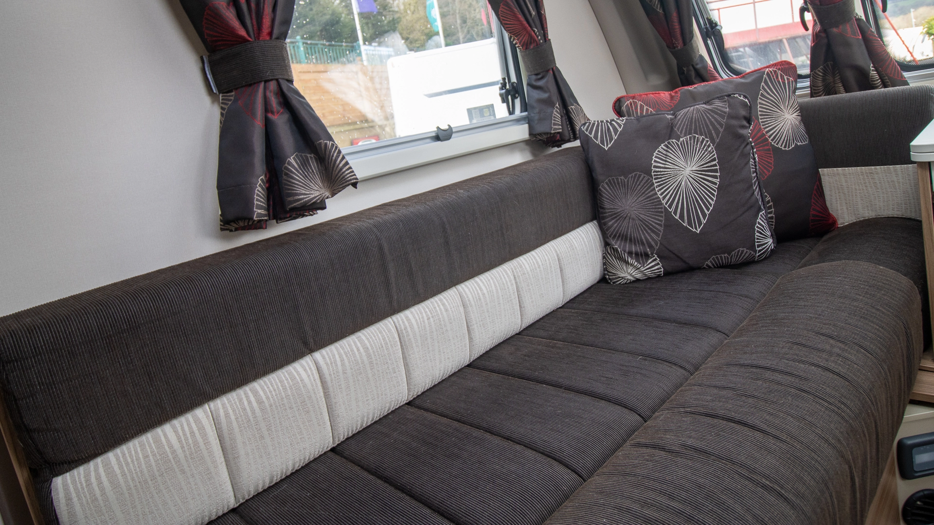 The front lounge features two long parallel sofas that create a bright and sociable space during the day. At night, these convert easily into a comfortable double bed, offering flexible sleeping arrangements without sacrificing your daytime living area.