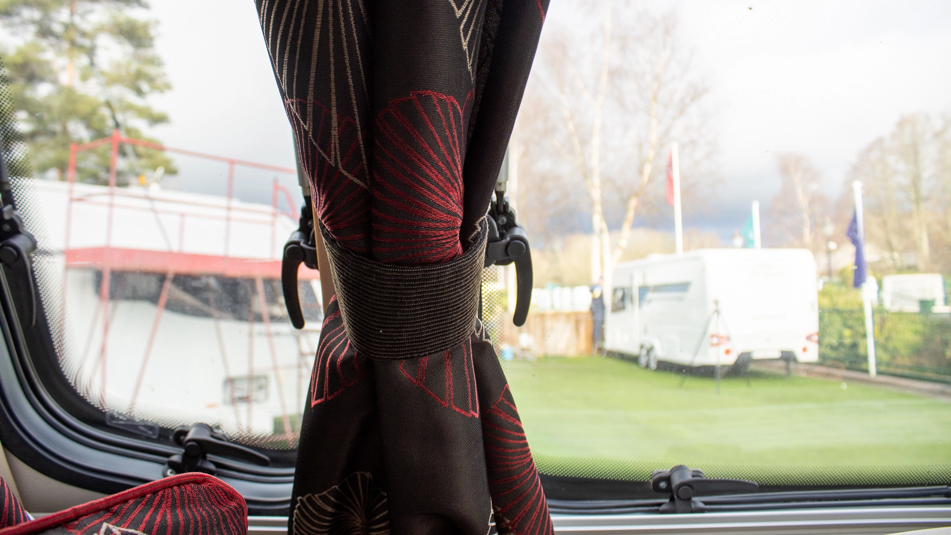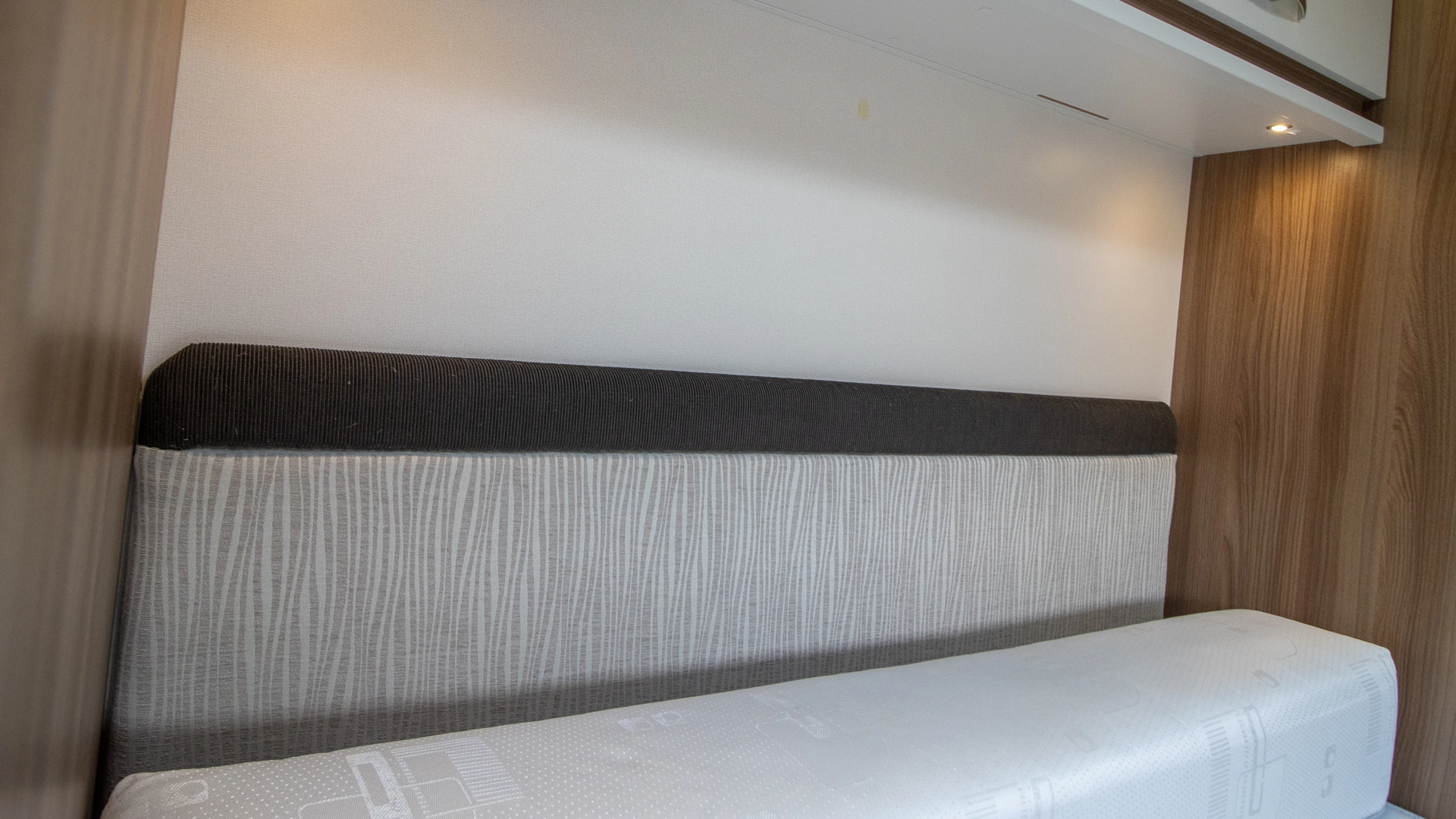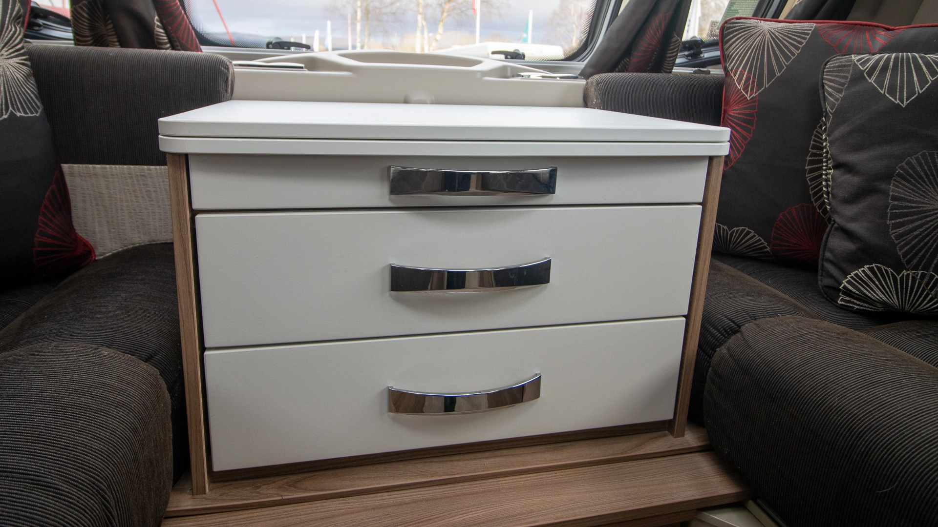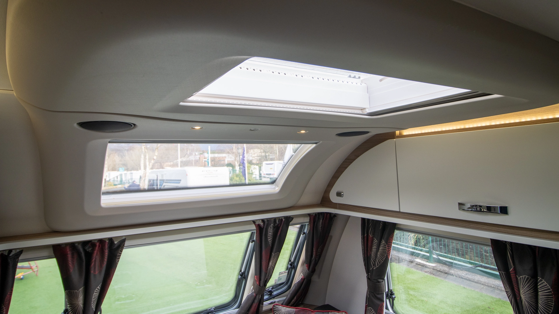 The front lounge features two long parallel sofas that create a bright and sociable space during the day. At night, these convert easily into a comfortable double bed, offering flexible sleeping arrangements without sacrificing your daytime living area.