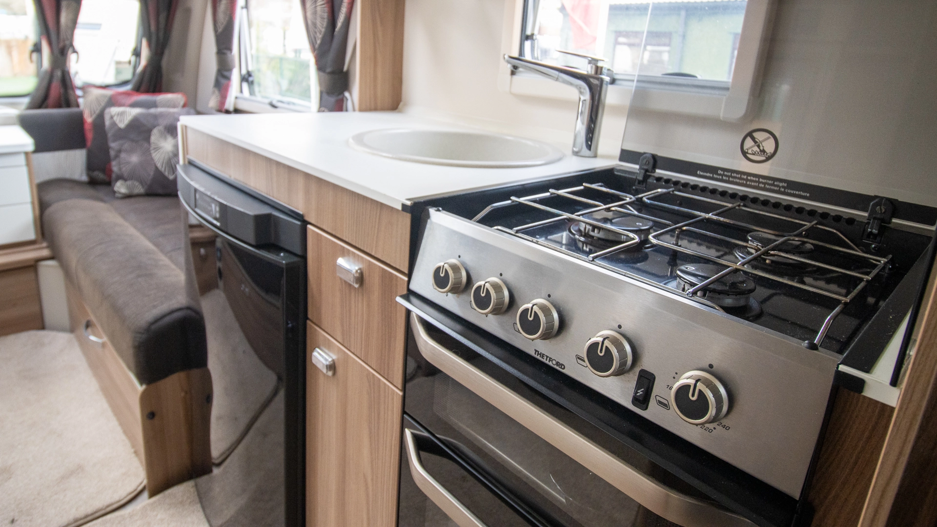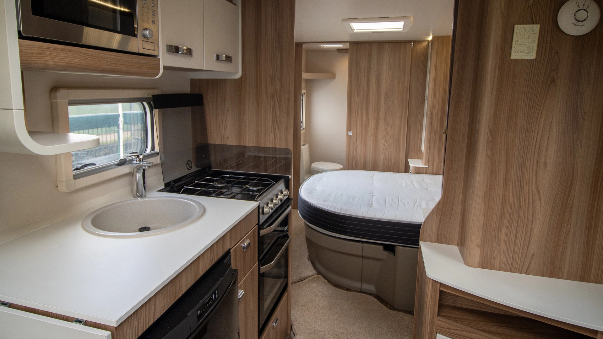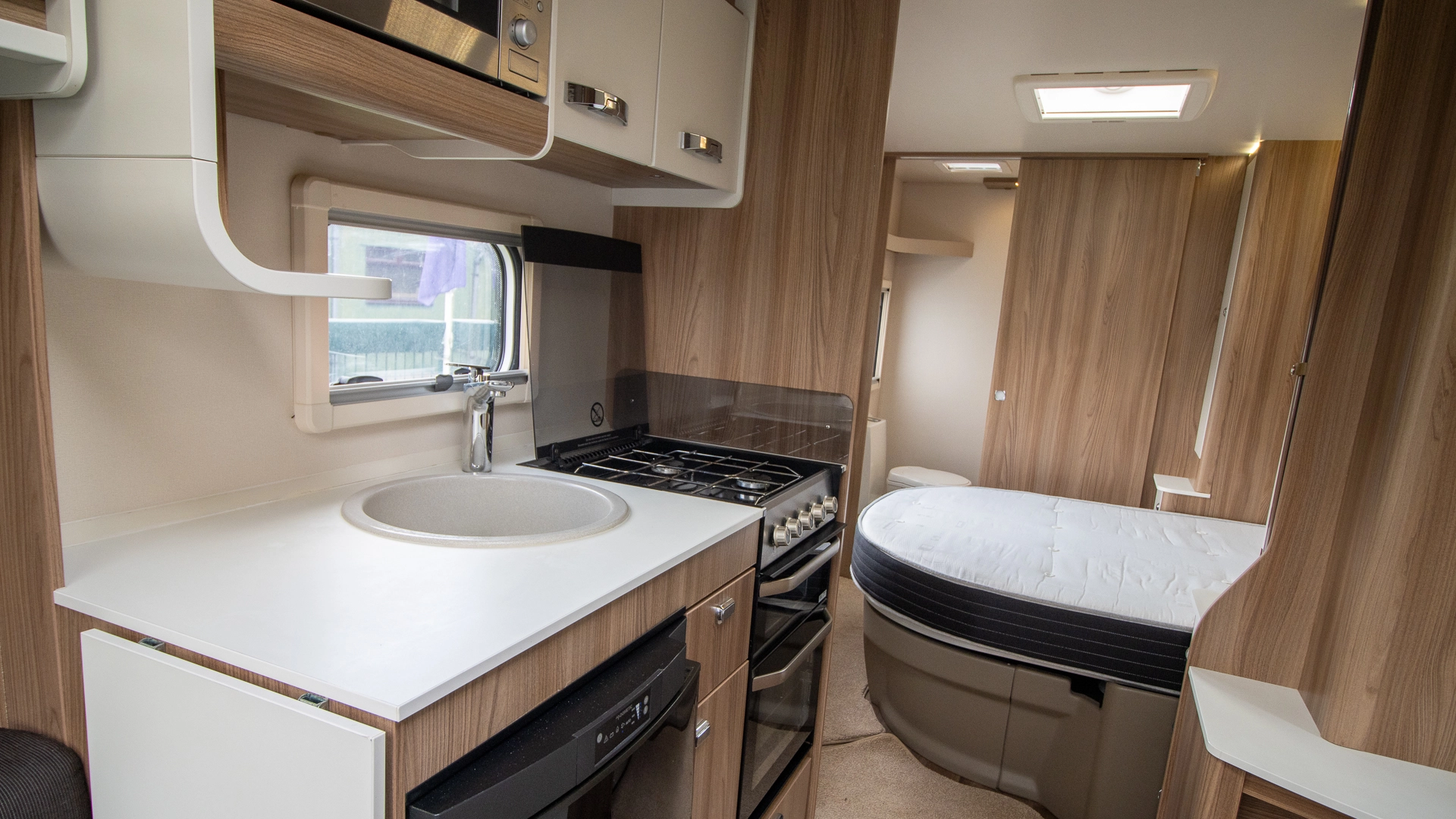 The kitchen comes complete with a microwave, hob, oven and grill, fridge‑freezer and plenty of worktop and storage space, allowing you to prepare full meals on the road.