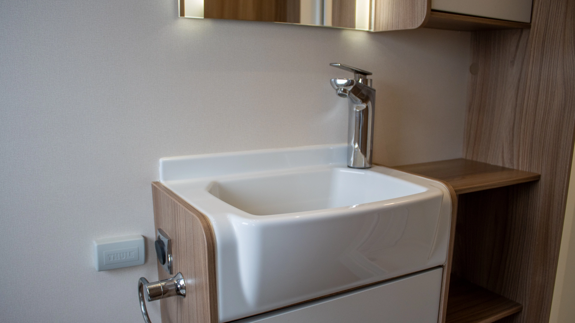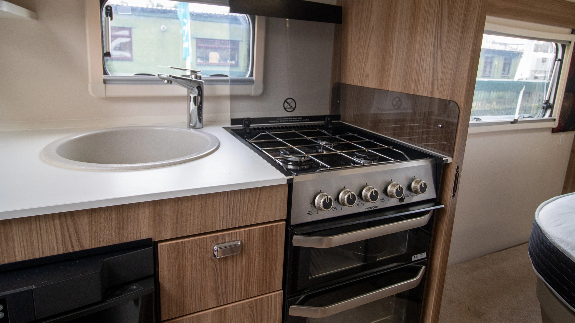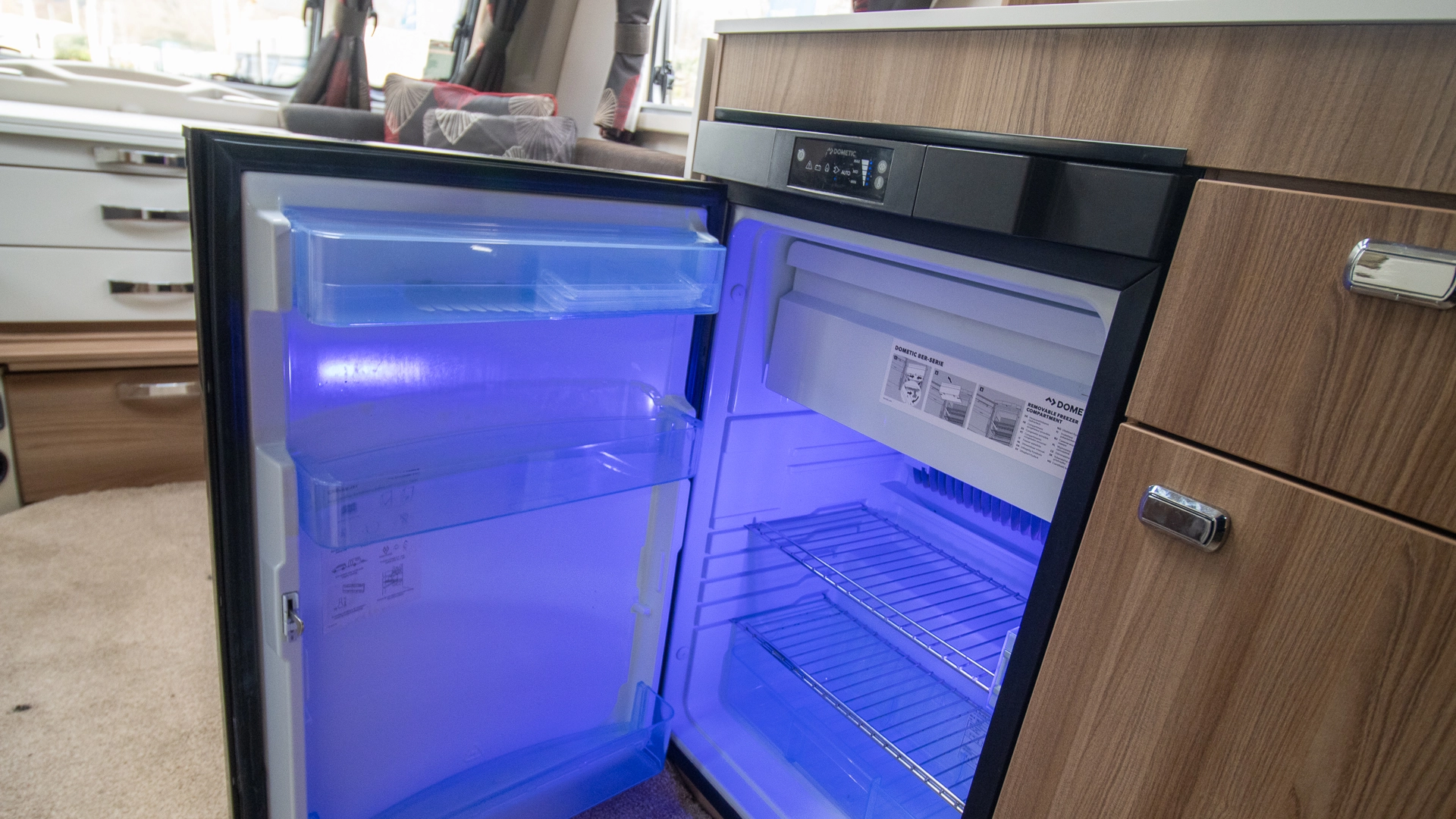 The kitchen comes complete with a microwave, hob, oven and grill, fridge‑freezer and plenty of worktop and storage space, allowing you to prepare full meals on the road.
