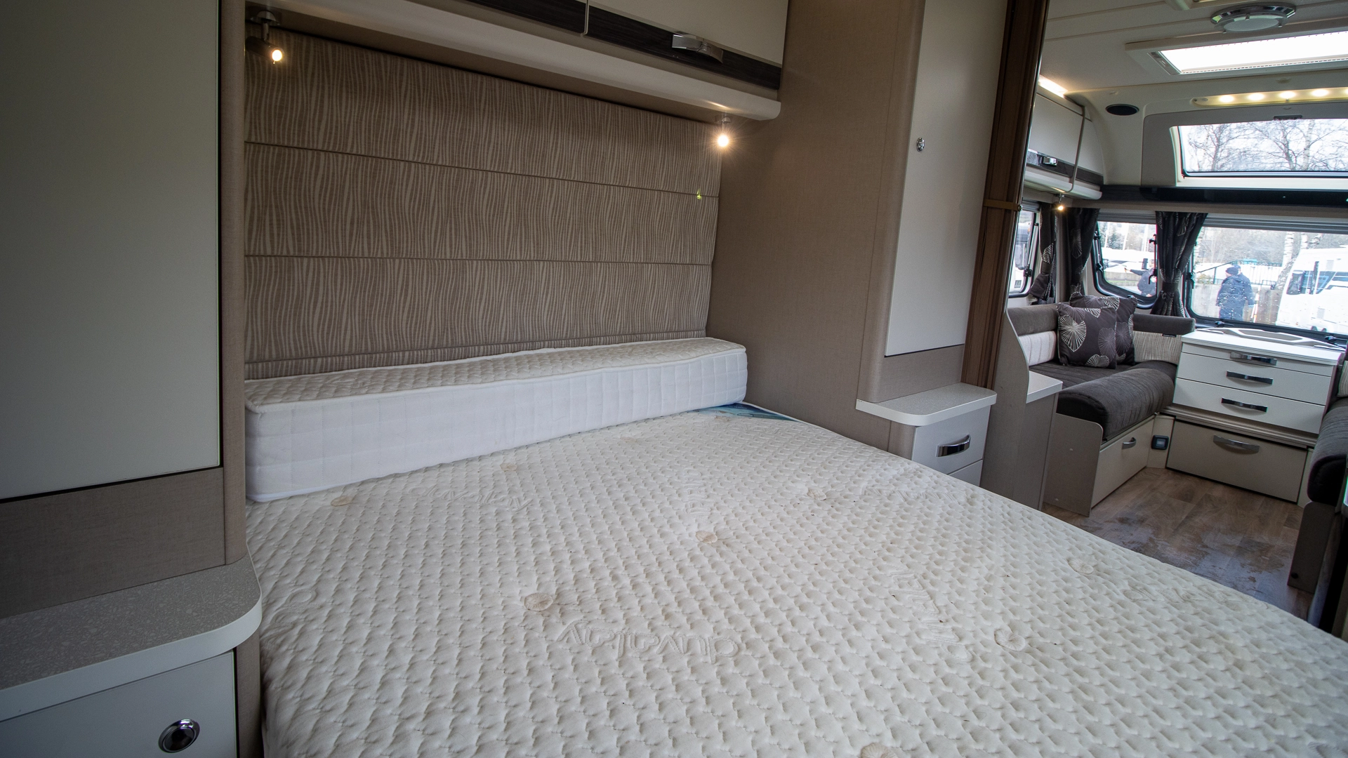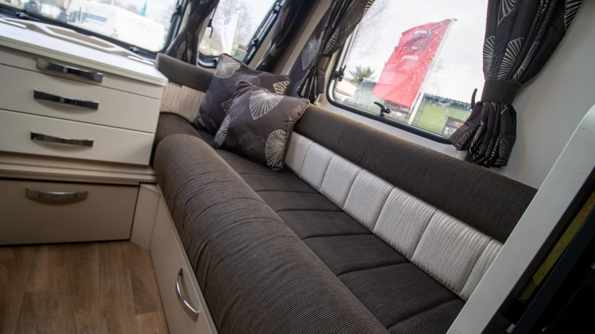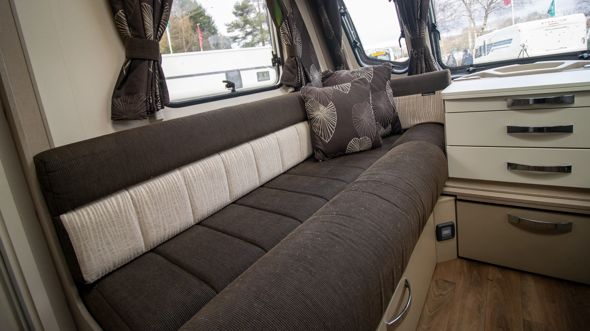 The front lounge features two long parallel sofas that create a bright and sociable space during the day. At night, these convert easily into a comfortable double bed, offering flexible sleeping arrangements without sacrificing your daytime living area.