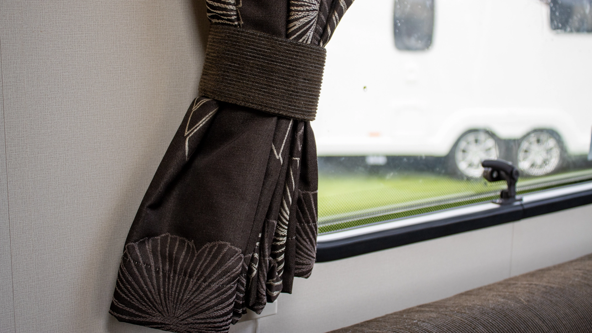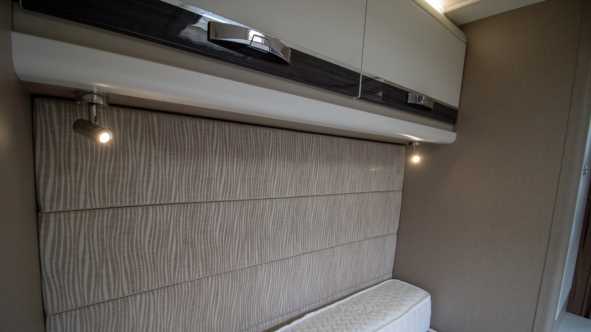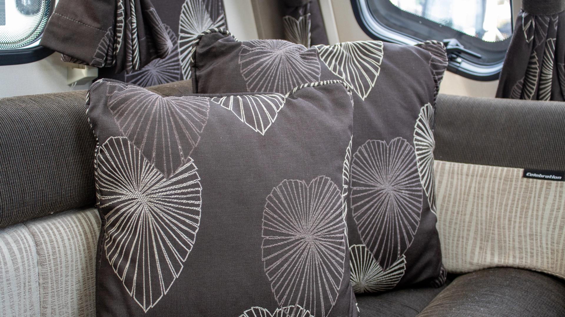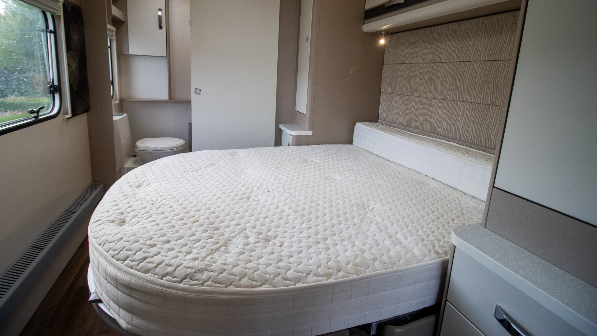 The front lounge features two long parallel sofas that create a bright and sociable space during the day. At night, these convert easily into a comfortable double bed, offering flexible sleeping arrangements without sacrificing your daytime living area.