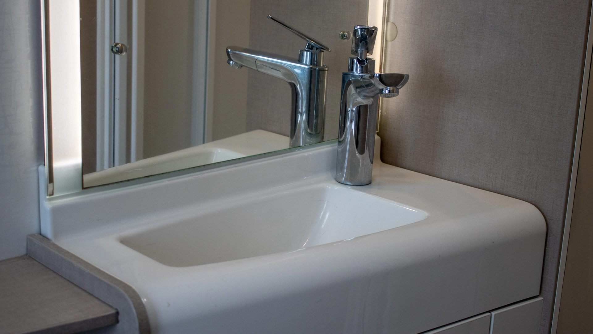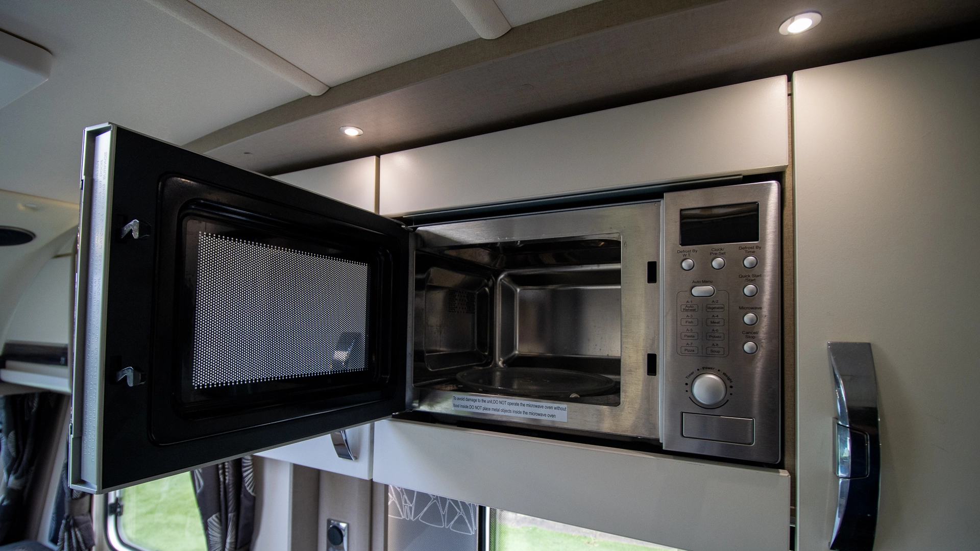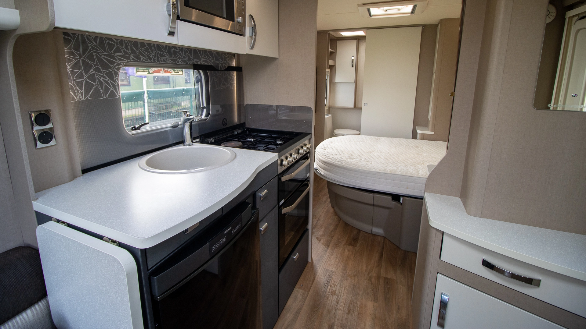 The kitchen comes complete with a microwave, hob, oven and grill, fridge‑freezer and plenty of worktop and storage space, allowing you to prepare full meals on the road.