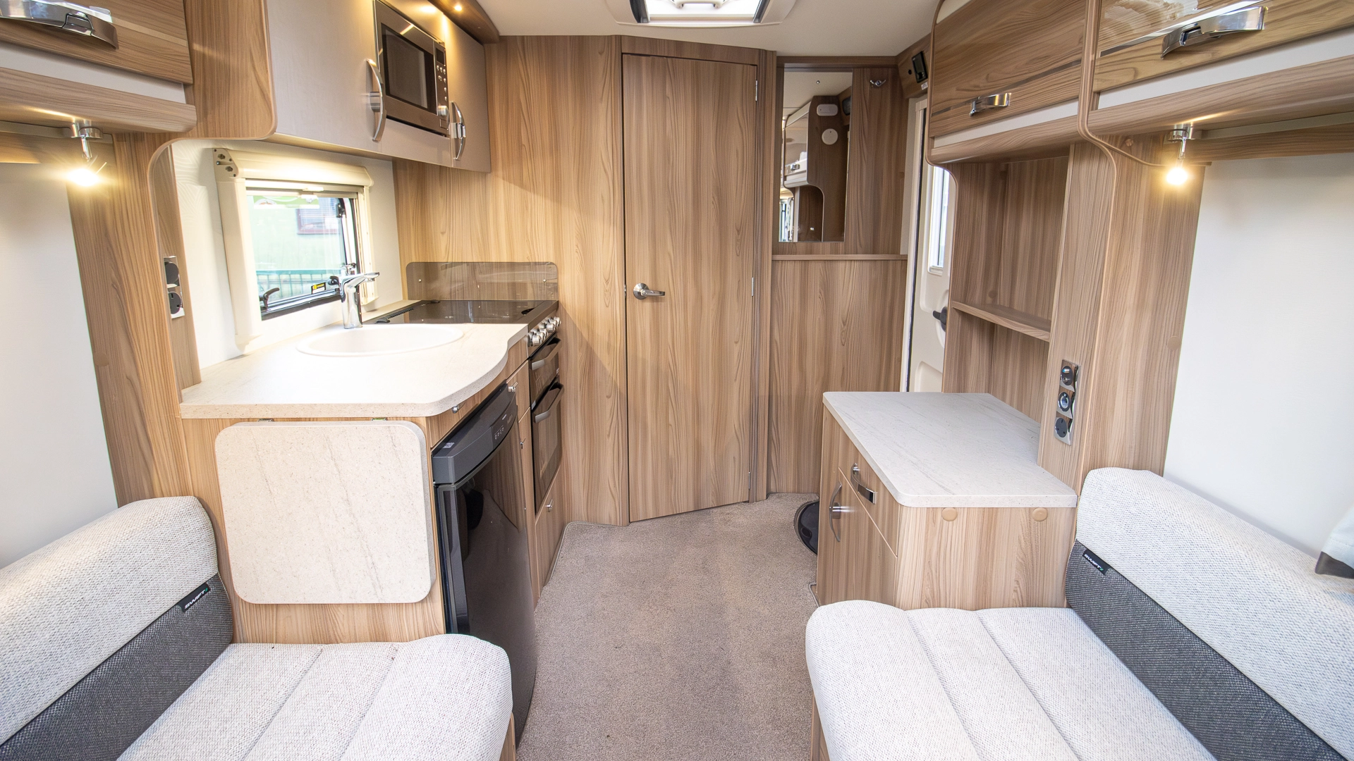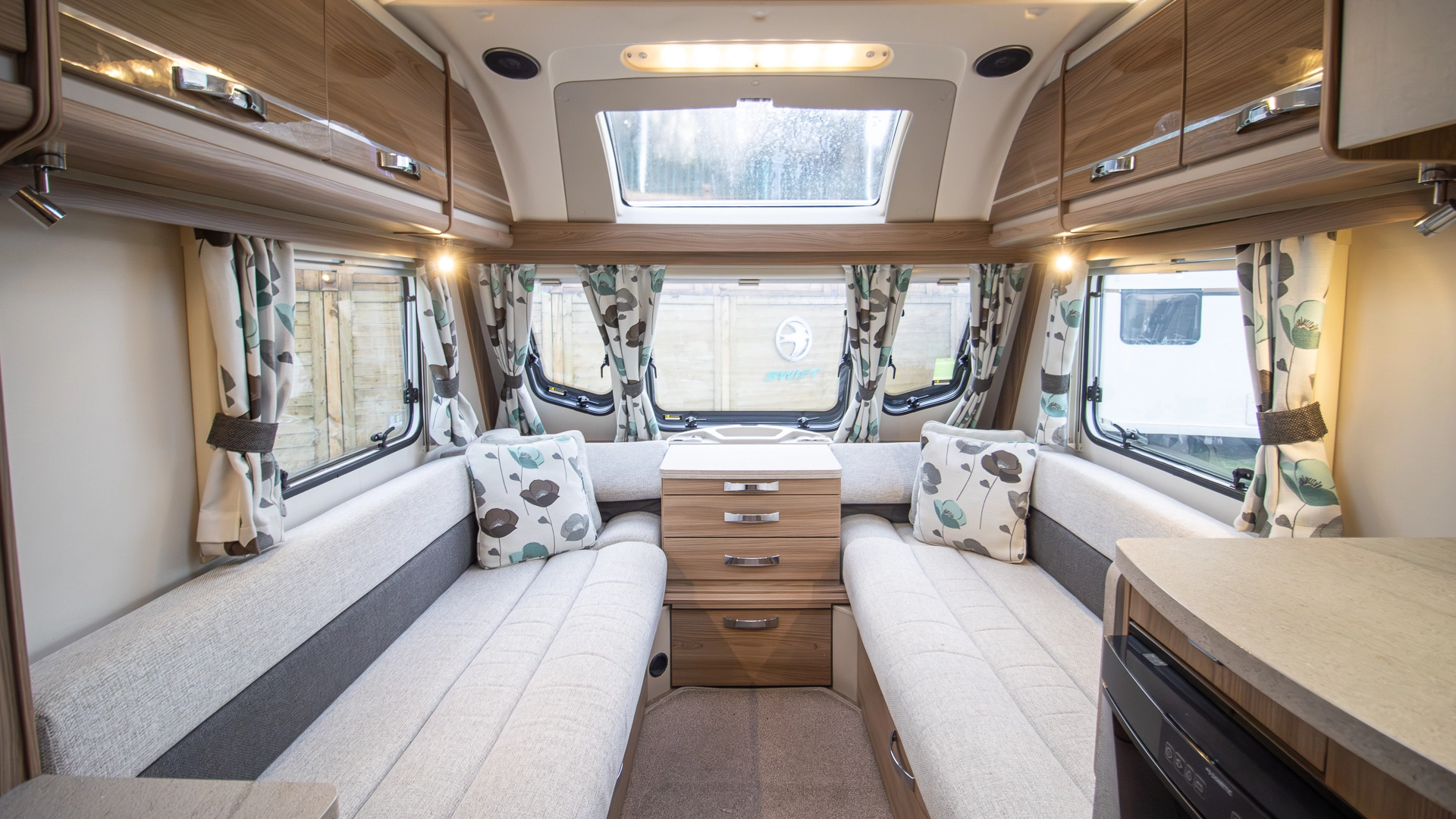 The front lounge features twin sofas that create a bright, sociable living area during the day, and can convert into a comfortable double bed at night.