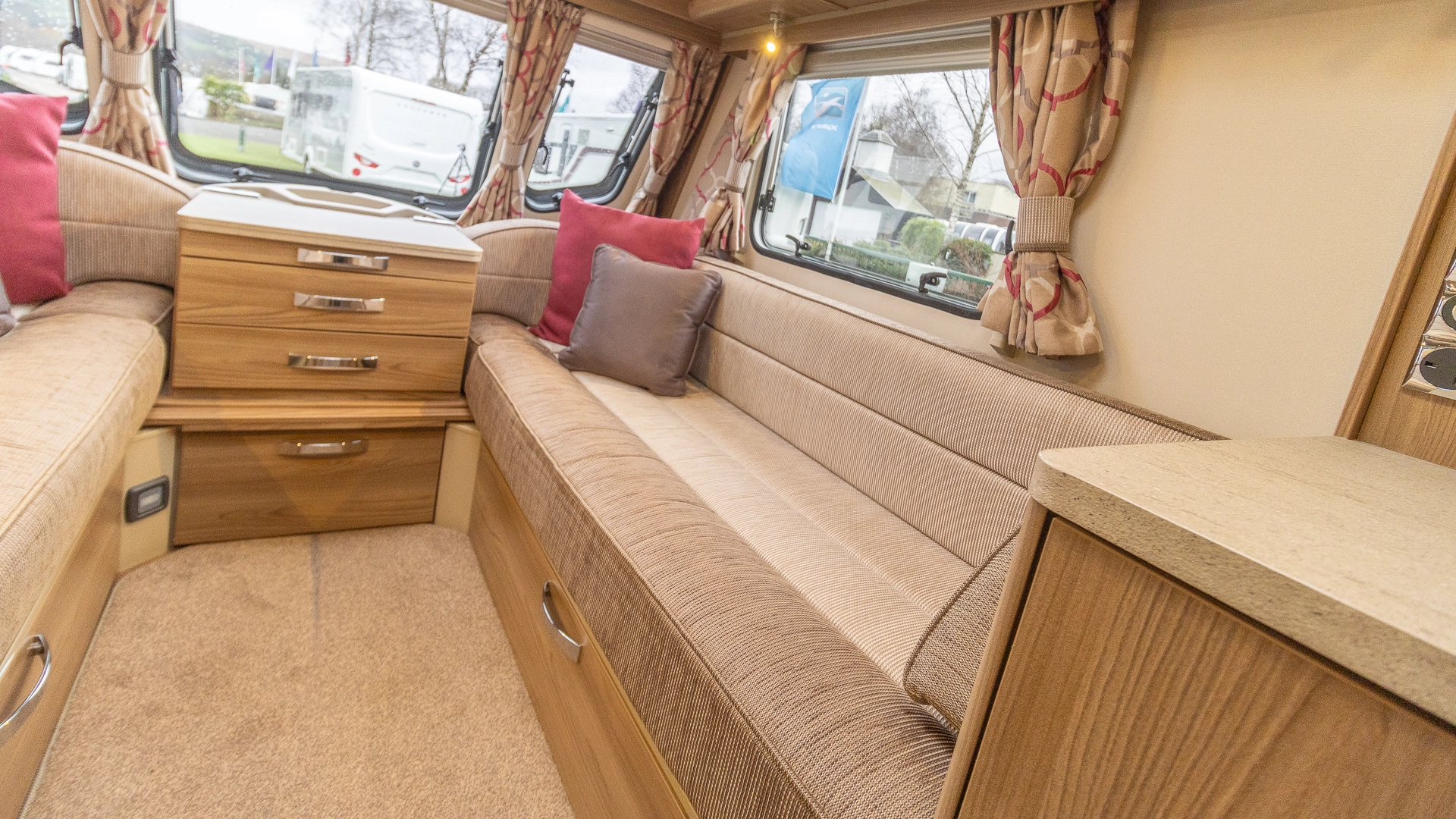 The front lounge features twin sofas that create a bright, sociable living area during the day, and can convert into a comfortable double bed at night.