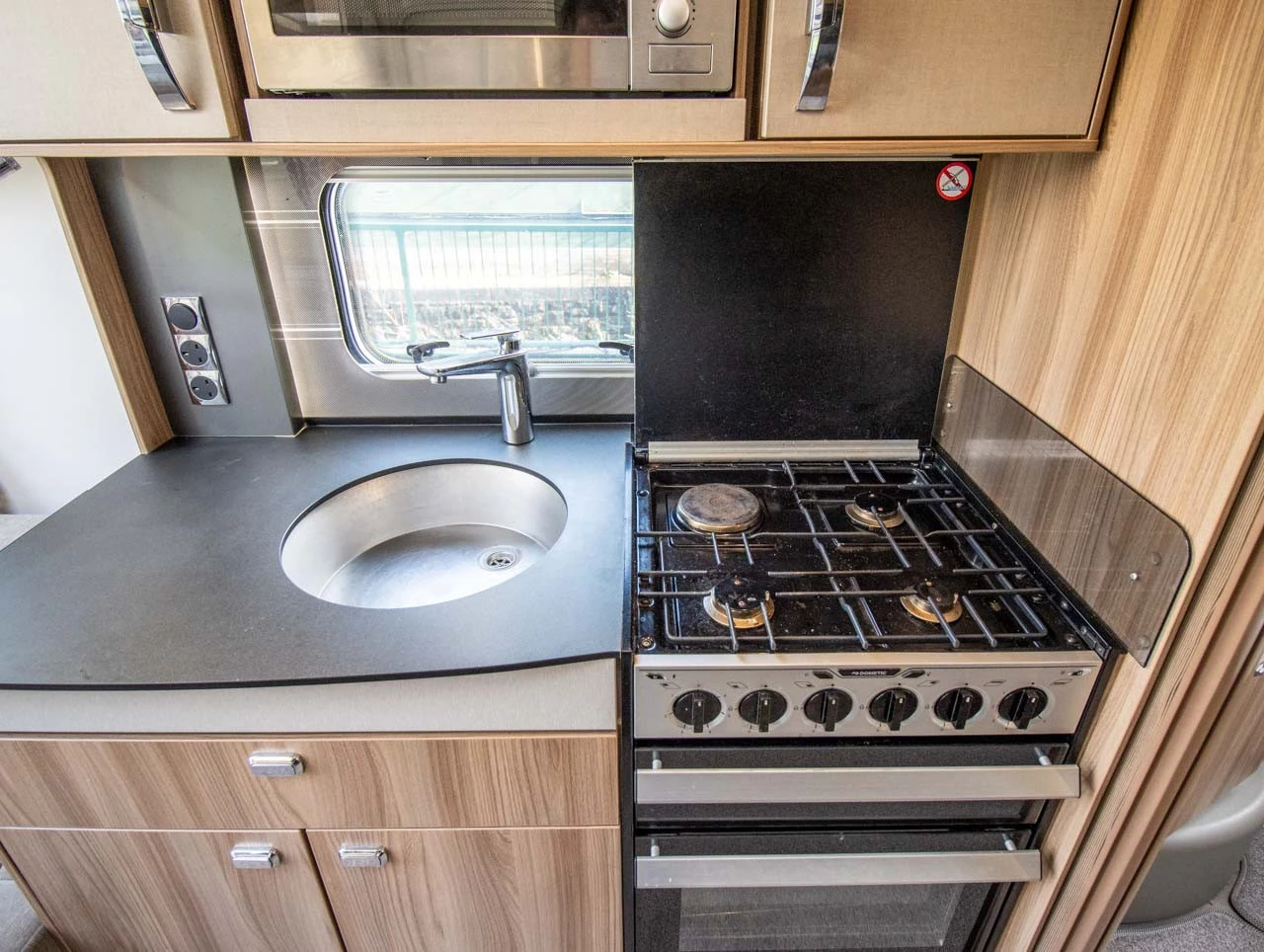 2018 Swift Conqueror 645 Well-Equipped Kitchen: The Swift Conqueror 645 boasts a well-equipped kitchen featuring an extractor fan, providing families with all the necessary amenities for cooking delicious meals on the go