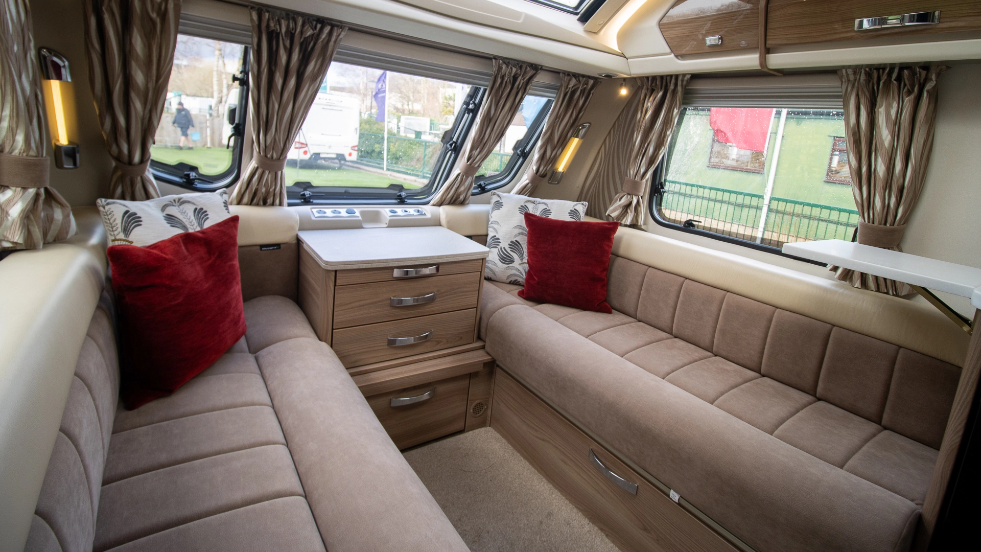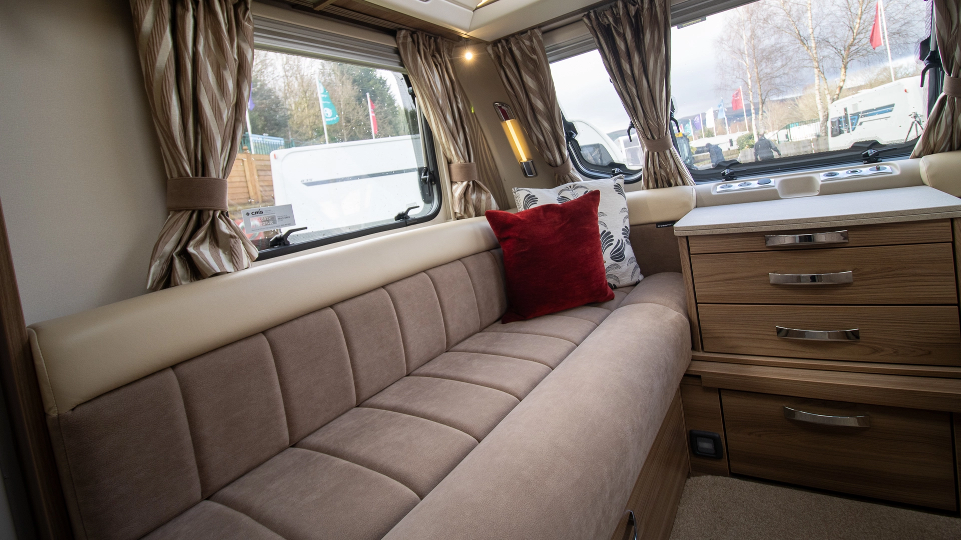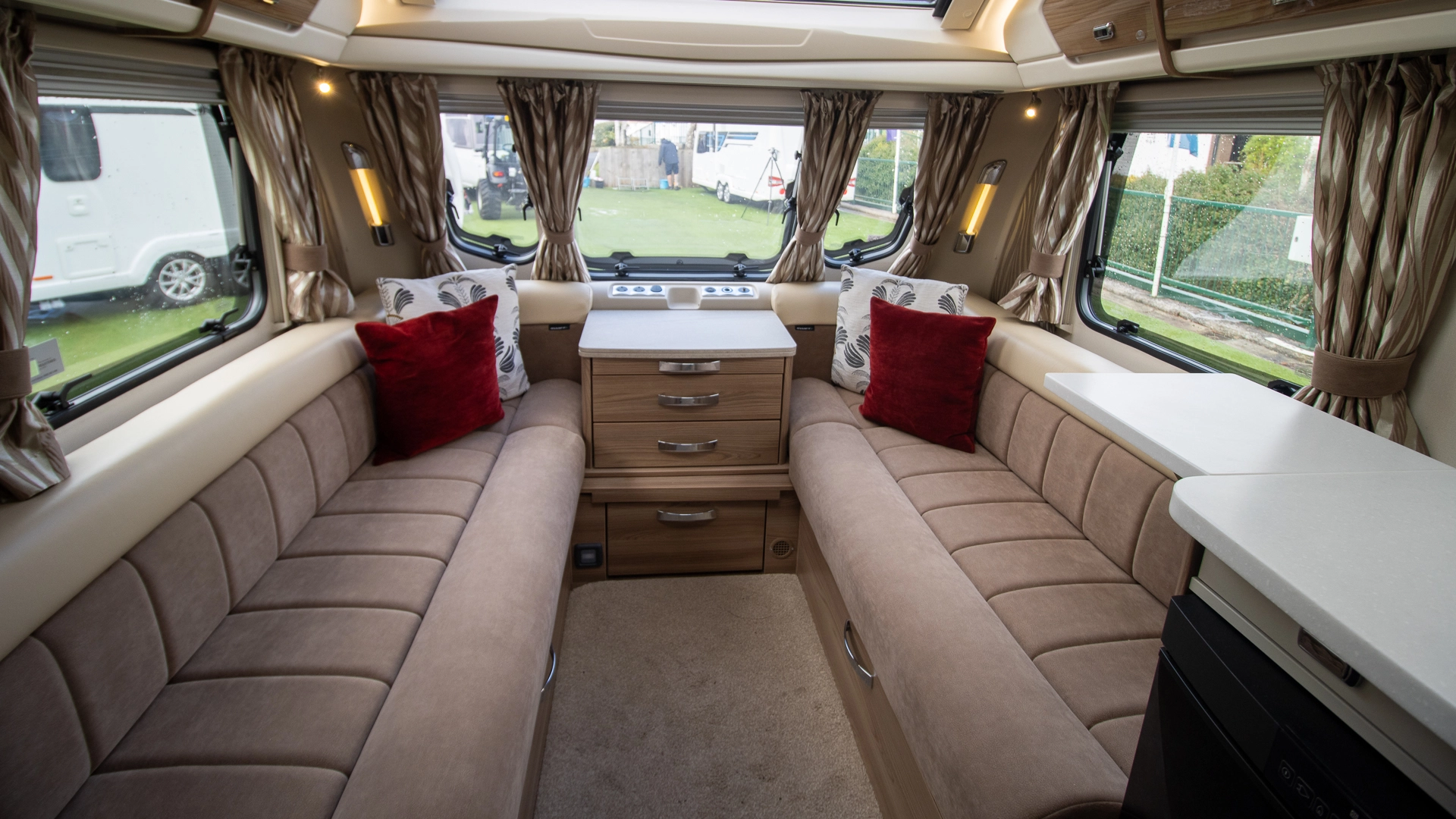 The front lounge features two long parallel sofas that create a bright and sociable space during the day. At night, these convert easily into a comfortable double bed, offering flexible sleeping arrangements without sacrificing your daytime living area.
