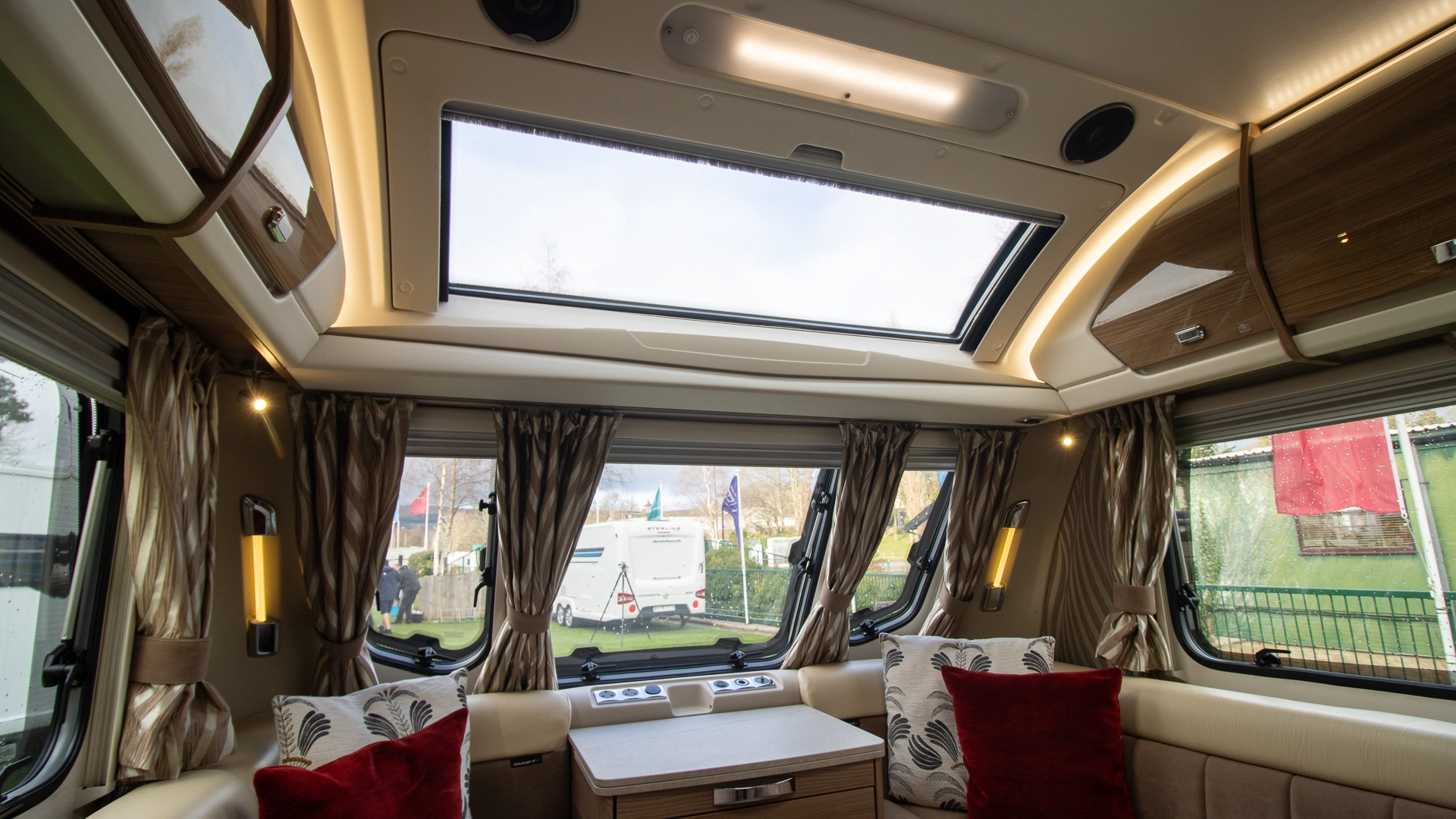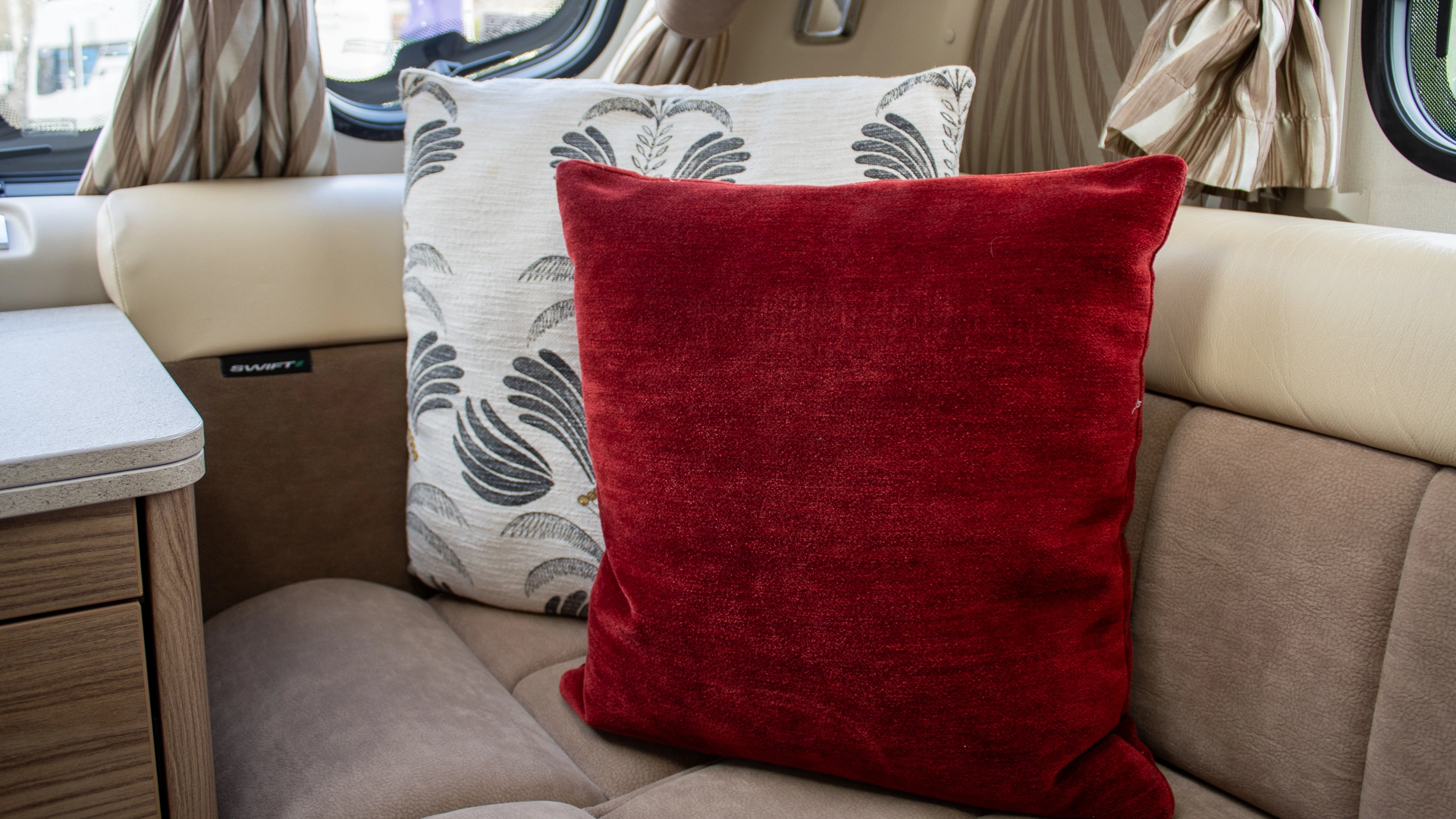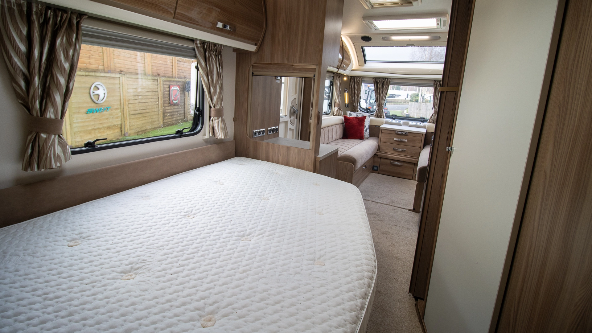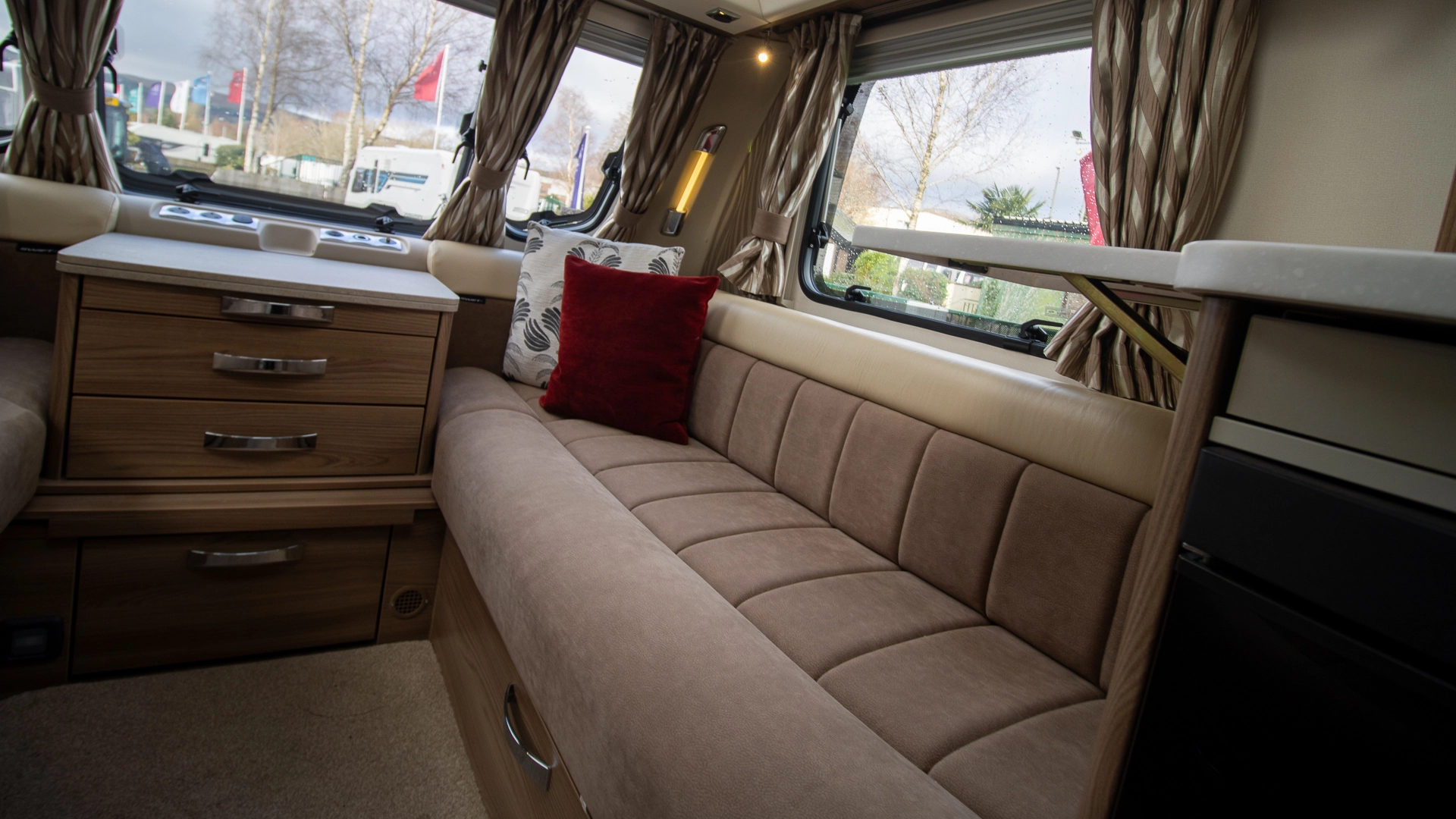 The front lounge features two long parallel sofas that create a bright and sociable space during the day. At night, these convert easily into a comfortable double bed, offering flexible sleeping arrangements without sacrificing your daytime living area.
