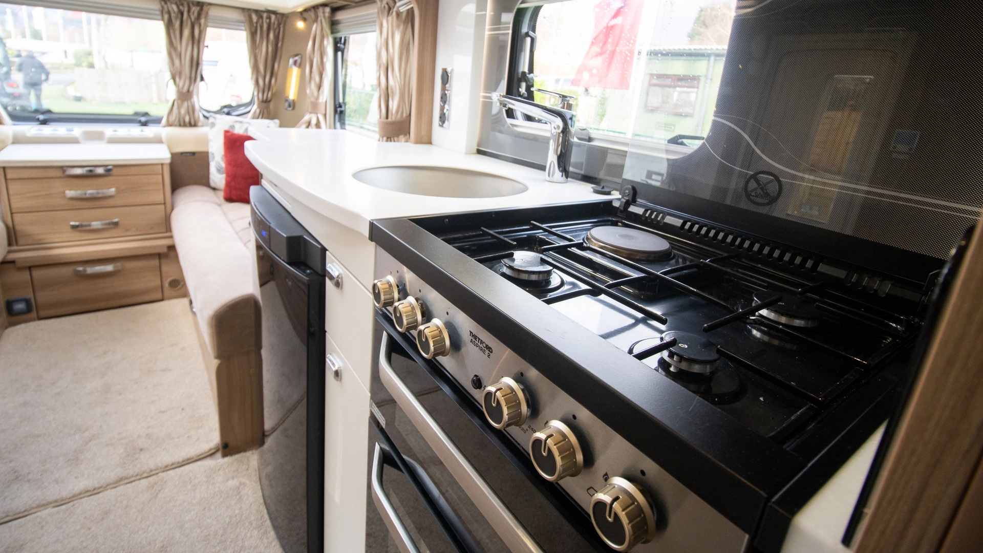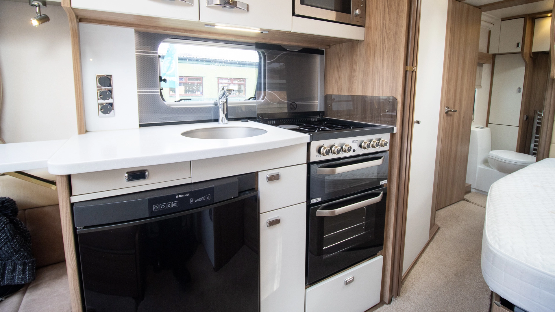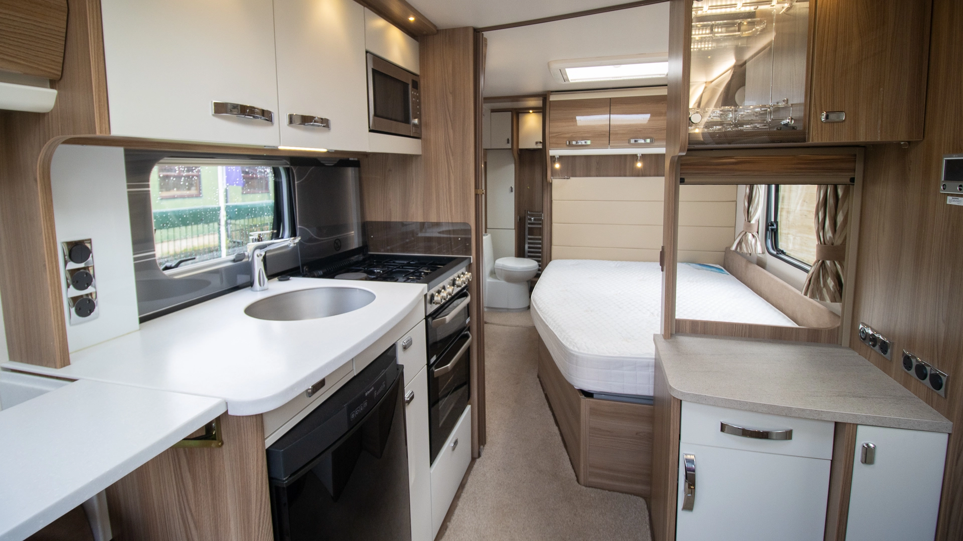 The kitchen comes complete with a microwave, hob, oven and grill, fridge‑freezer and plenty of worktop and storage space, allowing you to prepare full meals on the road.