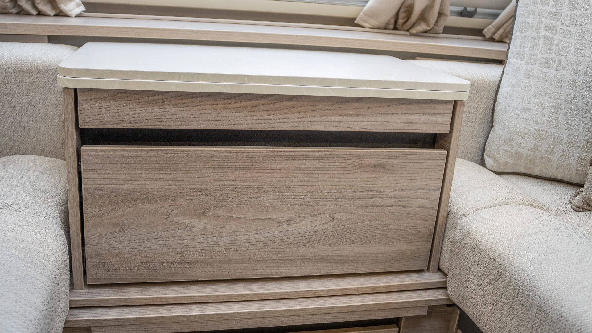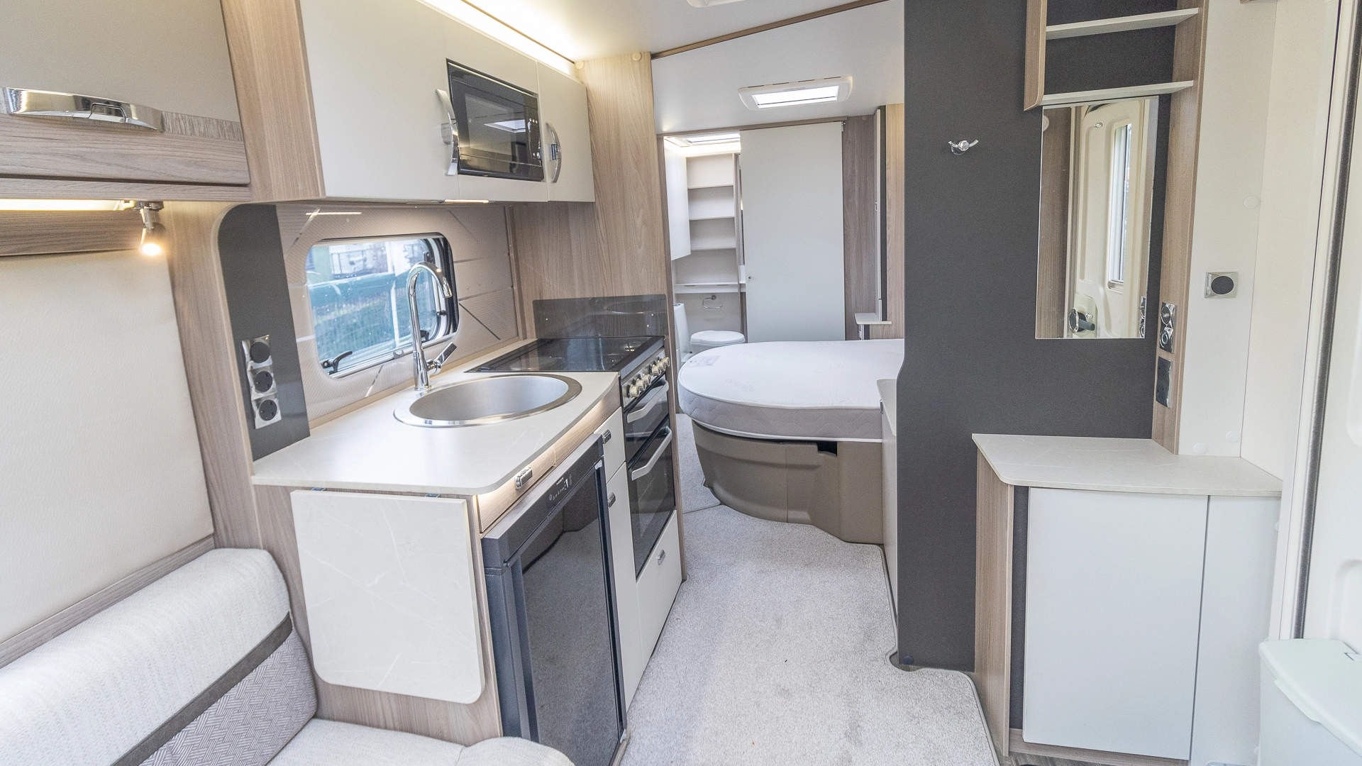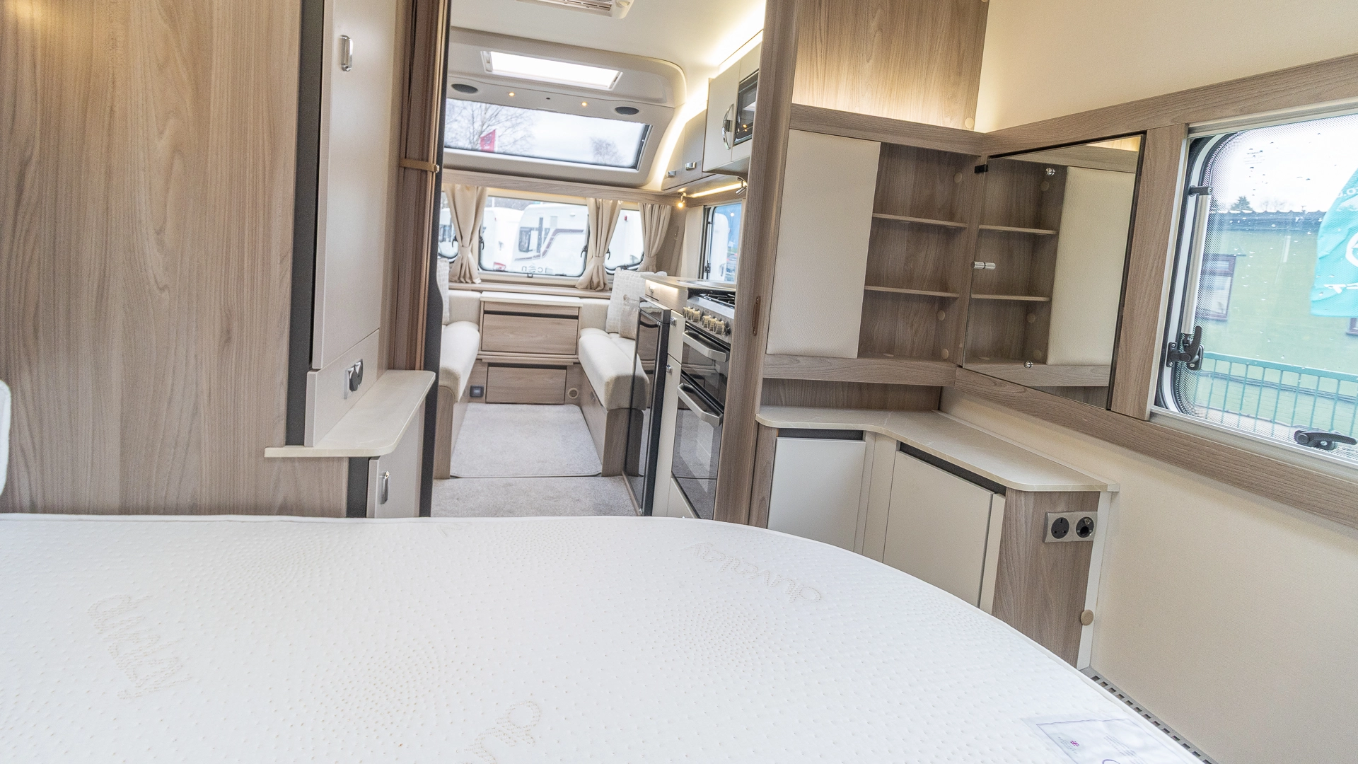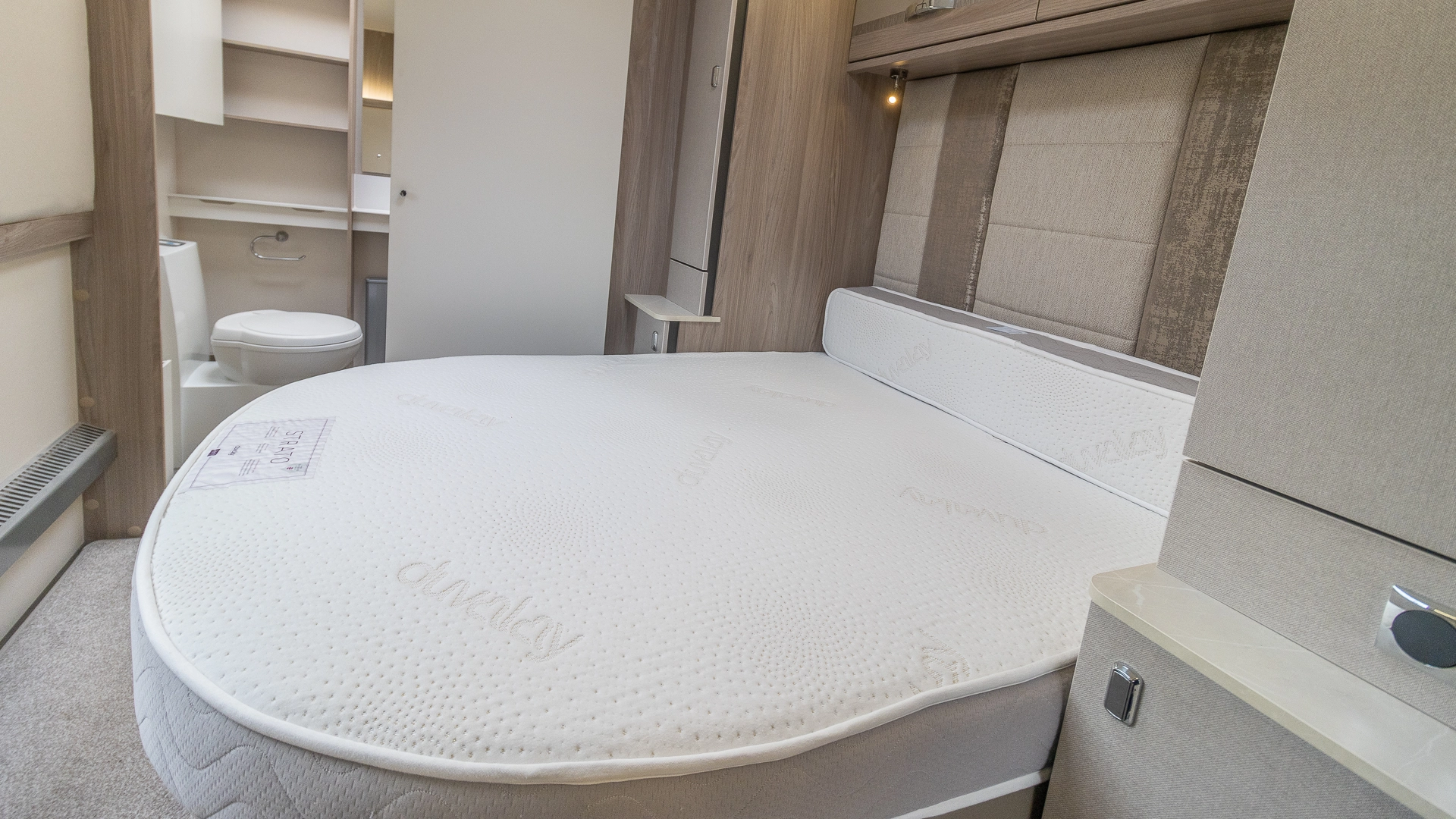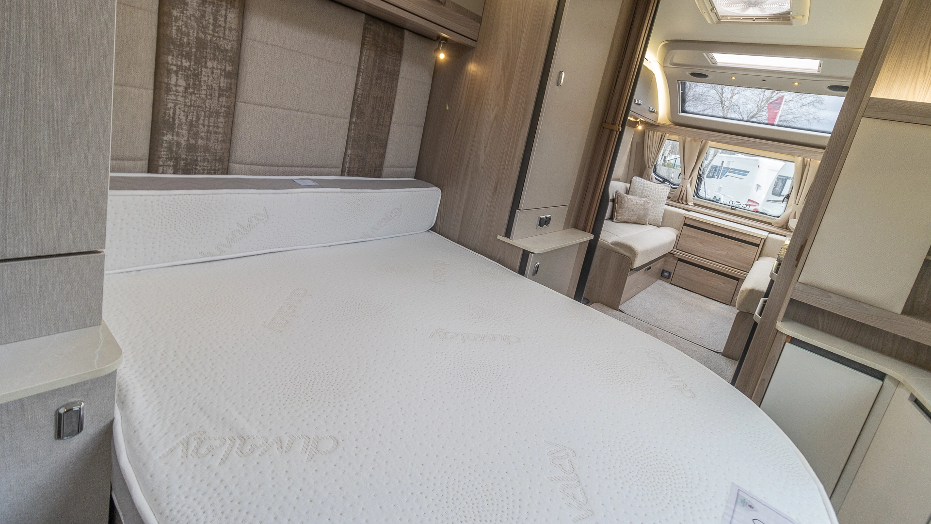 Requiring no nightly bed making, the fixed island bed provides a dedicated sleeping zone with walk‑around access and generous under‑bed storage.