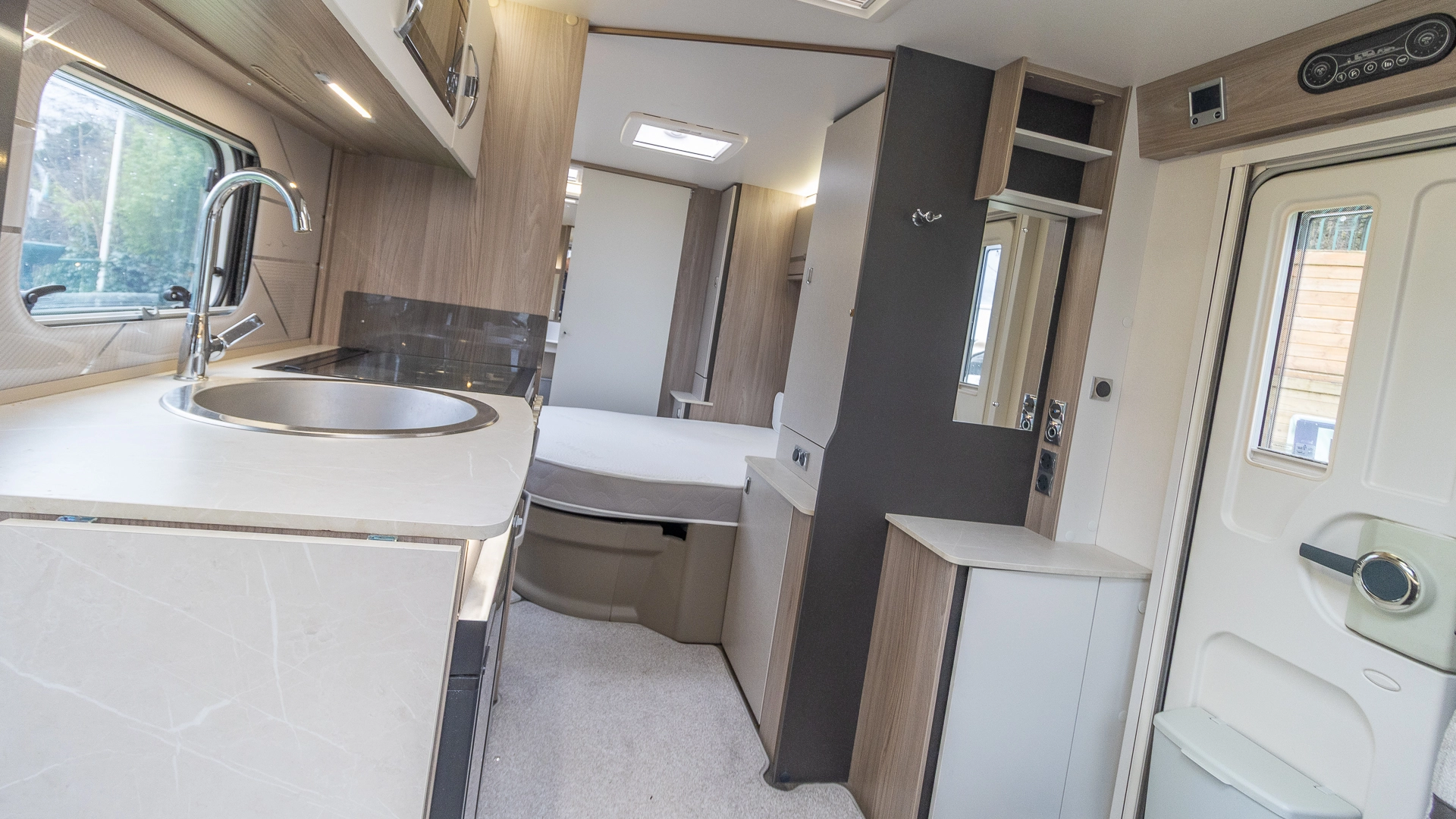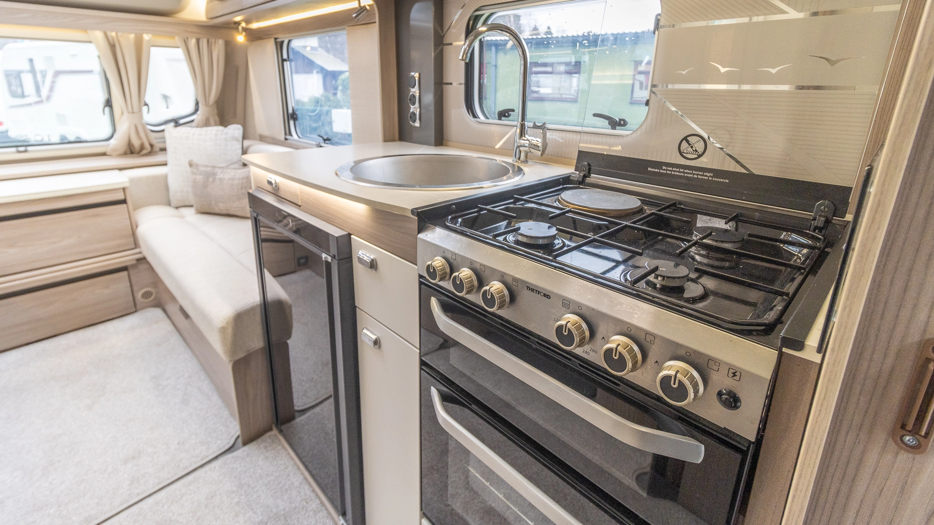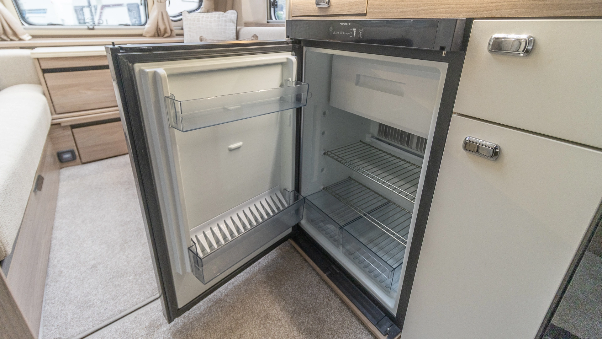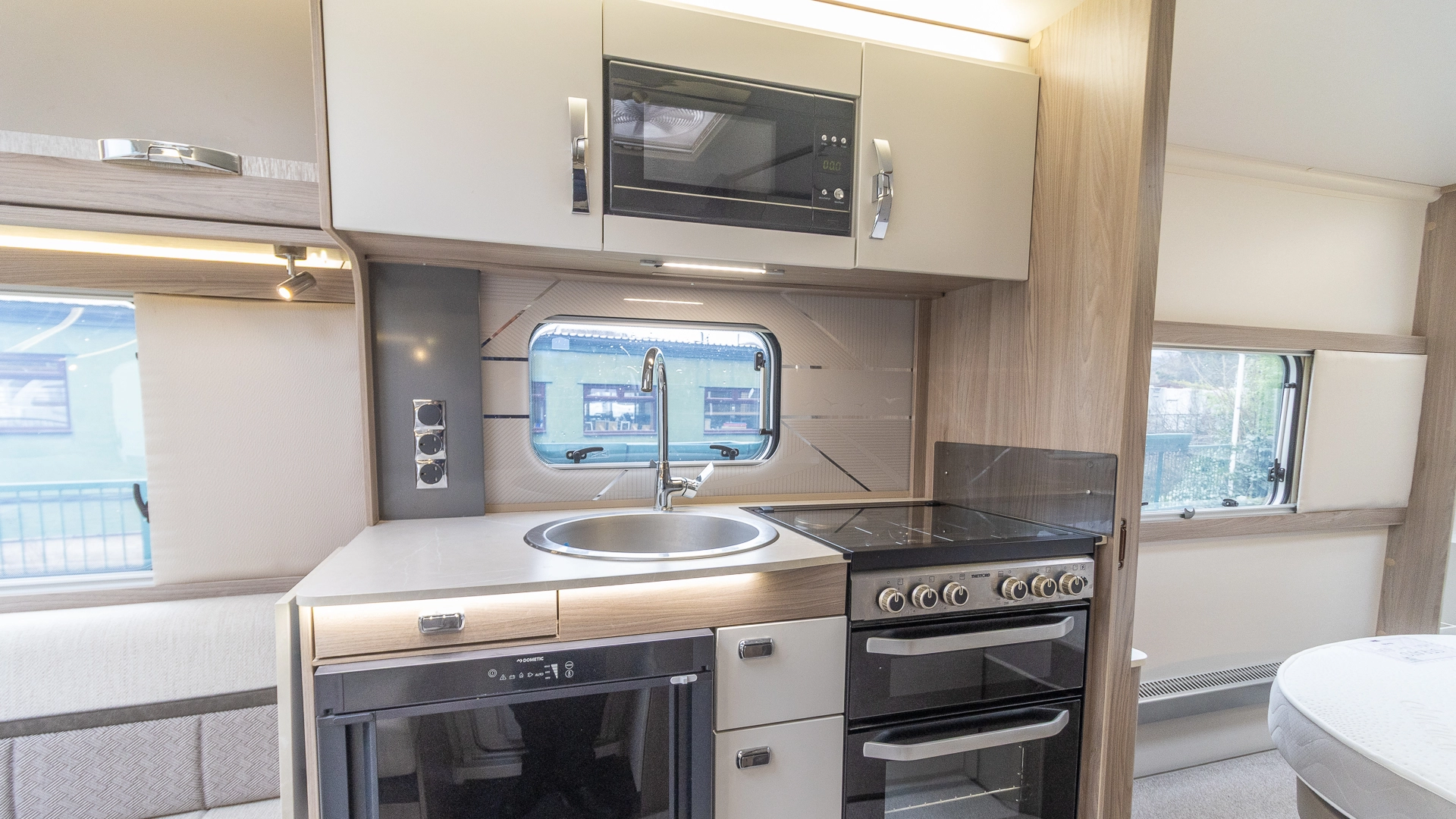 Fitted above the cooking area, the extractor fan maintains the caravan’s fresh atmosphere by efficiently removing cooking odours from the kitchen.