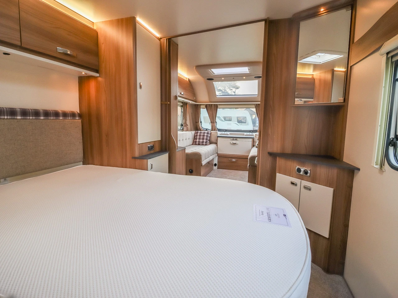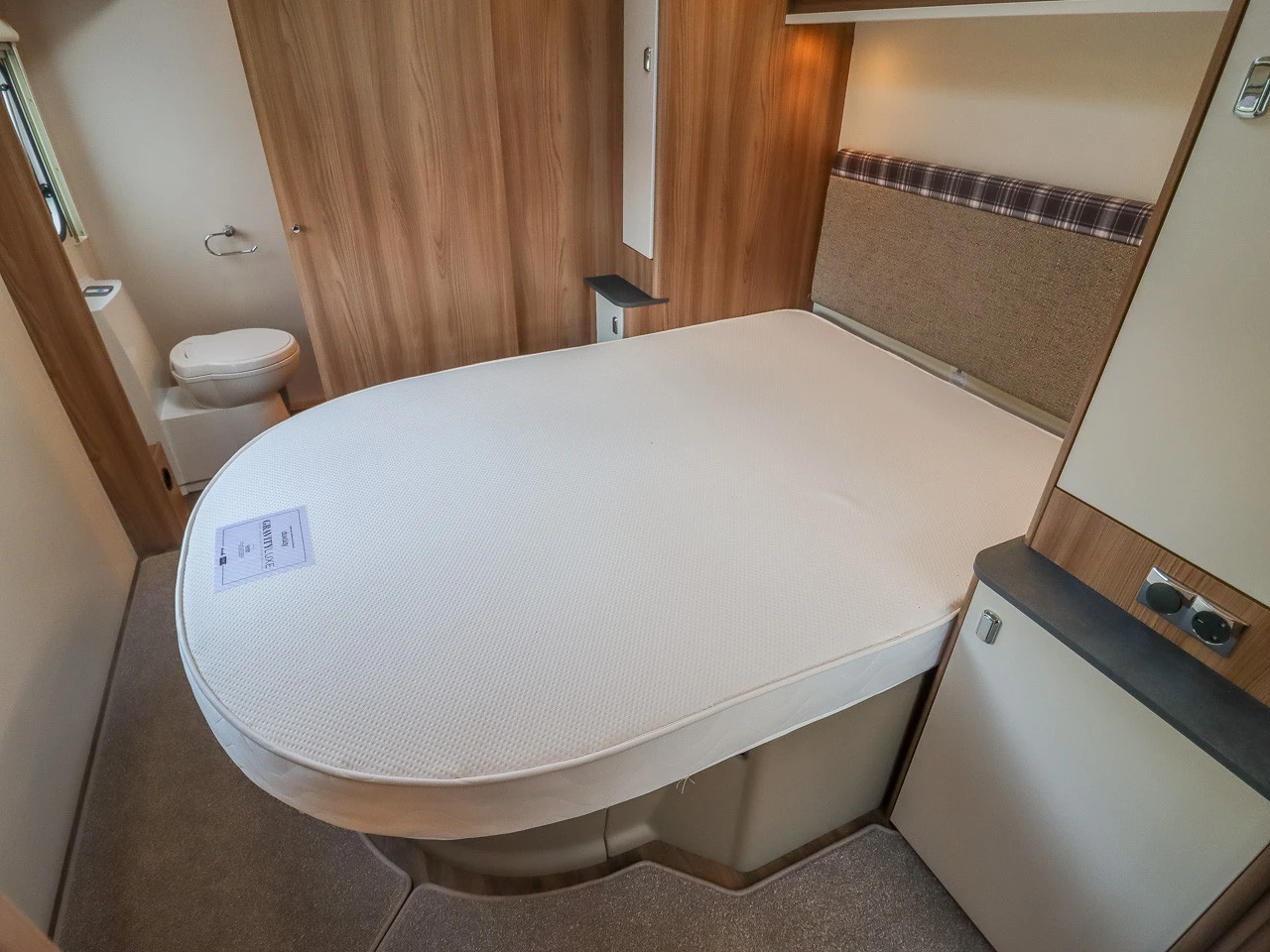 Requiring no nightly bed making, the fixed island bed provides a dedicated sleeping zone with walk‑around access and generous under‑bed storage.