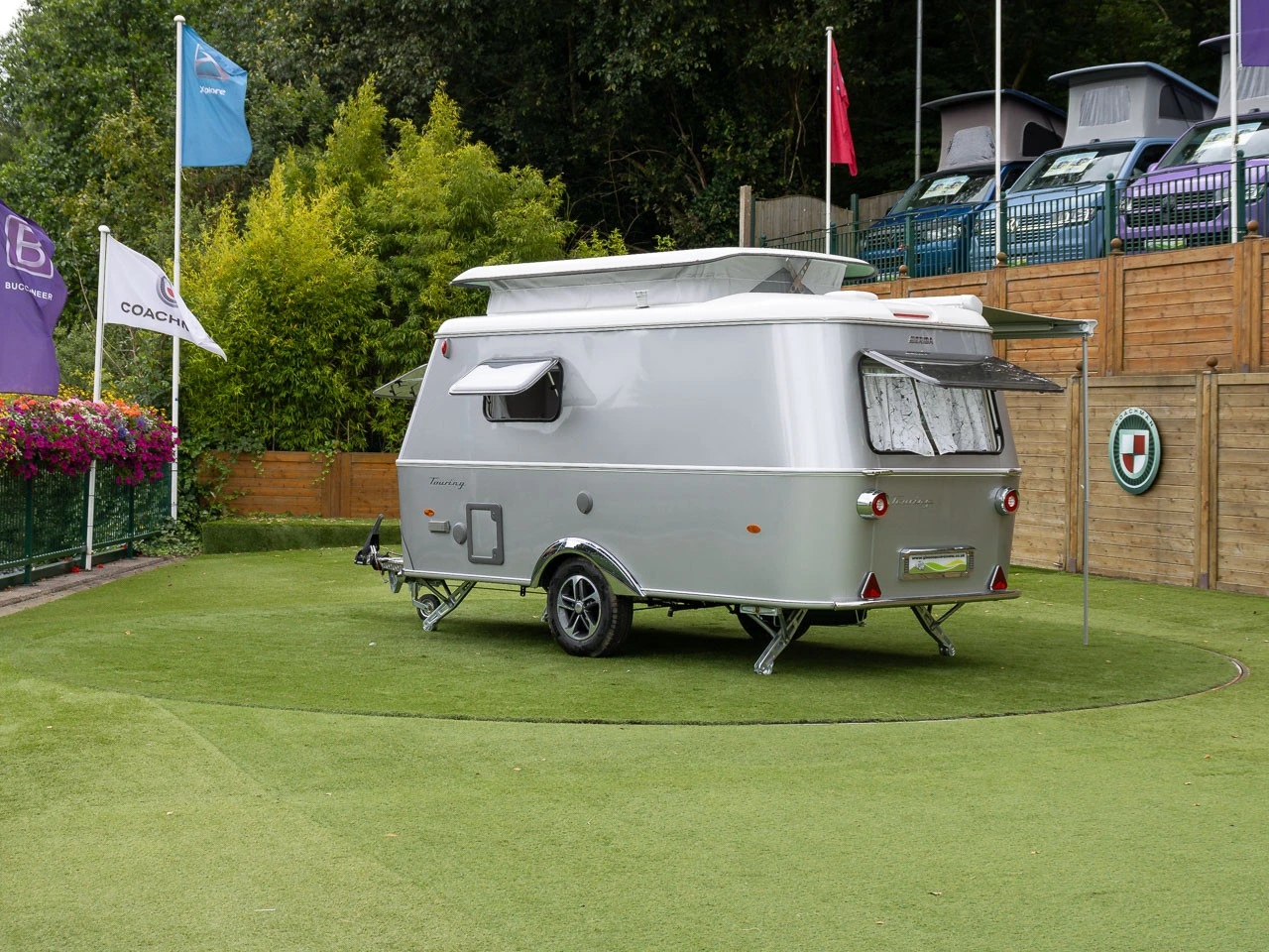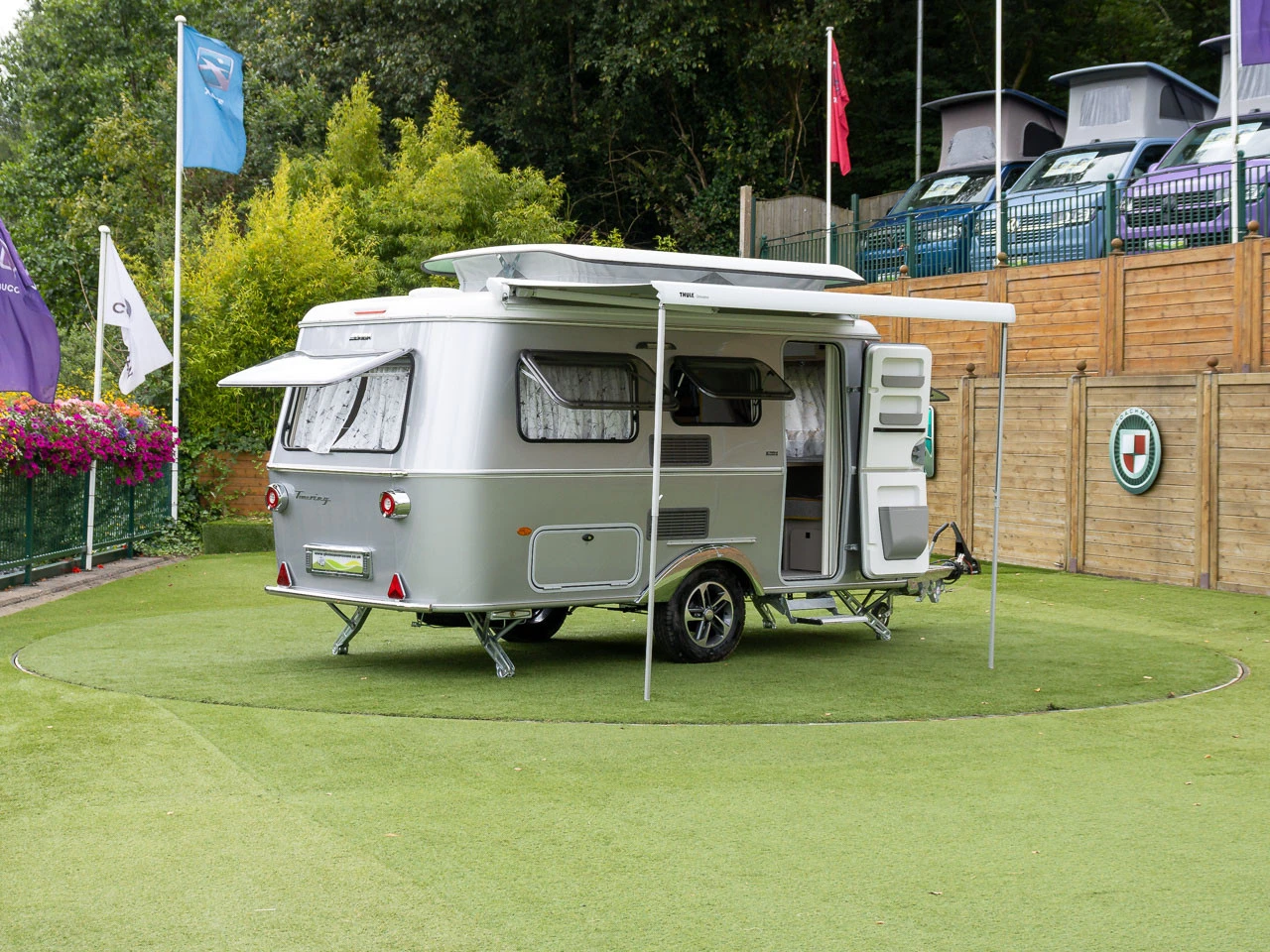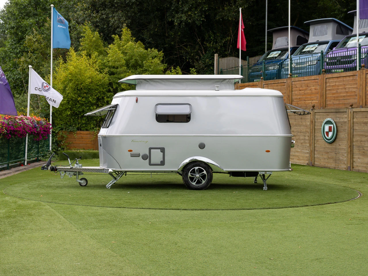 Retro Meets Luxury - Eriba Touring 430 Urban Eriba Touring 430 Urban (Crystal Silver) 2024 Urban Package: Includes exterior finish in White Silver/Crystal Silver | Ambient XL lights & 2 additional lights | 2 pillows with pillowcases | Furniture finish in Tindari | Fabric combination of Memphis/Tulsa/Orlando Design Package 1: Stone guard protection | Chrome package with chrome exterior components and chrome wheel arch as well as retro design rear lights | Alloy rims, ERIBA 5-star double spoke, anthracite | Stainless steel bumper Comfort Package: Includes sink cover w/ cutting board | Waste bin integrated in entrance door | Mosquito net door | Socket package (2 x 230 V sockets & 1 x Twin USB socket) | Makeup mirror | Comfort pleated blind Uprating to 1,300 kg Fabric Combination: Memphis for equipment line Urban Spare Wheel: On alloy rim incl
