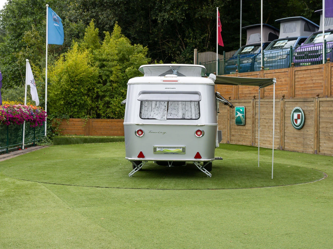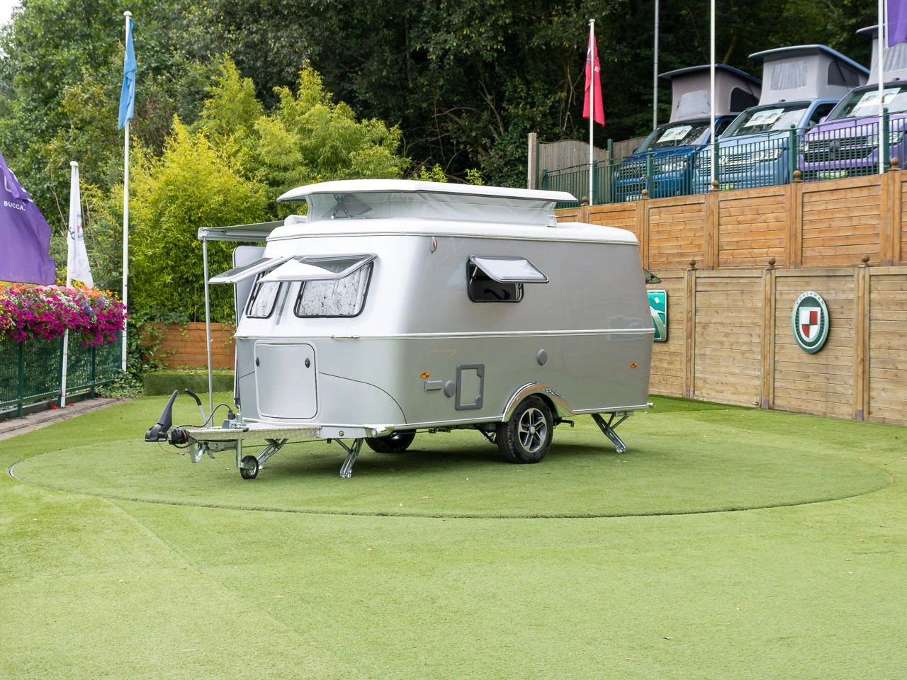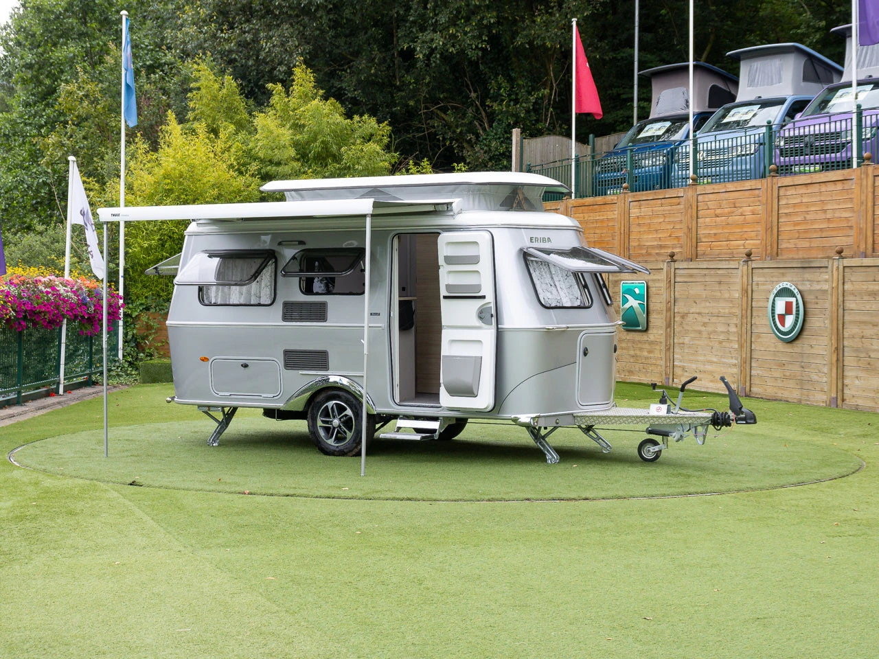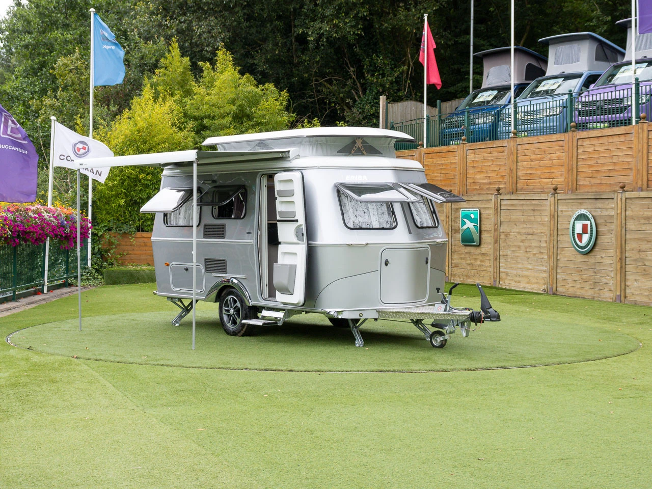 Retro Meets Luxury - Eriba Touring 430 Urban Eriba Touring 430 Urban (Crystal Silver) 2024 Urban Package: Includes exterior finish in White Silver/Crystal Silver | Ambient XL lights & 2 additional lights | 2 pillows with pillowcases | Furniture finish in Tindari | Fabric combination of Memphis/Tulsa/Orlando Design Package 1: Stone guard protection | Chrome package with chrome exterior components and chrome wheel arch as well as retro design rear lights | Alloy rims, ERIBA 5-star double spoke, anthracite | Stainless steel bumper Comfort Package: Includes sink cover w/ cutting board | Waste bin integrated in entrance door | Mosquito net door | Socket package (2 x 230 V sockets & 1 x Twin USB socket) | Makeup mirror | Comfort pleated blind Uprating to 1,300 kg Fabric Combination: Memphis for equipment line Urban Spare Wheel: On alloy rim incl