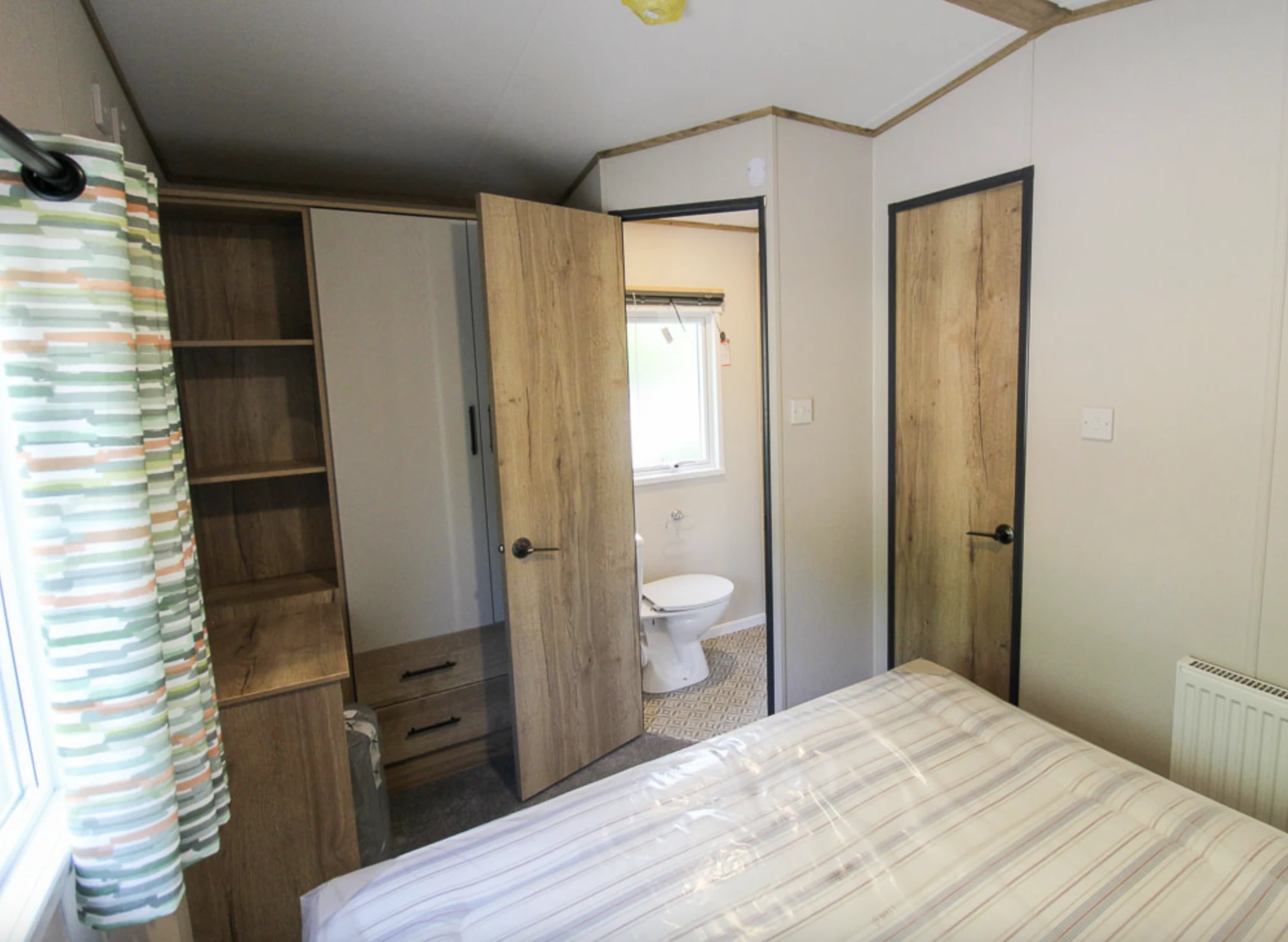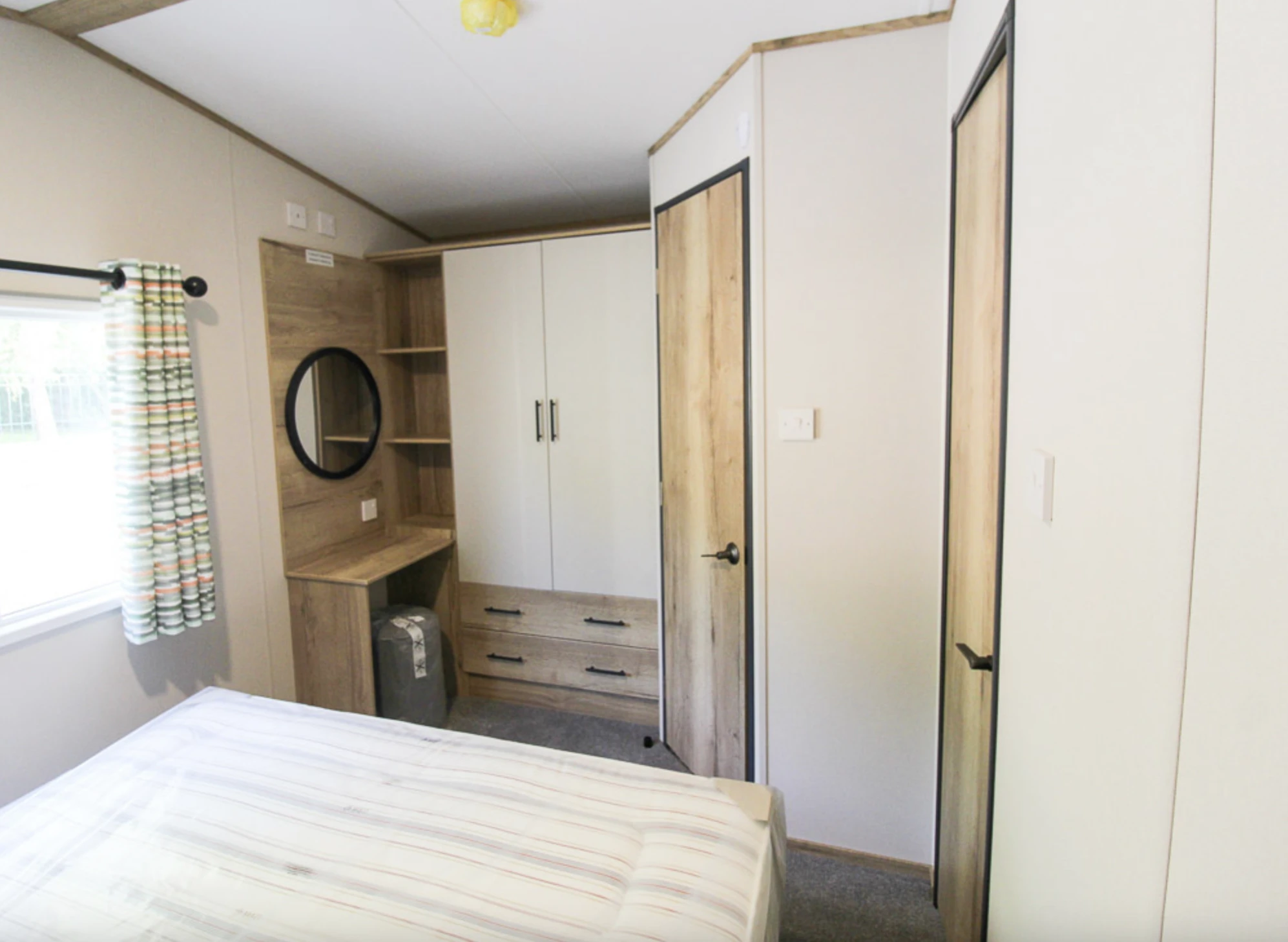 - A spacious master bedroom with a double bed featuring lift-up storage, a fitted wardrobe, dressing table, and a private en-suite bathroom.