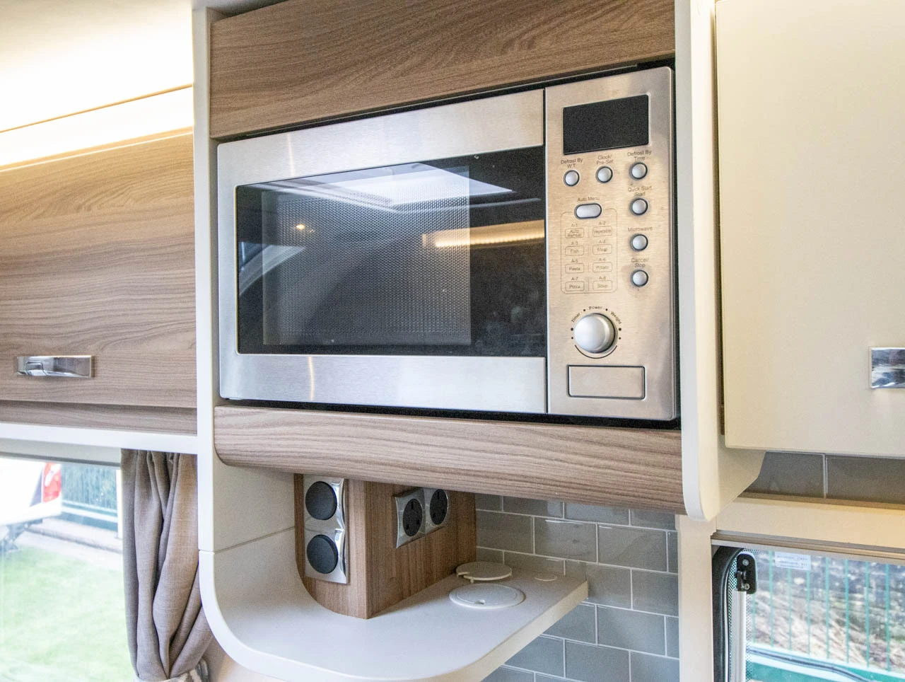 The spacious end washroom ensures privacy, while the well-appointed kitchen features a microwave, fridge, and oven—ideal for whipping up delicious meals on the go